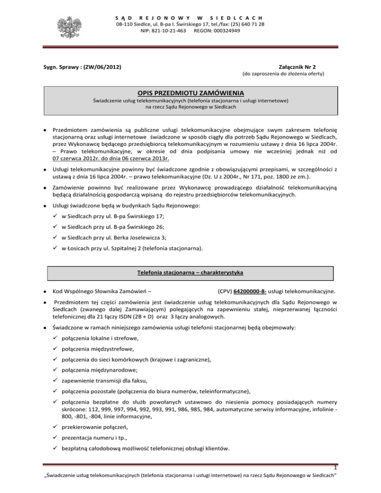 S Ą D R E J O N O W Y W S I E D L C A C H 08-110 Siedlce, ul. B-pa I. Świrskiego 17, tel./fax: (25) 640 71 28 NIP: 821-10-21-463 REGON: 000324949 Sygn. Sprawy : (ZW/06/2012) Załącznik Nr 2 (do zaproszenia do złożenia oferty) OPIS PRZEDMIOTU ZAMÓWIENIA Świadczenie usług telekomunikacyjnych (telefonia stacjonarna i usługi internetowe) na rzecz Sądu Rejonowego w Siedlcach Przedmiotem zamówienia są publiczne usługi telekomunikacyjne obejmujące swym zakresem telefonię stacjonarną oraz usługi internetowe świadczone w sposób ciągły dla potrzeb Sądu Rejonowego w Siedlcach, przez Wykonawcę będącego przedsiębiorcą telekomunikacyjnym w rozumieniu ustawy z dnia 16 lipca 2004r. – Prawo telekomunikacyjne, w okresie od dnia podpisania umowy nie wcześniej jednak niż od 07 czerwca 2012r. do dnia 06 czerwca 2013r. Usługi telekomunikacyjne powinny być świadczone zgodnie z obowiązującymi przepisami, w szczególności z ustawą z dnia 16 lipca 2004r. – prawo telekomunikacyjne (Dz. U z 2004r., Nr 171, poz. 1800 ze zm.). Zamówienie powinno być realizowane przez Wykonawcę prowadzącego działalność telekomunikacyjną będącą działalnością gospodarczą wpisaną do rejestru przedsiębiorców telekomunikacyjnych. Usługi świadczone będą w budynkach Sądu Rejonowego: w Siedlcach przy ul. B-pa Świrskiego 17; w Siedlcach przy ul. B-pa Świrskiego 26; w Siedlcach przy ul. Berka Joselewicza 3; w Łosicach przy ul. Szpitalnej 2 (telefonia stacjonarna). Telefonia stacjonarna – charakterystyka Kod Wspólnego Słownika Zamówień – (CPV) 64200000-8- usługi telekomunikacyjne. Przedmiotem tej części zamówienia jest świadczenie usług telekomunikacyjnych dla Sądu Rejonowego w Siedlcach (zwanego dalej Zamawiającym) polegających na zapewnieniu stałej, nieprzerwanej łączności telefonicznej dla 21 łączy ISDN (2B + D) oraz 3 łączy analogowych. Świadczone w ramach niniejszego zamówienia usługi telefonii stacjonarnej będą obejmowały: połączenia lokalne i strefowe, połączenia międzystrefowe, połączenia do sieci komórkowych (krajowe i zagraniczne), połączenia międzynarodowe; zapewnienie transmisji dla faksu, połączenia pozostałe (połączenia do biura numerów, teleinformatyczne), połączenia bezpłatne do służb powołanych ustawowo do niesienia pomocy posiadających numery skrócone: 112, 999, 997, 994, 992, 993, 991, 986, 985, 984, automatyczne serwisy informacyjne, infolinie 800, -801, -804, linie informacyjne, przekierowanie połączeń, prezentacja numeru i tp., bezpłatną całodobową możliwość telefonicznej obsługi klientów. 1 „Świadczenie usług telekomunikacyjnych (telefonia stacjonarna i usługi internetowe) na rzecz Sądu Rejonowego w Siedlcach” S Ą D R E J O N O W Y W S I E D L C A C H 08-110 Siedlce, ul. B-pa I. Świrskiego 17, tel./fax: (25) 640 71 28 NIP: 821-10-21-463 REGON: 000324949 Stan istniejący: Dotychczasowym operatorem świadczącym usługi telekomunikacyjne obejmujące swym zakresem telefonię stacjonarną na rzecz Sądu Rejonowego w Siedlcach jest Telekomunikacja Polska S.A z siedzibą w Warszawie przy ul. Twardej 18. Istniejące linie abonamentowe: Linie analogowe na których podłączony jest DSL 4 000 (1024 kbit/s) – adres i numer zakończenia sieci: budynek SR w Siedlcach przy ul. B-pa Świrskiego 17 : (25) 632-23-19 budynek SR w Siedlcach przy ul. B-pa Świrskiego 26: (25) 644-00-13 budynek SR w Siedlcach przy ul. Berka Joselewicza 3: (25) 633-10-47 Wykaz numerów telefonicznych w poszczególnych lokalizacjach Sądu Rejonowego w Siedlcach Budynek Sądu Rejonowego w Siedlcach Zamiejscowy Wydział Ksiąg Wieczystych z/s w Łosicach przy ul. Szpitalnej 2. 1. (83) 359-07-14 Budynek Sądu Rejonowego w Siedlcach przy ul. B-pa Świrskiego 17 2. (25) 632-21-93 3. (25) 632-22-42 4. (25) 632-23-27 5. (25) 632-28-82 6. (25) 632-59-84 - dodatkowy zakres numeracji MSN/DDI – (25) 632-59-64 7. (25) 632-63-67 - dodatkowy zakres numeracji MSN/DDI – (25) 640-71-24 8. (25) 632-60-73 9. (25) 633-96-81 10. (25) 644-77-02 - dodatkowy zakres numeracji MSN/DDI – (25) 640-71-28 11. (25) 632-52-34 12. (25) 632-52-37 13. (25) 632-52-38 14. (25) 6320-52-39 Budynek Sądu Rejonowego w Siedlcach przy ul. B-pa Świrskiego 26 15. (25) 632-61-08 - dodatkowy zakres numeracji MSN/DDI – (25) 632-61-80 16. (25) 632-71-71 17. (25) 633-03-51 18. (25) 633-09-61 19. (25) 644-45-39 2 „Świadczenie usług telekomunikacyjnych (telefonia stacjonarna i usługi internetowe) na rzecz Sądu Rejonowego w Siedlcach” S Ą D R E J O N O W Y W S I E D L C A C H 08-110 Siedlce, ul. B-pa I. Świrskiego 17, tel./fax: (25) 640 71 28 NIP: 821-10-21-463 REGON: 000324949 20. (25)644-96-84 - dodatkowy zakres numeracji MSN/DDI – (25) 640-71-23 Budynek Sądu Rejonowego w Siedlcach przy ul. Berka Joselewicza 3 21. (25) 633-10-41 Usługi internetowe - charakterystyka Kod Wspólnego Słownika Zamówień – (CPV) 72400000-4 usługi internetowe. Zakres przedmiotowy niniejszej części obejmuje świadczenie usług dostępu do sieci Internet w budynkach Sądu Rejonowego: w Siedlcach przy ul. B-pa Świrskiego 17 w Siedlcach przy ul. B-pa Świrskiego 26 w Siedlcach przy ul. Berka Joselewicza 3 Wykonawca zobowiązuje się zapewnić: stały nielimitowany dostęp do sieci Internet przez 24 godz. na dobę; łącze o przepustowości co najmniej 4096 kbit/s do komputera Klienta oraz minimum 1024 kbit/s od komputera Klienta; ciągłość działania łączy internetowych i brak limitów w ilości pobieranych i wysyłanych danych; urządzenia aktywne sieci niezbędne do zestawienia połączenia. Obecnie urządzenia aktywne sieci zainstalowane przez obecnego Wykonawcę TP S. A, to modemy podstawowe typu DSL bez funkcjonalności routingu. Rodzaj i parametry obecnych łączy internetowych: Lokalizacja Rodzaj i parametry obecnych łączy internetowych upload Budynek SR w Siedlcach ul B-pa Świrskiego 17 DSL tp 4000 dodatkowy upload 1024 DSL Budynek SR w Siedlcach ul