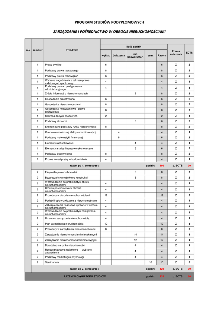 PROGRAM STUDIÓW PODYPLOMOWYCH ZARZĄDZANIE I POŚREDNICTWO W OBROCIE NIERUCHOMOŚCIAMI ilość godzin rok semestr Przedmiot wykład ćw. konwersator. sem. Forma zaliczenia ECTS Razem 1 Prawo cywilne 6 6 Z 2 1 Podstawy prawa rzeczowego 8 8 Z 2 1 Podstawy prawa zobowiązań 6 6 Z 2 4 4 Z 1 4 4 Z 1 1 1 I ćwiczenia Wybrane zagadnienia z zakresu prawa rodzinnego i spadkowego Podstawy prawa i postępowania administracyjnego 1 Źródła informacji o nieruchomościach 8 Z 2 1 Gospodarka przestrzenna 6 6 Z 2 1 Gospodarka nieruchomościami 8 8 Z 2 1 Gospodarka mieszkaniowa i prawo spółdzielcze 8 8 Z 2 1 Ochrona danych osobowych 2 2 Z 1 1 Podstawy ekonomii 6 Z 2 1 Ekonomiczne podstawy rynku nieruchomości 8 Z 2 1 Ocena ekonomicznej efektywności inwestycji 4 4 Z 1 1 Podstawy matematyki finansowej 6 6 Z 2 1 Elementy rachunkowości 4 4 Z 1 1 Elementy analizy finansowo-ekonomicznej 6 6 Z 2 1 Podstawy budownictwa 8 8 Z 2 1 Proces inwestycyjny w budownictwie 4 4 Z 1 8 6 8 razem po 1. semestrze : godzin: 106 p. ECTS: 30 2 Eksploatacja nieruchomości 8 8 Z 2 2 Bezpieczeństwo użytkowe konstrukcji 8 8 Z 2 4 4 Z 1 4 4 Z 1 2 2 Wprowadzenie do problematyki obrotu nieruchomościami Umowa pośrednictwa w obrocie nieruchomościami 2 Procedury w obrocie nieruchomościami 12 12 Z 3 2 Podatki i opłaty związane z nieruchomościami 4 4 Z 1 4 4 Z 1 4 4 Z 1 2 I 2 Zabezpieczenia finansowe i prawne w obrocie nieruchomościami Wprowadzenie do problematyki zarządzania nieruchomościami 2 Umowa o zarządzanie nieruchomością 4 4 Z 1 2 Plan zarządzania nieruchomością 12 12 Z 3 2 Procedury w zarządzaniu nieruchomościami 8 8 Z 2 2 Zarządzanie nieruchomościami mieszkalnymi 14 14 Z 3 2 Zarządzanie nieruchomościami komercyjnymi 12 12 Z 3 2 Doradztwo na rynku nieruchomości 4 4 Z 1 2 Rzeczoznawstwo majątkowe — wybrane zagadnienia 4 4 Z 1 2 Podstawy marketingu i psychologii 4 2 Seminarium 4 Z 1 10 10 Z 3 razem po 2. semestrze : godzin: 120 p. ECTS: 30 RAZEM W CIĄGU TOKU STUDIÓW godzin: 226 p. ECTS: 60
