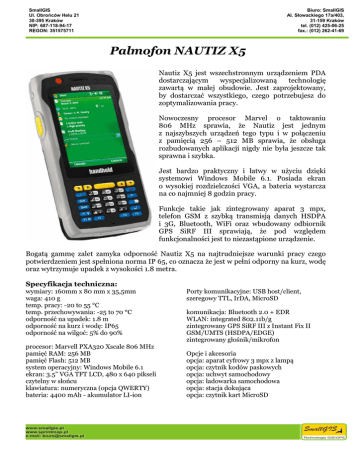 SmallGIS Ul. Obrońców Helu 21 30-395 Kraków NIP: 687-118-94-17 REGON: 351575711 Biuro: SmallGIS Al. Słowackiego 17a/403, 31-159 Kraków tel. (012) 425-06-25 fax.: (012) 262-41-69 Palmofon NAUTIZ X5 Nautiz X5 jest wszechstronnym urządzeniem PDA dostarczającym wyspecjalizowaną technologię zawartą w małej obudowie. Jest zaprojektowany, by dostarczać wszystkiego, czego potrzebujesz do zoptymalizowania pracy. Nowoczesny procesor Marvel o taktowaniu 806 MHz sprawia, że Nautiz jest jednym z najszybszych urządzeń tego typu i w połączeniu z pamięcią 256 – 512 MB sprawia, że obsługa rozbudowanych aplikacji nigdy nie była jeszcze tak sprawna i szybka. Jest bardzo praktyczny i łatwy w użyciu dzięki systemowi Windows Mobile 6.1. Posiada ekran o wysokiej rozdzielczości VGA, a bateria wystarcza na co najmniej 8 godzin pracy. Funkcje takie jak zintegrowany aparat 3 mpx, telefon GSM z szybką transmisją danych HSDPA i 3G, Bluetooth, WiFi oraz wbudowany odbiornik GPS SiRF III sprawiają, że pod względem funkcjonalności jest to niezastąpione urządzenie. Bogatą gammę zalet zamyka odporność Nautiz X5 na najtrudniejsze warunki pracy czego potwierdzeniem jest spełniona norma IP 65, co oznacza że jest w pełni odporny na kurz, wodę oraz wytrzymuje upadek z wysokości 1.8 metra. Specyfikacja techniczna: wymiary: 160mm x 80 mm x 35,5mm waga: 410 g temp. pracy: -20 to 55 °C temp. przechowywania: -25 to 70 °C odporność na upadek: 1.8 m odporność na kurz i wodę: IP65 odporność na wilgoć: 5% do 90% procesor: Marvell PXA320 Xscale 806 MHz pamięć RAM: 256 MB pamięć Flash: 512 MB system operacyjny: Windows Mobile 6.1 ekran: 3.5” VGA TFT LCD, 480 x 640 pikseli czytelny w słońcu klawiatura: numeryczna (opcja QWERTY) bateria: 4400 mAh - akumulator LI-ion Porty komunikacyjne: USB host/client, szeregowy TTL, IrDA, MicroSD komunikacja: Bluetooth 2.0 + EDR WLAN: integrated 802.11b/g zintegrowany GPS SiRF III z Instant Fix II GSM/UMTS (HSDPA/EDGE) zintegrowany głośnik/mikrofon Opcje i akcesoria opcja: aparat cyfrowy 3 mpx z lampą opcja: czytnik kodów paskowych opcja: uchwyt samochodowy opcja: ładowarka samochodowa opcja: stacja dokująca opcja: czytnik kart MicroSD
