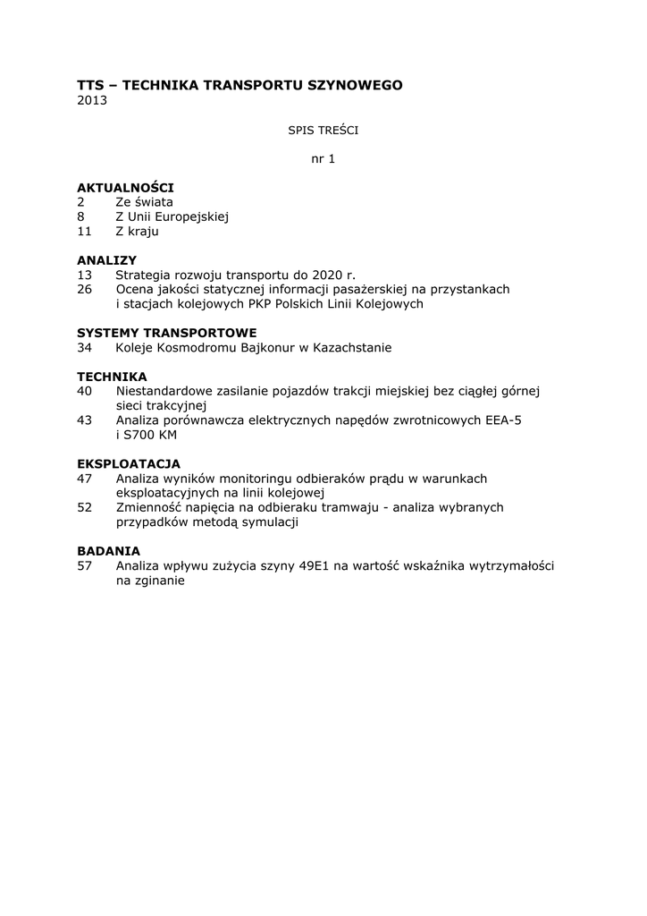 TTS – TECHNIKA TRANSPORTU SZYNOWEGO 2013 SPIS TREŚCI nr 1 AKTUALNOŚCI 2 Ze świata 8 Z Unii Europejskiej 11 Z kraju ANALIZY 13 Strategia rozwoju transportu do 2020 r. 26 Ocena jakości statycznej informacji pasażerskiej na przystankach i stacjach kolejowych PKP Polskich Linii Kolejowych SYSTEMY TRANSPORTOWE 34 Koleje Kosmodromu Bajkonur w Kazachstanie TECHNIKA 40 Niestandardowe zasilanie pojazdów trakcji miejskiej bez ciągłej górnej sieci trakcyjnej 43 Analiza porównawcza elektrycznych napędów zwrotnicowych EEA-5 i S700 KM EKSPLOATACJA 47 Analiza wyników monitoringu odbieraków prądu w warunkach eksploatacyjnych na linii kolejowej 52 Zmienność napięcia na odbieraku tramwaju - analiza wybranych przypadków metodą symulacji BADANIA 57 Analiza wpływu zużycia szyny 49E1 na wartość wskaźnika wytrzymałości na zginanie nr 2/3 ANALIZY 2 Czy "Koleje dużych prędkości"? 4 Zagadnienia ochrony środowiska w procesach inwestycyjnych 11 Kierunki działań po katastrofie kolejowej pod Szczekocinami 18 Ewolucja potencjalnych skutków niepełnego wykonania zakresu robót torowych SYSTEMY TRANSPORTOWE 23 Wybrane problemy modernizacji terminali intermodalnych na przykładzie terminala w Kątach Wrocławskich TECHNIKA 28 Obecne i przyszłościowe systemy sterowania ruchem kolejowym 36 Nowoczesne technologie modernizacji kolejowych obiektów inżynieryjnych 43 Ciągłe pomiary satelitarne układu linii tramwajowych w Gdańsku 48 Ocena poziomu jakości geometrii toru kolejowego 52 Pomiar wymuszonych przemieszczeń toru z wykorzystaniem algorytmu analizy obrazu 56 Projektowanie systemów rozrządzania grawitacyjnego na stacjach zakładowych EKSPLOATACJA 58 Oszczędności wynikające ze smarowania obrzeży kół w łukach o różnym promieniu 61 Analiza czynników wpływających na powstawanie wybranych wad w szynach kolejowych 65 Wybrane zagadnienia diagnostyki wizyjnej toru kolejowego 71 Skalowanie zagrożeń wyboczeń torów kolejowych 77 Utrzymanie nawierzchni na liniach dużych prędkości jako element ryzyka w procesie eksploatacji 81 Ocena efektów regulacji osi toru na wybranej linii kolejowej 85 Obciążenie i zużycie rozjazdów kolejowych w warunkach eksploatacyjnych oraz materiały stosowane do ich budowy BADANIA 90 Badanie wpływu zastosowania mat wibroizolacyjnych w konstrukcji toru kolejowego na poziom drgań emitowanych do otoczenia nr 4 AKTUALNOŚCI 2 Ze Świata 9 Z Unii Europejskiej 12 Z kraju OFERTY 14 Technologia Crash - polska myśl techniczna w służbie bezpieczeństwa przewozów kolejowych ANALIZY 16 Problemy metodyczne kalkulacji stawek dostępu do infrastruktury kolejowej SYSTEMY TRANSPORTOWE 25 Kolej Gazpromu na Półwyspie Jamalskim 32 Tramwaje w Królewcu TECHNIKA 40 Przestawne sieci trakcyjne - elastyczne i sztywne EKSPLOATACJA 42 Napięcie sieci trakcyjnej jako wyznacznik możliwości zwiększenia odzysku energii BADANIA 47 Innowacyjne badania podtorza kolejowego 52 Stochastyczny model podsypki w analizie drgań toru kolejowego 55 Naprężenia w podtorzu od układu powierzchni obciążających SITK 60 Nowy prezes i sekretarz generalny Stowarzyszenia Inżynierów i Techników Komunikacji RP nr 5 AKTUALNOŚCI 2 Ze Świata 6 Z Unii Europejskiej 8 Z kraju ANALIZY 9 Zmiany regulacji unijnego rynku transportu kolejowego ujęte w propozycjach czwartego pakietu kolejowego 16 Międzynarodowe Targi Kolejowe TRAKO TECHNIKA 20 Nowy tabor kolei litewskich EKSPLOATACJA 30 Spalinowe zespoły trakcyjne serii MR + MRD i Y 34 Analiza efektywności filtrów wygładzających w podstacjach trakcji kolejowej 3 kV dc przy zaburzeniach napięcia zasilającego BADANIA 40 Finalna ocena efektywności metody szeregów czasowych w badaniach kolejowych podstacji trakcyjnych 45 Identyfikacja kolejowych łańcuchów dostaw węgla PRAWO I FINANSE 50 Wpływ stawki godzinowej na wielkość kosztów wynagrodzeń i wysokość kosztów pośrednich w projektach realizowanych w ramach 7. Programu Ramowego przez instytuty badawcze nr 6 AKTUALNOŚCI 2 Ze świata 7 Z Unii Europejskiej 9 Z kraju SYSTEMY TRANSPORTOWE 11 Linie i pociągi dużych prędkości w Hiszpanii TECHNIKA 35 Właściwości eksploatacyjne urządzeń SHP i systemów ATP bezpiecznego prowadzenia pociągu EKSPLOATACJA 40 Próbna eksploatacja zasobnika superkondensatorowego w gdyńskiej sieci trolejbusowej BADANIA 45 Wstępna ocena termicznych warunków pracy zespołów prostownikowych dla drugiej linii Metra w Warszawie nr 7/8 AKTUALNOŚCI 2 Ze Świata 4 Z Unii Europejskiej 6 Z kraju ANALIZY 8 Rozwój komunikacji tramwajowej w Polsce 36 Genewskie rozmowy o przyszłości lokalnego transportu zbiorowego OFERTY 46 Nevelo N126 z Nowego Sącza 50 Moderus BETA MF02AC nowoczesny tramwaj za rozsądną cenę 52 Rodzina nowych nawrotników tramwajowych typu NHM - wyniki eksploatacji (2) PRAWO I FINANSE 54 Wsparcie rozwoju trakcji elektrycznej w komunikacji miejskiej z funduszy Unii Europejskiej (1) SYSTEMY TRANSPORTOWE 68 Tramwaje w Jerozolimie TECHNIKA 72 Co nowego na miejskich torach? EKSPLOATACJA 81 Ocena ryzyka operacyjnego w transporcie szynowym - tramwaje nr 9 AKTUALNOŚCI 2 Ze Świata 5 Z Unii Europejskiej 7 Z kraju ANALIZY 9 Infrastruktura transportu w koncepcji zagospodarowania przestrzennego kraju TECHNIKA 19 Bezpieczeństwo bierne w komunikacji tramwajowej 20 Elektryczne pociągi zespołowe ETR610 serii ED250 dla PKP Intercity S.A. 25 Tak, technologia ErgoCradle™ już z nami 26 Szybkie pociągi na sieci kolei ukraińskich 29 Zderzaki kolejowe - wymagania, projektowanie, badania. Część 1. Podział zderzaków kolejowych 36 Perspektywa wykorzystania napędu alternatywnego w lubelskiej komunikacji trolejbusowej (1) SYSTEMY TRANSPORTOWE 39 Połączenie Łodzi i Kielc jako element krajowej sieci kolejowej - stan obecny i perspektywy rozwoju EKSPLOATACJA 45 Stan bezpieczeństwa na kolei w Unii Europejskiej 2013 PRAWO I FINANSE 56 Zarządzanie ryzykiem w transporcie kolejowym nr 10 AKTUALNOŚCI 2 Ze Świata 10 Z Unii Europejskiej 12