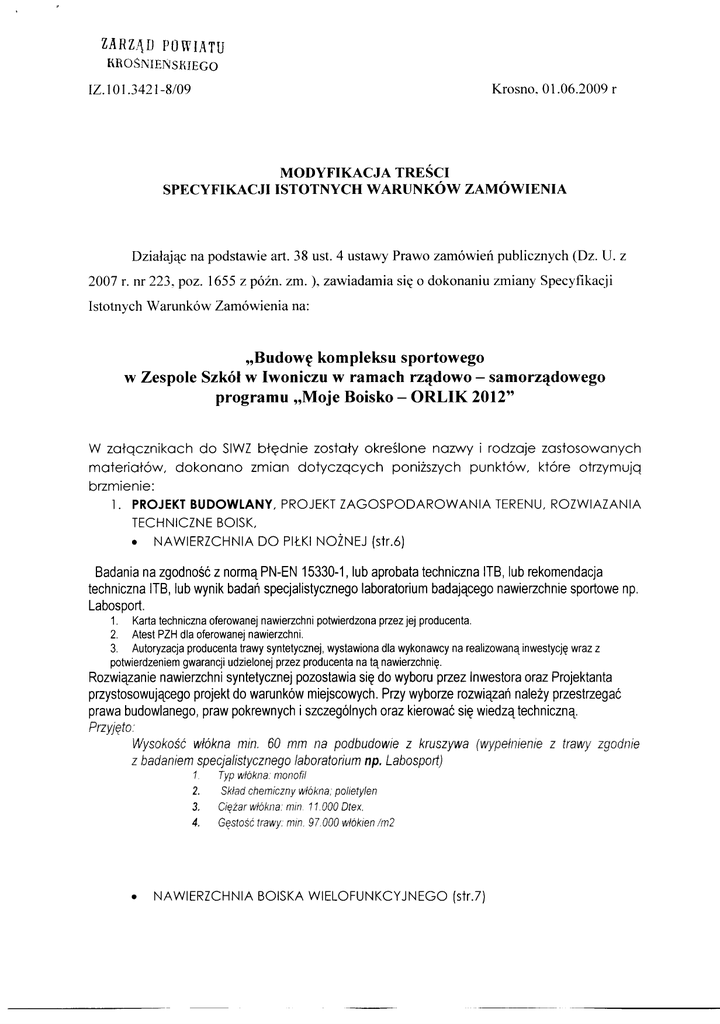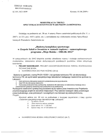 ZARZJ~D POWIATU RROSNIENSH!EGO Krosno. O1.06.2009 r IZ. I O1.3421-8/09 MODYFIKACJA TREŚCI SPECYFIKACJI ISTOTNYCH WARUNKÓW ZAMÓWIENIA Działając na podstawie art. 38 ust. 4 ustawy Prawo 2007 r. nr 223, poz. 1655 z późn. zm. ), zawiadamia się zamówień publicznych (Dz. U. z o dokonaniu zmiany Specyfikacji Istotnych Warunków Zamówienia na: „Budowę kompleksu sportowego w Zespole Szkół w Iwoniczu w ramach rządowo - samorządowego programu „Moje Boisko - ORLIK 2012" W załącznikach do SIWZ błędnie zostały określone nazwy i rodzaje zastosowanych materiałów, dokonano zmian dotyczących poniższych punktów, które otrzymują brzmienie: l. PROJEKT BUDOWLANY, PROJEKT ZAGOSPODAROWANIA TERENU, ROZWIAZANIA TECHNICZNE BOISK, • NAWIERZCHNIA DO PIŁKI NOŻNEJ (str.6) Badania na zgodność z normą PN-EN 15330-1, lub aprobata techniczna ITB, lub rekomendacja techniczna ITB, lub wynik badań specjalistycznego laboratorium badającego nawierzchnie sportowe np. Labosport. 1. Karta techniczna oferowanej nawierzchni potwierdzona przez jej producenta. 2. Atest PZH dla oferowanej nawierzchni. 3. Autoryzacja producenta trawy syntetycznej, wystawiona dla wykonawcy na realizowaną inwestycję wraz z potwierdzeniem gwarancji udzielonej przez producenta na tą nawierzchnię. Rozwiązanie nawierzchni syntetycznej pozostawia się do wyboru przez Inwestora oraz Projektanta przystosowującego projekt do warunków miejscowych. Przy wyborze rozwiązań należy przestrzegać prawa budowlanego, praw pokrewnych i szczególnych oraz kierować się wiedzą techniczną. Przyjęto.· Wysokość włókna min. 60 mm na podbudowie z kruszywa z badaniem specjalistycznego laboratorium np. Labosport) 1. 2. 3. 4. • Typ (wypełnienie włókna. monofil Skład chemiczny włókna. polietylen Ciężar włókna. min. 11. OOO Otex. Gęstość trawy. min. 97.000 włókien !m2 NAWIERZCHNIA BOISKA WIELOFUNKCYJNEGO (str.7) z trawy zgodnie Badania na zgodność z normą PN-EN 14877, lub aprobata techniczna ITB, lub rekomendacja techniczna ITB lub wynik badań specjalistycznego laboratorium badającego nawierzchnie sportowe np. Labosport. 1. Karta techniczna oferowanej nawierzchni potwierdzona przez jej producenta. 2. Atest PZH dla ofiarowanej nawierzchni. 3. Autoryzacja producenta nawierzchni poliuretanowej, wystawiona dla wykonawcy na realizowaną inwestycję wraz z potwierdzeniem gwarancji udzielonej przez producenta na tą nawierzchnię. Rozwiązanie nawierzchni syntetycznej pozostawia się do wyboru przez Inwestora oraz Projektanta przystosowującego projekt do warunków miejscowych. Przy wyborze rozwiązań należy przestrzegać prawa budowlanego, praw pokrewnych i szczególnych oraz kierować się wiedzą techniczną Przyjęto technologię typu NA TRYSK - na podbudowie z kruszywa kamiennego instaluje się warstwę przepuszczalną dla wody i warstwę stabilizującą typu ET (w przypadku nieprzepuszczalnej podbudowy betonowej. asfaltowej lub asfaltowo-betonowej warstwa ET nie jest wymagana). Następnie warstwę gr. 10-11 mm z granulatu SBR następnie warstwę natrysku (mieszanka granulatu EPDM zmieszana z PU) o grubości 2-3mm. Linie boiska do koszykówki -np w kolorze żółtym. siatkówki - np. w kolorze niebieskim malowane specjalną farbą poliuretanową 2. SZCZEGÓŁOWA SPECYFIKACJA TECHNICZNA a) 2/D.05. NA WIERZCHNIE SYNTETYCZNE BOISK, ./ punkt 2.2 (Materiały na boisko do koszykówki i siatkówki z nawierzchni syntetycznej): Badania na zgodność z normą PN-EN 14877, lub aprobata techniczna ITB, lub rekomendacja techniczna ITB lub wynik badań specjalistycznego laboratorium badającego nawierzchnie sportowe np. Labosport. I. Karta techniczna oferowanej nawierzchni potwierdzona przez jej producenta. 2. Atest PZH dla ofiarowanej nawierzchni. 3. Autoryzacja producenta nawierzchni poliuretanowej, wystawiona dla wykonawcy na realizowaną inwestycję wraz z potwierdzeniem gwarancji udzielonej przez producenta na tą nawierzchnię. Wymagania dotyczące nawierzchni: - na podbudowę z kruszywa kamiennego warstwa przepuszczalna dla wody i warstwa stabilizująca typu ET, - dolna warstwa gr. 10-11 mm z granulatu SBR, - górna warstwa - natrysk (mieszanka granulatu EPDM zmieszana z PU) o grubości 2-3 mm . ./ punkt 2.3 (Materiały na boisko do piłki nożnej z trawy syntetycznej) Badania na zgodność z normą PN-EN 15330-1, lub aprobata techniczna ITB, lub rekomendacja techniczna ITB, lub wynik badań specjalistycznego laboratorium badającego nawierzchnie sportowe np. Labosport. • • • Karta techniczna oferowanej nawierzchni potwierdzona przez jej producenta. Atest PZH dla oferowanej nawierzchni. Autoryzacja producenta trawy syntetycznej, wystawiona dla wykonawcy na realizowaną inwestycję wraz z potwierdzeniem gwarancji udzielonej przez producenta na tą nawierzchnię. Jako nawierzchnię sportową przyjąć trawę syntetyczną o - wysokość całkowita nawierzchni - min. 60 mm, następujących parametrach: - gęstość (ilość włókien/rn2) - min. 97 OOO, - typ włókna - rnonofil, - skład chemiczny włókna - polietylen, - ciężar włókna - min. 11.000 Dtex, - wypełnienie - piasek kwarcowy, granulat gumowy EPDM ./ punkt 2.4. l (Bramki) Tuleje do osadzenia w podłożu spełniające wymagania przepisów dopuszczających, Bramki do piłki nożnej 500x200 cm, winna posiadać konstrukcję łuków składanych umożliwiających szybki montaż i demontaż, Siatka bezwęzłowa z polipropylenu. b) 4/ZT.02. OGRODZENIE ./ punkt 2.2. l (Elementy ogrodzenia) • • • bramy przęsła furtki Przewidziano do wykonania ogrodzenie wysokości min. 4,00 m: Ogrodzenie terenu na słupkach stalowych wbetonowanych na stałe w stopach fundamentowych. Wypełnienie z siatki stalowej o gr. od 3,0 do 3,4 mm. Ze względu na możliwość przystosowania boiska do gry w tenisa zaleca się zastosowanie siatki o wymiarze oczka max. 45x45 mrn. Rozstaw słupków od minimum 2rn do maksimum 5m. Furtki i bramy przesuwne lub rozwierne, możli