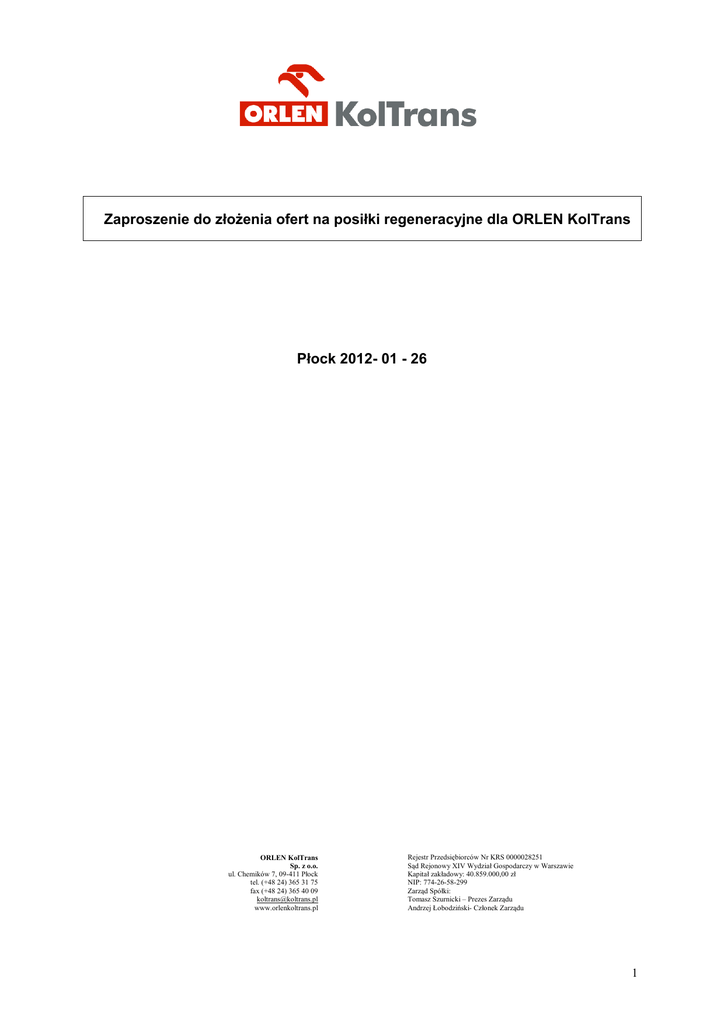 Zaproszenie do złożenia ofert na posiłki regeneracyjne dla ORLEN KolTrans Płock 2012- 01 - 26 ORLEN KolTrans Sp. z o.o. ul. Chemików 7, 09-411 Płock tel. (+48 24) 365 31 75 fax (+48 24) 365 40 09 [email protected] www.orlenkoltrans.pl Rejestr Przedsiębiorców Nr KRS 0000028251 Sąd Rejonowy XIV Wydział Gospodarczy w Warszawie Kapitał zakładowy: 40.859.000,00 zł NIP: 774-26-58-299 Zarząd Spółki: Tomasz Szurnicki – Prezes Zarządu Andrzej Łobodziński- Członek Zarządu 1 I. Zlecający : ORLEN KolTrans Sp. z o.o. 09-411 Płock Ul. Chemików 7 NIP: 774-26-58-299 http://www.orlenkoltrans.pl, e-mail: [email protected], tel. 24 365 39 11, fax. 24 365 40 09 II. Informacje o postępowaniu ofertowym : Postępowanie ofertowe prowadzone jest według wewnętrznych procedur obowiązujących w ORLEN KolTrans Sp. z o.o. III. Przedmiot zamówienia. Przedmiotem zapytania jest : • zakup posiłków regeneracyjnych wraz z dostawą dla pracowników ORLEN Koltrans według szacunkowej ilości posiłków zamawianych przez Spółkę. Szacunkowa ilość zamawianych posiłków w ciągu całego roku-około 30750 posiłków , miesięcznie około 2563 posiłków , dziennie 128 posiłków. 1. Posiłki regeneracyjne muszą być podane w formie jednego gorącego dania np. zupa z wkładką wydawane na miejscu. 2. Posiłki powinny zawierać około-50-55% węglowodanów,30-35% tłuszczów, 15%białek oraz posiadać wartość kaloryczną około 1000 kcal. 3. Ciepłe posiłki Wykonawca będzie dostarczać własnym transportem. 4. Ilość posiłków będzie się zmieniać w zależności od frekwencji osób. 5. Jadłospis układany będzie przez Wykonawcę na okres 10 dni roboczych i dostarczany Zamawiającemu do wcześniejszego zatwierdzenia. Wszelkie zmiany w jadłospisie sugerowane przez Zamawiającego będą wiążące dla Wykonawcy. 6. Wykonawca gwarantuje, że usługi świadczone będą na wysokim poziomie, a mianowicie: dostarczone posiłki będą wykonane ze świeżych produktów, oraz przyrządzane w dniu dostawy. IV. Treść składanych ofert i wymagane dokumenty. Warunkiem przyjęcia oferty jest przedłożenie wraz z ofertą niżej wymienionych danych i dokumentów: 1. Nazwa firmy, adres, telefon kontaktowy, fax. 2. Nazwiska osób reprezentujących firmę. Odpis z Krajowego Rejestru Sądowego, w przypadku spółek Prawa Handlowego, lub zaświadczenie o wpisie do ewidencji działalności gospodarczej w przypadku osób fizycznych. 3. Decyzja w sprawie nadania Nr Identyfikacji Podatkowej NIP. V. Oferta winna zawierać. W części technicznej: 1. Dokumenty potwierdzające wiarygodność oferenta wskazane w pkt. IV. 2. Wskazanie osoby sprawującej nadzór nad realizacją procesu wykonania usługi. 2 3. Termin ważności oferty (min.12 miesiące). 4. Oświadczenie oferentów – zał. nr 1. 5. Referencje ze świadczenia tego typu usług W części cenowej: 1. Cena jednostkowa netto przedmiotu zakupu wraz z dostawą . 2. Deklaracja niezmienności ceny w trakcie realizacji usługi. 3. Sposób rozliczenia – z uwzględnieniem 30 dniowego terminu płatności faktur licząc od dnia otrzymania faktury. VI. Kryteria wyboru Wykonawcy • cena jednostkowa netto przedmiotu zakupu wraz z dostawą • referencje VII. Sposób złożenia oferty Oferta powinna składać się z dwóch części: technicznej i cenowej oraz być podpisana przez osoby uprawnione do reprezentowania firmy. Ofertę należy złożyć w opisanej i zamkniętej kopercie do dnia 09.02.2011r. do godz. 14:00 w sekretariacie Prezesa Zarządu ORLEN KolTrans Sp. z o.o. 09-411 Płock ul. Chemików 7 z dopiskiem „akcja ofertowa na posiłki regeneracyjne” Pytania dodatkowe dotyczące zakresu ogłoszonej akcji ofertowej prosimy przesyłać na adres e-mail: [email protected]. Odpowiedź będzie przekazywana tą samą droga. VIII. Zastrzeżenia zapraszającego do składania ofert. ORLEN KolTrans Sp. z o.o. zastrzega sobie prawo do: 1. Wyboru oferenta wg przedstawionych kryteriów oceny. 2. Możliwość odstąpienia od procedury wyboru oferty bez podania przyczyn, 3. Dokonania korekt i uściśleń zakresu w trakcie analizy ofert, proszenia o ewentualną jego aktualizację. 4. Przeprowadzenie dodatkowych negocjacji cen. IX. Ponadto informuję się, że oferentowi nie przysługują żadne roszczenia z tytułu odrzucenia jego oferty lub nie wybrania oferty, oraz że nie przewiduje się trybu odwoławczego od dokonanego wyboru oferenta. Oferent ponosi wszystkie koszty związane z przygotowaniem i złożeniem oferty i nie przysługuje mu prawo do zwrotu tych kosztów. X. ORLEN KolTrans Sp. z o.o. zastrzega sobie prawo do dowolnego wyboru podmiotu/podmiotów, z którymi będą prowadzone negocjacje w odniesieniu do części lub całości zakresu złożonych odpowiedzi oraz do zawarcia umowy z więcej niż jednym Dostawcą wyłonionym w drodze negocjacji, przy czym zakres umowy może obejmować całość lub część zakresu złożonej odpowiedzi na zapytanie ofertowe. Z poważaniem Przewodniczący Zespołu Oceniającego Zimowska Justyna 3 Załącznik nr 1 Oświadczenie Oferenta Dotyczy postępowania o udzielenie zlecenia na: posiłki regeneracyjne dla pracowników ORLEN KolTrans Oświadczam, że reprezentowana przeze mnie FIRMA: a) Jest uprawiona do występowania w obrocie prawnym, zgodnie z wymaganiami ustawowymi, b) Posiada uprawnienia niezbędne do wykonywania określonych prac lub czynności, c) Posiada niezbędną wiedzę i doświadczenie, potencjał ekonomiczny i techniczny, a także pracowników zdolnych do wykonania zamówienia, d) Znajduje się w sytuacji finansowej zapewniającej wykonanie przedmiotu zamówienia, e) Nie znajduje się w stanie upadłości, likwidacji lub nie wszczęto wobec niej postępowania upadłościowego, f) Członkowie władz nie figurują w Krajowym Rejestrze Karnym, g) Nie zatrudnia pracowników zamawiającego, h) Nie pozostaje z zamawiającym w takim stosunku prawnym lub faktycznym, że może to budzić uzasadnione wątpliwo