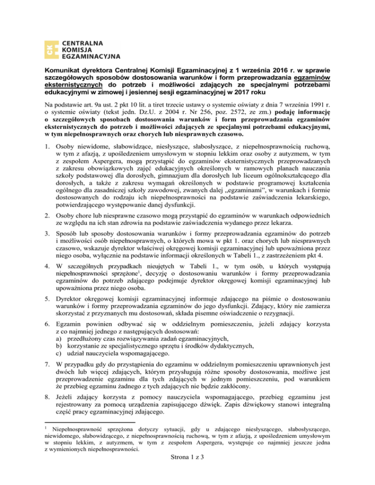 Komunikat dyrektora Centralnej Komisji Egzaminacyjnej z 1 września 2016 r. w sprawie szczegółowych sposobów dostosowania warunków i form przeprowadzania egzaminów eksternistycznych do potrzeb i możliwości zdających ze specjalnymi potrzebami edukacyjnymi w zimowej i jesiennej sesji egzaminacyjnej w 2017 roku Na podstawie art. 9a ust. 2 pkt 10 lit. a tiret trzecie ustawy o systemie oświaty z dnia 7 września 1991 r. o systemie oświaty (tekst jedn. Dz.U. z 2004 r. Nr 256, poz. 2572, ze zm.) podaję informację o szczegółowych sposobach dostosowania warunków i form przeprowadzania egzaminów eksternistycznych do potrzeb i możliwości zdających ze specjalnymi potrzebami edukacyjnymi, w tym niepełnosprawnych oraz chorych lub niesprawnych czasowo. 1. Osoby niewidome, słabowidzące, niesłyszące, słabosłyszące, z niepełnosprawnością ruchową, w tym z afazją, z upośledzeniem umysłowym w stopniu lekkim oraz osoby z autyzmem, w tym z zespołem Aspergera, mogą przystąpić do egzaminów eksternistycznych przeprowadzanych z zakresu obowiązkowych zajęć edukacyjnych określonych w ramowych planach nauczania szkoły podstawowej dla dorosłych, gimnazjum dla dorosłych lub liceum ogólnokształcącego dla dorosłych, a także z zakresu wymagań określonych w podstawie programowej kształcenia ogólnego dla zasadniczej szkoły zawodowej, zwanych dalej „egzaminami”, w warunkach i formie dostosowanych do rodzaju ich niepełnosprawności na podstawie zaświadczenia lekarskiego, potwierdzającego występowanie danej dysfunkcji. 2. Osoby chore lub niesprawne czasowo mogą przystąpić do egzaminów w warunkach odpowiednich ze względu na ich stan zdrowia na podstawie zaświadczenia wydanego przez lekarza. 3. Sposób lub sposoby dostosowania warunków i formy przeprowadzania egzaminów do potrzeb i możliwości osób niepełnosprawnych, o których mowa w pkt 1. oraz chorych lub niesprawnych czasowo, wskazuje dyrektor właściwej okręgowej komisji egzaminacyjnej lub upoważniona przez niego osoba, wyłącznie na podstawie informacji określonych w Tabeli 1., z zastrzeżeniem pkt 4. 4. W szczególnych przypadkach nieujętych w Tabeli 1., w tym osób, u których występują niepełnosprawności sprzężone1, decyzję o dostosowaniu warunków i formy przeprowadzania egzaminów do potrzeb zdającego podejmuje dyrektor okręgowej komisji egzaminacyjnej lub upoważniona przez niego osoba. 5. Dyrektor okręgowej komisji egzaminacyjnej informuje zdającego na piśmie o dostosowaniu warunków i formy przeprowadzania egzaminów do jego dysfunkcji. Zdający, który nie zamierza skorzystać z przyznanych mu dostosowań, składa pisemne oświadczenie o rezygnacji. 6. Egzamin powinien odbywać się w oddzielnym pomieszczeniu, jeżeli zdający korzysta z co najmniej jednego z następujących dostosowań: a) przedłużony czas rozwiązywania zadań egzaminacyjnych, b) korzystanie ze specjalistycznego sprzętu i środków dydaktycznych, c) udział nauczyciela wspomagającego. 7. W przypadku gdy do przystąpienia do egzaminu w oddzielnym pomieszczeniu uprawnionych jest dwóch lub więcej zdających, którym przysługują różne sposoby dostosowania, możliwe jest przeprowadzenie egzaminu dla tych zdających w jednym pomieszczeniu, pod warunkiem że przebieg egzaminu żadnego z tych zdających nie będzie zakłócony. 8. Jeżeli zdający korzysta z pomocy nauczyciela wspomagającego, przebieg egzaminu jest rejestrowany za pomocą urządzenia zapisującego dźwięk. Zapis dźwiękowy stanowi integralną część pracy egzaminacyjnej zdającego. Niepełnosprawność sprzężona dotyczy sytuacji, gdy u zdającego niesłyszącego, słabosłyszącego, niewidomego, słabowidzącego, z niepełnosprawnością ruchową, w tym z afazją, z upośledzeniem umysłowym w stopniu lekkim, z autyzmem, w tym z zespołem Aspergera, występuje co najmniej jeszcze jedna z wymienionych niepełnosprawności. 1 Strona 1 z 3 9. Nauczycielem wspomagającym i/lub specjalistą, o którym mowa w Tabeli 1., jest członek zespołu nadzorującego wyznaczony odpowiednio przez dyrektora okręgowej komisji egzaminacyjnej. Tabela 1. Sposoby dostosowania warunków i formy przeprowadzania egzaminów eksternistycznych Uprawnieni do dostosowania osoby niewidome osoby słabowidzące osoby niesłyszące osoby słabosłyszące Sposoby dostosowania warunków i formy przeprowadzania egzaminów eksternistycznych 1. Arkusz egzaminacyjny w piśmie Braille’a. W przypadku arkusza w piśmie Braille’a przedłużenie czasu przeprowadzania egzaminu nie więcej niż o 50 procent czasu przewidzianego na rozwiązanie zadań z arkusza egzaminacyjnego standardowego. 2. Korzystanie z pomocy nauczyciela wspomagającego, który odczytuje zadania oraz zapisuje odpowiedzi zdającego (możliwe tylko w przypadku zdającego, który nie korzysta z zestawu w piśmie Braille’a). W przypadku korzystania z pomocy nauczyciela wspomagającego przedłużenie czasu nie więcej niż o 30 minut. 3. Zapewnienie w czasie przeprowadzania egzaminu obecności tyflopedagoga (członka zespołu nadzorującego), jeżeli jest to niezbędne dla uzyskania właściwego kontaktu ze zdającym i pomocy specjalistycznego sprzętu i środków dydaktycznych. 4. Korzystanie ze sprzętu specjalistycznego i środków dydaktycznych, z których zdający korzysta na co dzień, w tym z komputera. 1. Arkusz egzaminacyjny zapisany czcionką Arial 16 pkt. 2. Korzystanie z pomocy nauczyciela wspomagającego, który odczytuje zadania oraz zapisuje odpowiedzi zdającego (możliwe tylko wtedy, kiedy wada wzroku utrudnia lub uniemożliwia czytanie i pisanie). 3. Korzystanie z przyborów optycznych, którymi zdający posługuje się na co dzień. 4. Oświetlenie stanowiska pracy dostosowane do dysfunkcji. 5. Przedłużenie czasu przeprowadzania egzaminu nie więcej niż o 30 minut. 6. Zapewnienie w czasie przeprowadzania egzaminu obecności tyflopedagoga (członka zespołu nadzorującego), jeżeli
