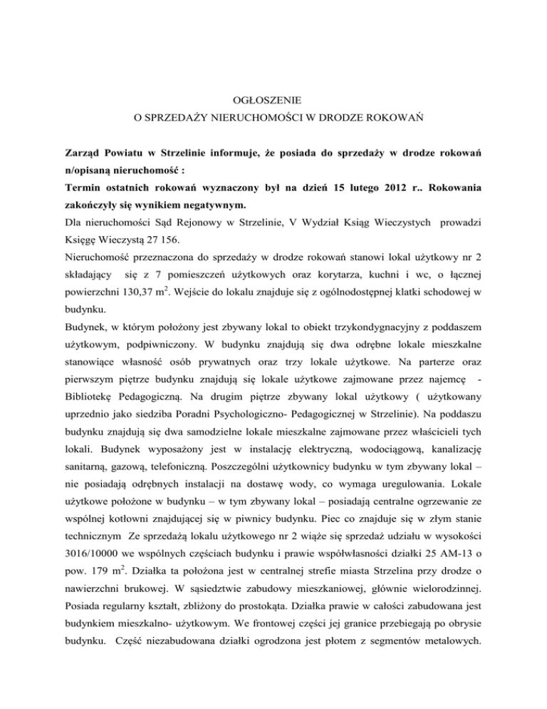 OGŁOSZENIE O SPRZEDAŻY NIERUCHOMOŚCI W DRODZE ROKOWAŃ Zarząd Powiatu w Strzelinie informuje, że posiada do sprzedaży w drodze rokowań n/opisaną nieruchomość : Termin ostatnich rokowań wyznaczony był na dzień 15 lutego 2012 r.. Rokowania zakończyły się wynikiem negatywnym. Dla nieruchomości Sąd Rejonowy w Strzelinie, V Wydział Ksiąg Wieczystych prowadzi Księgę Wieczystą 27 156. Nieruchomość przeznaczona do sprzedaży w drodze rokowań stanowi lokal użytkowy nr 2 składający się z 7 pomieszczeń użytkowych oraz korytarza, kuchni i wc, o łącznej powierzchni 130,37 m2. Wejście do lokalu znajduje się z ogólnodostępnej klatki schodowej w budynku. Budynek, w którym położony jest zbywany lokal to obiekt trzykondygnacyjny z poddaszem użytkowym, podpiwniczony. W budynku znajdują się dwa odrębne lokale mieszkalne stanowiące własność osób prywatnych oraz trzy lokale użytkowe. Na parterze oraz pierwszym piętrze budynku znajdują się lokale użytkowe zajmowane przez najemcę - Bibliotekę Pedagogiczną. Na drugim piętrze zbywany lokal użytkowy ( użytkowany uprzednio jako siedziba Poradni Psychologiczno- Pedagogicznej w Strzelinie). Na poddaszu budynku znajdują się dwa samodzielne lokale mieszkalne zajmowane przez właścicieli tych lokali. Budynek wyposażony jest w instalację elektryczną, wodociągową, kanalizację sanitarną, gazową, telefoniczną. Poszczególni użytkownicy budynku w tym zbywany lokal – nie posiadają odrębnych instalacji na dostawę wody, co wymaga uregulowania. Lokale użytkowe położone w budynku – w tym zbywany lokal – posiadają centralne ogrzewanie ze wspólnej kotłowni znajdującej się w piwnicy budynku. Piec co znajduje się w złym stanie technicznym Ze sprzedażą lokalu użytkowego nr 2 wiąże się sprzedaż udziału w wysokości 3016/10000 we wspólnych częściach budynku i prawie współwłasności działki 25 AM-13 o pow. 179 m2. Działka ta położona jest w centralnej strefie miasta Strzelina przy drodze o nawierzchni brukowej. W sąsiedztwie zabudowy mieszkaniowej, głównie wielorodzinnej. Posiada regularny kształt, zbliżony do prostokąta. Działka prawie w całości zabudowana jest budynkiem mieszkalno- użytkowym. We frontowej części jej granice przebiegają po obrysie budynku. Część niezabudowana działki ogrodzona jest płotem z segmentów metalowych. Niezabudowana część działki jest wykorzystywana jako teren komunikacji wewnętrznej. Działka posiada uzbrojenie w podstawowe przyłącza sieci infrastruktury technicznej. Wg miejscowego planu zagospodarowania przestrzennego STRZELIN-OSIEDLE POZYTYWISTÓW zatwierdzonego uchwałą Rady Miejskiej Strzelina Nr XVIII/248/2004 z dnia 19.10.2004 r. teren, na którym położona jest przedmiotowa działka oznaczony jest symbolem 6MW/U – zabudowa mieszkaniowa wielorodzinna, usługi nieuciążliwe o charakterze lokalnym w parterach budynków mieszkalnych. Nieruchomość była przedmiotem przetargów ogłoszonych przez Zarząd Powiatu w Strzelinie W związku z negatywnymi wynikami przetargów Zarząd Powiatu w Strzelinie podjął uchwałę w sprawie sprzedaży w/w nieruchomości w drodze rokowań. Cena wywoławcza nieruchomości wynosi 161 818,00 zł. brutto (słownie: złotych sto sześćdziesiąt jeden tysięcy osiemset osiemnaście ) Rokowania zostaną przeprowadzone w dniu 20 czerwca 2012 roku w Starostwie Powiatowym w Strzelinie przy ul. Kamiennej 10 (pokój 111) o godzinie 10 00. Pisemne zgłoszenia udziału w rokowaniach należy złożyć do dnia 14 czerwca 2012 roku do godz. 1530 w Sekretariacie Starostwa Powiatowego w Strzelinie. Zgłoszenie udziału w rokowaniach należy złożyć w zamkniętych kopertach z dopiskiem: oferta na nabycie nieruchomości stanowiącej lokal użytkowy nr 2 poł. w budynku mieszkalno- użytkowym w Strzelinie przy ul. Jana Pawła II 12. Zgłoszenie powinno zawierać: - imię, nazwisko i adres albo nazwę lub firmę oraz siedzibę, jeżeli zgłaszającym jest osoba prawna lub inny podmiot, - datę sporządzenia zgłoszenia, - oświadczenie, że zgłaszający zapoznał się z warunkami rokowań i przyjmuje te warunki bez zastrzeżeń, ( warunki rokowań określa rozporządzenie Rady Ministrów w sprawie sposobu i trybu przeprowadzenia przetargów oraz rokowań na zbycie nieruchomości Dz.U. z 2004 r. Nr 207, poz. 2108) - proponowaną cenę i sposób jej zapłaty, - proponowany sposób realizacji dodatkowych warunków rokowań, - oświadczenie o zapoznaniu się ze stanem nieruchomości nie wnoszeniu żadnych zastrzeżeń - oświadczenie o rezygnacji z roszczeń z tytułu rękojmi za jakiekolwiek ukryte wady przedmiotu sprzedaży - żądanie lub rezygnację z okazania granic nieruchomości na koszt nabywcy Do zgłoszenia należy dołączyć kopię dowodu wpłaty zaliczki dokonanej tytułem zabezpieczenia kosztów w przypadku uchylenia się od zawarcia umowy, w wysokości 30 000,00 zł. którą należy wpłacić w terminie do dnia 14 czerwca 2012 r. na konto Starostwa Powiatowego w Strzelinie w Powiatowym Banku Spółdzielczym nr konta : 079588 0004 0000 7777 2000 0040. W przypadku uchylenia się osoby, która wygra rokowania od zawarcia umowy przenoszącej własność zaliczka wpłacona tytułem zabezpieczenia kosztów nie podlega zwrotowi. Pozostałym osobom wpłacona zaliczka zostanie zwrócona w terminie 3 dni od daty zakończenia rokowań, na wskazane przez nich konto. Z dodatkowymi warunkami rokowań można zapoznać się w Starostwie Powiatowym w Strzelinie ul. Kamienna 10 (pokój 207) II piętro w dniach od poniedziałku do czwartku w godz. 730 do 1530. Wtorek od godz. 730 do godz. 18 00 . Piątek od godz. 730 do 1300. W przypadku złożenia równorzędnych ofert Zarząd Powiatu zastrzega sobie prawa do wyłonienia oferentów w drodze przetargu. Zarząd Powiatu w Strzelinie zastrzega sobie prawo zamknięcia rokowań bez wybrania nabywcy nieruchomości.