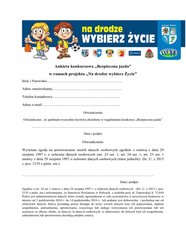 Ankieta konkursowa „Bezpieczna jazda” w ramach projektu „Na drodze wybierz Życie” Imię i Nazwisko…………………………………………………… Adres zamieszkania……………………………………………….. Telefon kontaktowy……………………………………………… Adres e-mail……………………………………………………… Oświadczenie Oświadczam , że spełniam wszystkie kryteria określone w regulaminie konkursu „Bezpieczna jazda” …………………………………………………………………………………………….. Data i podpis Oświadczenie Wyrażam zgodę na przetwarzanie moich danych osobowych zgodnie z ustawą z dnia 29 sierpnia 1997 r. o ochronie danych osobowych (art. 23 ust. 1; art. 24 ust. 1, art. 25 ust. 1 ustawy z dnia 29 sierpnia 1997 o ochronie danych osobowych (tekst jednolity: Dz. U. z 2015 r, poz. 2135 z późn. zm.). ……………………………………………………………………………………………………. Data i podpis Zgodnie z art. 24 ust 1 ustawy z dnia 29 sierpnia 1997 r. o ochronie danych osobowych (Dz. U. z 2015 r. poz. 2135 z późn. zm.) informujemy, że Starostwo Powiatowe w Policach z siedzibą przy ul. Tanowskiej 8, 72-010 Police jest administratorem danych, które zostały zgromadzone w celu uczestnictwa w powyższym konkursie w okresie od 3 października 2016 r. do 14 października 2016 r.. Ich podanie jest dobrowolne i pochodzą one od właścicieli danych, którzy posiadają prawo dostępu do treści swoich danych oraz ich poprawiania, żądania uzupełnienia, uaktualnienia, sprostowania, czasowego lub stałego wstrzymania ich przetwarzania lub ich usunięcia ze zbioru, chyba, że dotyczy to danych osobowych, w odniesieniu, do których tryb ich uzupełnienia, uaktualnienia lub sprostowania określają odrębne ustawy. ZAZNACZ X PRAWIDŁOWĄ ODPOWIEDŹ (tylko jedna odpowiedź jest prawidłowa dla każdego z pytań) 1. Jaki odstęp należy zachować podczas wyprzedzania kolumny pieszych? A. Bezpieczny, ale nie mniejszy niż 0,6 metra B. Bezpieczny, ale nie mniejszy niż 0,8 metra C. Bezpieczny, ale nie mniejszy niż 1 metr 2. Jaki odstęp należy zachować podczas wyprzedzania motocykla? A. Bezpieczny, ale nie większy niż 0,5 metra B. Bezpieczny, ale nie większy niż 1 metr C. Bezpieczny, ale nie mniejszy niż 1 metr 3. Jaka pozycja za kierownicą umożliwia zmniejszenie efektu tzw. martwego pola w lusterkach występującego w czasie obserwacji drogi? A. Statyczna- sztywne siedzenie na fotelu bez ruchów tułowia i głowy B. Dynamiczna- w zależności od sytuacji odchylenie tułowia i głowy od fotela C. Dowolna, przede wszystkim dająca wygodę kierowania 4. Kiedy masz obowiązek przełączyć światła drogowe na światła mijania? A. Gdy z naprzeciwka nadjeżdża inny pojazd B. Gdy zaczyna padać deszcz C. Gdy wjeżdżasz na obszar zabudowany 5. Którą z czynności należy wykonać, gdy działający system ABS wypycha w czasie hamowania pedał hamulca? A. Utrzymać siłę nacisku na pedał hamulca B. Zmniejszyć siłę nacisku na pedał hamulca C. Zwolnić pedał hamulca 6. W jaki sposób powinieneś hamować awaryjnie samochodem osobowym wyposażonym w układ przeciwblokujący (ABS)? A. Mocno wcisnąć pedał hamulca i nie zwalniać go w chwili zadziałania układu ABS B. Mocno wcisnąć pedał hamulca i zmniejszyć nacisk w chwili zadziałania układu ABS C. Hamować pulsacyjnie aż do zadziałania układu ABS 7 Które z wymienionych zachowań wobec rannego w wypadku, może skutkować odpowiedzialnością karną? A. Zaniechanie udzielenia jakiejkolwiek pomocy B. Każde nieprofesjonalne działanie ratownicze C. Każde nieprofesjonalne i błędne działanie ratownicze 8.Co należy zrobić, gdy u nieprzytomnego poszkodowanego w wypadku drogowym stwierdzisz brak oddechu? A. W obawie o ewentualny uraz kręgosłupa pozostawić rannego w pojeździe do przyjazdu ratownictwa medycznego B. Wydostać rannego z rozbitego pojazdu i przystąpić do resuscytacji C. Pozostawić rannego w pojeździe i przykryć go kocem termoizolacyjnym, czekając na przybycie ratownictwa medycznego 9. Co widzi kierujący w dobrze ustawionym lusterku zewnętrznym samochodu osobowego? A. Tylko obszar przestrzeni obok pojazdu. B. Tylko obszar przestrzeni za pojazdem. C. Fragment boku pojazdu i odpowiedni do strony pojazdu obszar przestrzeni za nim. 10. Jak, w przybliżeniu, wzrasta długość hamowania pojazdu przy dwukrotnie większej prędkości? A. Czterokrotnie B. Trzykrotnie C. Dwukrotnie Oświadczenie Wyrażam zgodę na wykorzystanie mojego wizerunku, do celów informacyjno-promocyjnych związanych z projektem „Na drodze wybierz Życie, w przypadku wygranej w konkursie. ………………………………………………………………………………………………… Data i podpis