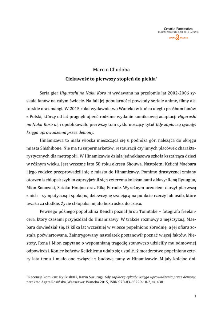Creatio Fantastica PL ISSN: 2300-2514 R. XII, 2016, nr 2 (53) Marcin Chudoba Ciekawość to pierwszy stopień do piekła Seria gier Higurashi no Naku Koro ni wydawana na przełomie lat 2002-2006 zyskała fanów na całym świecie. Na fali jej popularności powstały seriale anime, filmy aktorskie oraz mangi. W 2015 roku wydawnictwo Waneko w końcu uległo prośbom fanów z Polski, którzy od lat pragnęli ujrzeć rodzime wydanie komiksowej adaptacji Higurashi no Naku Koro ni, i opublikowało pierwszy tom cyklu noszący tytuł Gdy zapłaczą cykady: księga uprowadzenia przez demony. Hinamizawa to mała wioska mieszcząca się u podnóża gór, należąca do okręgu miasta Shishibone. Nie ma tu supermarketów, restauracji czy innych placówek charakterystycznych dla metropolii. W Hinamizawie działa jednoklasowa szkoła kształcąca dzieci w różnym wieku. Jest wczesne lato 58 roku okresu Shouwa. Nastoletni Keiichi Maebara i jego rodzice przeprowadzili się z miasta do Hinamizawy. Pomimo drastycznej zmiany otoczenia chłopak szybko zaprzyjaźnił się z czterema koleżankami z klasy: Reną Ryuuguu, Mion Sonozaki, Satoko Houjou oraz Riką Furude. Wyraźnym uczuciem darzył pierwszą z nich – sympatyczną i spokojną dziewczynę szalejącą na punkcie rzeczy lub osób, które uważa za słodkie. Życie chłopaka mijało beztrosko, do czasu. Pewnego późnego popołudnia Keiichi poznał Jirou Tomitake – fotografa freelancera, który czasami przyjeżdżał do Hinamizawy. W trakcie rozmowy z mężczyzną, Maebara dowiedział się, iż kilka lat wcześniej w wiosce popełniono zbrodnię, a jej ofiara została poćwiartowana. Zaintrygowany nastolatek postanowił poznać więcej faktów. Niestety, Rena i Mion zapytane o wspomnianą tragedię stanowczo udzieliły mu odmownej odpowiedzi. Koniec końców Keiichiemu udało się ustalić, iż morderstwo popełniono cztery lata temu i miało ono związek z budową tamy w Hinamizawie. Mijały kolejne dni. Recenzja komiksu: Ryukishi07, Karin Suzuragi, Gdy zapłaczą cykady: księga uprowadzenia przez demony, przekład Agata Rosińska, Warszawa: Waneko 2015, ISBN 978-83-65229-18-2, ss. 438. 1 W trakcie Nocy Dryfującej Bawełny – festiwalu odprawianego na cześć lokalnego bóstwa opiekuńczego, zwanego Czcigodnym Oyashiro, Keiichi ponownie spotkał Jirou. Tym razem nastolatek dowiedział się, iż zbrodnię popełniono w noc festiwalu. Na domiar złego, w kolejnych latach z różnych powodów ginęły następne osoby. Serię tych nieprzyjemnych zdarzeń nazwano Klątwą Czcigodnego Oyashiro. Jak okazało się później, co roku w niewyjaśnionych okolicznościach znikała też inna osoba. Mówiono o niej, iż została uprowadzona przez demony. Czym jest zło czające się w Hinamizawie? Czy klątwa i demony naprawdę istnieją? Co Rena i Mion ukrywają przed Keiiichim? Czy chłopcu uda się poznać prawdę? Gdy zapłaczą cykady: księga uprowadzenia przez demony łączy w sobie cechy horroru oraz powieści kryminalnej i robi to bardzo dobrze. Początek komiksu wcale nie wskazuje na to, że fabuła recenzowanej pozycji miałaby rozwinąć się w drastycznym kierunku. Keiichi spędza czas ze swoimi przyjaciółkami na zabawach i wygłupach – typowe zachowanie młodzieży w wieku szkolnym. Jednak sytuacja zaczyna się komplikować, gdy chłopak dowiaduje się o morderstwie sprzed lat. Rena i Mion nie chcą rozmawiać z nim na ten temat i wyraźnie coś ukrywają. Drążąc temat bohater poznaje kolejne drastyczne szczegóły, jednak opowieść o klątwie wydaje mu się zbyt nieprawdopodobna, aby mogła być prawdziwa. Wszystko zmienia się o sto osiemdziesiąt stopni, gdy do Keiichiego trafia informacja o tragedii, która miała miejsce w noc tegorocznego festiwalu. Klimat niepewności staje się coraz gęstszy. Chłopcu wydaje się, że Rena i Mion go oszukują. Na domiar złego, dziewczęta pytane wprost o całą sprawę zachowują się tak, jakby nie były sobą. Współpraca z Kuraudo Ooishim – policjantem z miasteczka Okinomiya – nie przynosi wymiernych korzyści. Zamiast rozwiewać wątpliwości rodzące się w głowie Keiichiego dostarcza mu kolejnych zmartwień. Ze strony na stronę nastolatek czuje się coraz bardziej osaczony, poczucie psychozy wzrasta. Keiichi zaczyna też twierdzić, że ktoś chce go zabić. Może stał się ofiarą klątwy Oyashiro? Fabuła recenzowanej mangi niewątpliwie jest szokująca i trzymająca w napięciu. Pomimo to, warto śledzić ją w skupieniu i zwracać uwagę na każdy szczegół. Powód jest prosty – w komiksie znajdują się podpowiedzi dotyczące ostatecznego rozwiązania fabularnego serii. Jednak nie brakuje wśród nich fałszywych tropów mających sprowadzić czytelnika na manowce. Warstwa graficzna mangi to dobrze wykonana warsztatowo praca. Projekty postaci nie są ani zbyt proste, ani przeładowane szczegółami. Nie rażą też brzydotą czy de- 2 formacjami niezgodnymi z anatomią ludzkiego ciała. Warto zwrócić uwagę na oczy i mimikę bohaterów, które świetnie oddają klimat opowieści, zwłaszcza w najbardziej szokujących momentach. Największym mankamentem oprawy graficznej animowanej adaptacji Higurashi no Naku Koro ni są kolorowe włosy bohaterek, które w żaden sposób nie pasują do krwawych i brutalnych scen. W przypadku mangi udało się uniknąć wspomnianego problemu. Przyczynił się do tego jeden fakt – komiksy japońskie są rysowane, a następnie drukowane w czerni i bieli (pomijając wyjątki, jak np. kolorowe strony dla wydań w czasopismach). Jedyne zastrzeżenia wzbudziła we mnie scena ukazana na stronach od 406 do 407. Rozumiem, że zamierzeniem Karin Suzuragi było zaprezentowanie zwłok po masakrze, jednak plamy czarnego tuszu, które mają przywodzić na myśl krew, sprawiają wrażenie nałożonych na chybił trafił i bez większej rozwagi. Polską wersję Gdy zapłaczą cykady: księga uprowadzenia przez demony opublikowano w zbiorcze wydaniu ł