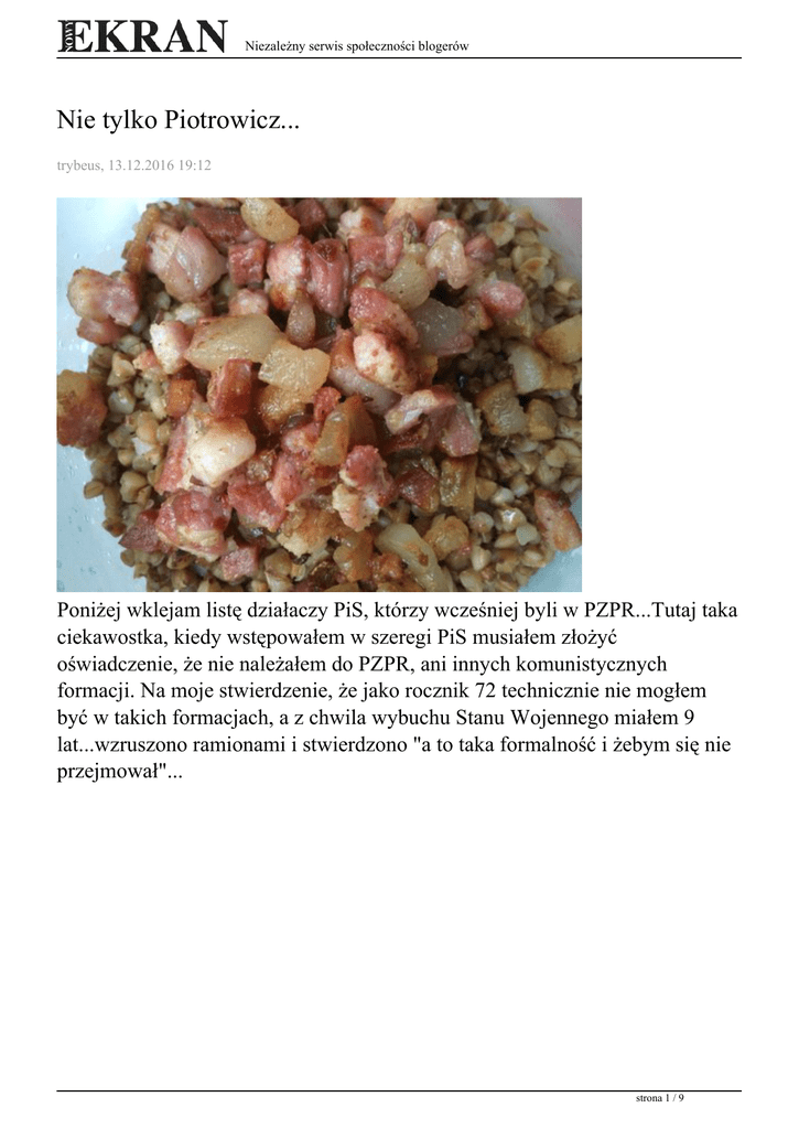 Niezależny serwis społeczności blogerów Nie tylko Piotrowicz... trybeus, 13.12.2016 19:12 Poniżej wklejam listę działaczy PiS, którzy wcześniej byli w PZPR...Tutaj taka ciekawostka, kiedy wstępowałem w szeregi PiS musiałem złożyć oświadczenie, że nie należałem do PZPR, ani innych komunistycznych formacji. Na moje stwierdzenie, że jako rocznik 72 technicznie nie mogłem być w takich formacjach, a z chwila wybuchu Stanu Wojennego miałem 9 lat...wzruszono ramionami i stwierdzono "a to taka formalność i żebym się nie przejmował"... strona 1 / 9 Niezależny serwis społeczności blogerów Swego czasu jak wyciekły różne ciekawostki z szafy Lesiaka, ów właśnie pisał o szumnej dekomunizacji polskiej przestrzeni publicznej przez liderów Porozumienia Centrum, czyli braci Kaczyńskich...cytuję: ""Porozumienie Centrum" wyróżnia się spośród innych dużych ugrupowań o solidarnościowym rodowodzie radykalną linią polityczną wyrażającą się nade wszystko, ujętą w uchwale nr 5 Kongresu Założycielskiego PC (marzec 1991 r.), ideą rozrachunku z przeszłością, tzw. ideą dekomunizacji. (...)W przeświadczeniu działaczy PC hasło dekomunizacji stanowi polityczną przeciwwagę dla tzw. "koncepcji grubej kreski" wylansowanej w 1991 r. przez lidera Unii Demokratycznej Tadeusza MAZOWIECKIEGO. Warto zaznaczyć, że wrogość PC wobec UD utrzymuje się nadal, czego świadectwem jest niedawna wypowiedź v-ce przewodniczącego PC L.DORNA dotycząca gabinetu H.SUCHOCKIEJ określająca go jako rząd "cichej, ale realnej ugody z układem postkomunistycznym". Należy podkreślić, iż samo hasło dekomunizacji, pomimo powołania już w 1991 r. komisji do opracowania konkretyzującej je ustawy, pozostaje w dalszym ciągu hasłem abstrakcyjnym. W łonie PC istnieją poważne rozbieżności, co do strona 2 / 9 Niezależny serwis społeczności blogerów ewentualnej jego wykładni. Nie wiadomo kogo i w jaki sposób ewentualna dekomunizacja miałaby obejmować. " Więcej pod linkiem... http://wiadomosci.wp.pl/kat,1342,title,UOP-liderzy-Porozumienia-Centrum-cy niczni-i-skorumpowani,wid,8543955,wiadomosc.html?ticaid=11841b No więc dziś widzimy jak na dłoni, że hasła o dekomunizacji były faktycznie tylko populistycznymi, które musiały wtedy mieć siłę rażenia...przecież wszyscy w kraju chcieli końca komuny... Zamiast odsunąć faktycznie skompromitowanych od władzy, oraz od pełnienia jakiejkolwiek funkcji publicznych to się ich przygarnia... strona 3 / 9 Niezależny serwis społeczności blogerów 1. Andrzej Kryże – Wiceminister Sprawiedliwości IV RP- członek PZPR do jej końca. Skazywał działaczy opozycji w stanie wojennym. 2. Wojciech Jasiński – Minister Skarbu IV RP, członek PZPR w latach 1976-1981, szef Wydziału Spraw Wewnętrznych w Płockim Urzędzie Miasta, przybudówki SB. Zasłynął umorzeniem milionowych długów PC, byłej partii Jarosława Kaczyńskiego. 3. Karol Karski (PiS) – działacz władz centralnych socjalistycznego ZSP na Wydziale Prawa i Administracji UW. Pod koniec lat 80 startował z poparcia PRON (organizacji utworzonej przez PZPR w stanie wojennym) w wyreżyserowanych i sfałszowanych przez komunistów wyborach do rad narodowych. 4. Andrzej Aumiller – Minister Budownictwa IV RP, zasłużony komunista, wieloletni członek PZPR. 5. Anna Kalata – Minister Pracy i Polityki Społecznej IV RP. Członek PZPR strona 4 / 9 Niezależny serwis społeczności blogerów jak i SLD, a dalej w Samoobronie. 6. Zbigniew Graczyk – Wiceminister Gospodarki Morskiej IV RP – przez 20 lat należał do PZPR będąc między innymi członkiem jej Komitetu Wojewódzkiego w Szczecinie. Był również w kierownictwie nomenklaturowej spółki Interster, która była folwarkiem partyjnych dygnitarzy, m. in. Sekuły i Rakowskiego. 7. Marek Grabowski – Wiceminister Zdrowia IV RP (członek PZPR i SLD) dzięki rekomendacji SLD był zastępcą głównego inspektora sanitarnego w rządach Leszka Millera i Marka Belki. 8. Ewa Sowińska – Rzecznik Praw Dziecka IV RP. W latach 1977-1980 należała do PZPR. 9. Krzysztof Zaręba – Wiceminister Środowiska IV RP, były członek PZPR, od 2005 roku w Samoobronie. strona 5 / 9 Niezależny serwis społeczności blogerów 10. Bogdan Socha – Wiceminister Pracy i Polityki Społecznej IV RP – był do samego końca członkiem PZPR. 11. Romuald Poliński – kolejny Wiceminister Pracy i Polityki Społecznej IV RP. Przez wiele lat członek PZPR, a w rządach SLD doradca ministra Kołodki 12. Maciej Łopiński – Rzecznik Prezydenta IV RP; w okresie 1975 – grudzień 1981 należał do PZPR 13. Ryszard Siewierski – Zastępca Komendanta Głównego Policji IV RP – członek PZPR do końca (1990). 14. Stanisław Kostrzewski – od 25.02.2006 skarbnik i finansista PiS – był aktywnym członkiem PZPR do końca jej działalności. 15. Henryk Biegalski – nominowany na szefa Centralnego Zarządu Służby strona 6 / 9 Niezależny serwis społeczności blogerów Więziennej IV RP, był członkiem PZPR od 1969 r. do końca lat 80. 16. Jerzy Bahr – 19.05.2006 mianowany ambasadorem RP w Moskwie. W latach 1976 – 1980 w randze I sekretarza pracował w Ambasadzie PRL w Bukareszcie. Do stanu wojennego był członkiem PZPR. 17. Krzysztof Czabański – mianowany 01.07.2006 na prezesa Polskiego Radia S.A. – były dziennikarz m.in. ‚Sztandaru Młodych’ i ‚Zarzewia’. W latach 1967-1980 należał do PZPR. 18. Stanisław Podlewski – mianowany 17.07.2006 dyrektorem departamentu rybołówstwa w ministerstwie rolnictwa – należał do PZPR do końca jej istnienia. 19. Marcin Wolski – 21.07.2006 mianowany został dyrektorem I programu PR – od 1975 roku do końca był w PZPR, będąc m.in. sekretarzem POP w PR. strona 7 / 9 Niezależny serwis społeczności blogerów 20. Jan Sulmicki – kandydat na prezesa Narodowego Banku Polskiego, zgłoszony 11.12.2006 przez Kaczyńskiego – były aktywista PZPR w SG