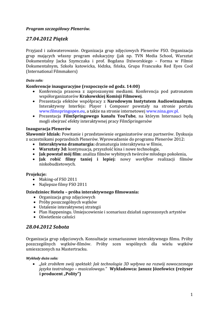 Program szczegółowy Plenerów. 27.04.2012 Piątek Przyjazd i zakwaterowanie. Organizacja grup zdjęciowych Plenerów FSO. Organizacja grup mających własny program edukacyjny (jak np. TVN Media School, Warsztat Dokumentalny Jacka Szymczaka i prof. Bogdana Dziworskiego – Forma w Filmie Dokumentalnym, Szkoła katowicka, łódzka, fińska, Grupa Francuska Red Eyes Cool (International Filmmakers) Duża sala: Konferencje inauguracyjne (rozpoczęcie od godz. 14:00) Konferencja prasowa z zaproszonymi mediami. Konferencja pod patronatem współorganizatorów Krakowskiej Komisji Filmowej. Prezentacja efektów współpracy z Narodowym Instytutem Audiowizualnym. Interaktywny Interfejs: Player i Composer powstały na stronie portalu www.filmspringopen.eu, a także na stronie internetowej www.nina.gov.pl. Prezentacja FilmSpringowego kanału YouTube, na którym Internauci będą mogli obejrzeć efekty interaktywnej pracy FilmSpringersów Inauguracja Plenerów Sławomir Idziak: Powitanie i przedstawienie organizatorów oraz partnerów. Dyskusja z uczestnikami poprzednich Plenerów. Wprowadzenie do programu Plenerów 2012: Interaktywna dramaturgia: dramaturgia interaktywna w filmie, Warsztaty 3d: kontynuacja, przyszłość kina i nowe technologie, Jak powstał mój film: analiza filmów wybitnych twórców młodego pokolenia, Jak robić filmy taniej i lepiej: nowy workflow realizacji filmów niskobudżetowych. Projekcje: Making-of FSO 2011 Najlepsze filmy FSO 2011 Dziedziniec Hotelu – próba interaktywnego filmowania: Organizacja grup zdjęciowych Próby poszczególnych wątków Ustalenie interaktywnej strategii Plan Happeningu. Umiejscowienie i scenariusz działań zaproszonych artystów Oświetlenie całości 28.04.2012 Sobota Organizacja grup zdjęciowych. Konsultacje scenariuszowe interaktywnego filmu. Próby poszczególnych wątków-filmów. Próby scen wspólnych dla wielu wątków umieszczonych na Mastertracku. Wykłady duża sala: „Jak zrobiłem swój spektakl: Jak technologia 3D wpływa na rozwój nowoczesnego języka teatralnego – musicalowego.” Wykładowca: Janusz Józefowicz (reżyser i producent „Polity”) 1 Projekcja Making-of „Polita” pierwszego na świecie musicalu łączącego żywego aktora z projekcją 3D „Dramaturgia interaktywna w grach komputerowych. Jaka jest przyszłość nowego formatu widowiska filmowego?”. Wykładowcy CD Projekt RED: Paweł Świerszczyński (odpowiedzialny za cut-sceny), Sebastian Stępień (Story Lead), Marcin Blacha (Story Writer). Twórcy gry „Wiedźmin 2 (The Witcher): Zabójcy królów”. Dziedziniec Hotelu – Film Spring Night Fever W trakcie występu muzycznego rejestrowanego przez Telewizję TVN nasi uczestnicy kręcą swoje filmy (w szczególności plany ogólne); Muzyka na żywo: zespół muzyczny HiPiersoniK – ambient-jazz z elementami reggae, funk i noise; Na widowni równocześnie odbywa się happening zaproszonych artystów. (Lista zaproszonych Artystów i ich prezentacji do ustalenia.) 29.04.2012 Niedziela Wstępny montaż nakręconego materiału. W szczególności wysp interaktywnych (scen wspólnych) i wgrywanie klipów do Interaktywnego Playera. Konsultacje (wszyscy wykładowcy są do dyspozycji uczestników Plenerów). Media Desk Polska indywidualne konsultacje: Możliwości finansowania projektów filmowych (development i produkcja) oferowane przez Komisję Europejską Program MEDIA. Wykłady duża sala: „Kino 3D nowe wyzwania, nowe szanse. Nowości technologiczne 3D na podstawie niemieckiego filmu „Measuring the world” w 3D reż. Detlev Buck zrealizowanego w 2011/2012 przez wykładowców i uczestników FSO 2011”. Wykładowcy: Detlev Buck (reżyser), Sławomir Idziak (DOP), Andrzej Waluk (stereografer), Łukasz Baka (stereografer), Daniele Siragusano (stereografer), Andrzej Cichocki (operator), Robert Chaciński (digital image technician), Jan Sadowski (operator). Projekcja wybranych scen z filmów „Measuring the world” oraz „Bitwa Warszawska 1920” Zajęcia praktyczne: Do dyspozycji uczestników Plenerów będzie sprzęt i oprogramowanie Partnerów technologicznych: Panasonic Europe, Sony Europe, Canon Polska, Hewlett-Packard, Adobe Systems, RCS Systemy Komputerowe Apple Authorized Reseller, Screen Plane GmbH, FGV Schmidle, Zodiak Jerzy Hoffman Film Production, Luks Film Prezentacje sprzętowe (nowe kamery, rigi, narzędzia postprodukcyjne i opis workflow). Prowadzący: Andrzej Waluk, Łukasz Baka, Robert Chaciński, Jan Sadowski. Praktyczne przygotowanie rigu 3D do zdjęć. Zajęcia praktyczne z kamerami i rigiem 3D. Prowadzący: Kaspar Kallas, Andrzej Waluk, Łukasz Baka. 2 Projekcje: Filmy 3D zrealizowane przez naszych uczestników w 2011 roku: a) „Labirynt” – scenariusz i reżyseria: Agnieszka Kowalczyk, b) Pozostałe projekcje filmów uczestników, którzy po Warsztatach 3D w 2011 r. podjęli prób filmowania w nowej technologii (do ustalenia: Oskar Rodriguez Alves – teledyski, Grzegorz Korczak – debiut, 3D Mind Films etc.) c) „FilmSpringersi” – Projekcja filmu dokumentującego Warsztaty 3D 2011 reż. Jacek Szymczak (TVN) Projekcja materiałów zdjęciowych 3D z technicznych prób uczestników; Projekcje filmów uczestników warsztatów. Dziedziniec Hotelu – Film Spring Night Fever Powtórka (w mniejszej skali) koncertu zespołu muzycznego HiPiersoniK. Impreza tylko dla ekip realizacyjnych FSO. Kontynuacja realizacji filmów. Filmowanie tych ujęć, które były niemożliwe do zrealizowania w trakcie normalnego widowiska z publicznością. 30.04.2012 Poniedziałek Projekt Interaktywny - Montaż nakręconego materiału i wgrywanie klipów do Interaktywnego Playera. Konsultacje z zespołem programistów. Wykłady duża sala: „Stereoskopowa percepcja i postrodukcja”. Wykładowca: Daniele Siragusano, Cinepostproduction GmBH Projekcja klipów 3D z filmu „Measuring the world” „Niskobudżetowa produkcja filmów w technologii 3D. Workflow 3D od pomysłu do kina”. Wykł