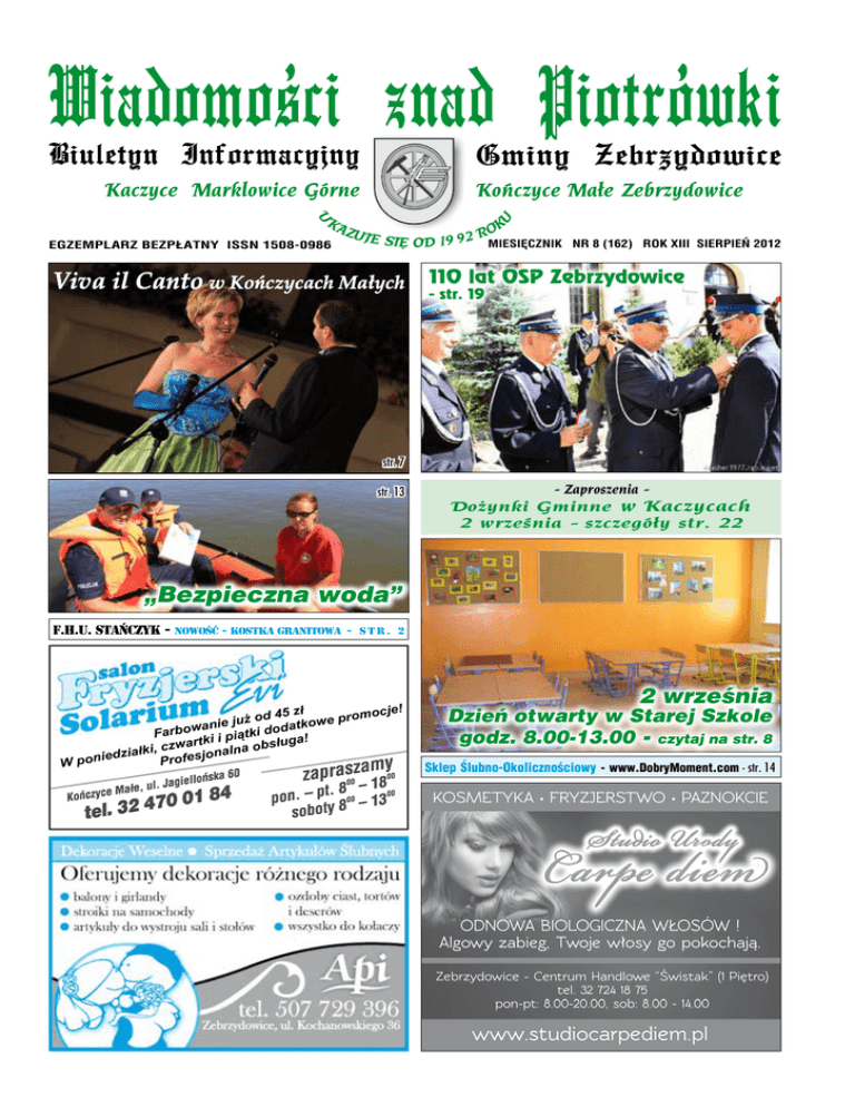 MIESIĘCZNIK NR 8 (162) ROK XIII SIERPIEŃ 2012 egzemplarz bezp£atny ISSN 1508-0986 Viva il Canto w Kończycach Małych 110 lat OSP Zebrzydowice - str. 19 str. 7 str. 13 - Zaproszenia - Dożynki Gminne w Kaczycach 2 września - szczegóły str. 22 „Bezpieczna woda” F.H.U. Stañczyk - nowość - kostka granitowa W - str. 2 ! 45 zł mocje już od atkowe pro ie n a w d Farbo i i piątki do a! g rtk łu a s w b z o c iałki, nalna z d jo s ie e n f po Pro 2 września Dzień otwarty w Starej Szkole godz. 8.00-13.00 - czytaj na str. 8 Sklep Ślubno-Okolicznościowy - www.DobryMoment.com - str. 14 Wiadomoœci znad Piotrówki 1 Skład jest czynny: od pn.-pt. 7.00 - 16.00 w soboty od 7.00 do 13.00 www.fhustanczyk.pl PIASEK SZCZAKOWA - do tynku wewnętrznego PIASEK PŁUKANY KOTLARNIA - do tynku zewnętrznego PIASEK PŁUKANY BUKÓW - do wylewek PIASEK NA PODSYPKĘ Węgiel: Orzech - Piast, Orzech - Marcel MIESZANKA BUKÓW - POSPÓŁKA ŻWIR BUKÓW (do drenażu) - granulacja - 8-16 Eko groszek - Chwałowice Eko groszek - Bobrek ŻWIR DEKORACYJNY BRĄZOWO BIAŁY - granulacja - 16 do 32 Muł - Rydułtowy KAMIEŃ LESZNA Flot - Marcel Żagiel Transport przy zakupie już 1 tony opału Na terenie gminy - gratis! - tłuczeń - granulacja 31,5 do 63 Oferujemy węgiel workowany Groszek - eko- kliniec - granulacja 16 do 31,5 groszek (na paletach) z rozładunkiem za pomocą HDS-u! PRAKTYCZNIE I WYGODNIE - kliniec - granulacja 4 do 20 Dodatkowa promocja !!! Transport przy zakupie opału powyżej 2 ton na terenie: Transport materiałów sypkich powyżej 5 t na terenie całej gminy Zebrzydowice - gratis! GRATIS ! kostka granitowa rudo-szara 8 x 11 Kostka granitowa - kostka szara - kostka rudo-szara - kostka czarna - kostka czerwona grYSY KOLOROWE - biały, różowy, zielony, szary Obrzeża granitowe 40 x 20 Obrzeża granitowe 100 x 20 Kamień murowy granitowy Zasypka granitowa 2 Wiadomoœci znad Piotrówki NA RATY - kamień czerwony - granulacja 10 do 16 Brzezówka, Pogwizdów, Hażlach, Pruchna, Kończyce Wielkie, Ruptawa, Cisówka, Pielgrzymowice i Bzie W ypr z eda ż: , opał, piasek, kamień . kostka granitowa itp tel. 32 469 35 82 Wyprzedaż: art. metalowe: zasuwy, zamki, zawiasy, klamki, wiertła, kłódki, tarcze do cięcia metalu i inne, drut do spawania,elektrody. BAR LICENCJONOWANY FHU „STANCZYK” CZYNNE: od pn. do sob. 10.00-22.00, niedziela 12.00-22.00, tel. 32 469 10 39 W a r s z a w a - B o e r n e r o w o : Płk. pil. Bernard Adamecki patronem jednego z warszawskich rond W czwartek, 26 lipca 2012 odbyły się uroczystości nadania nazwy „RONDO BERNARDA ADAMECKIEGO” na skrzyżowaniu ulic Radiowej i gen. S. Kaliskiego w Warszawie wraz z odsłonięciem tablicy upamiętniającej bohaterstwo pułkownika pilota Bernarda Adameckiego. Bernard Adamecki urodził się w Marklowicach Dolnych gdzie uczęszczał do szkoły powszechnej w Marklowicach Dolnych. Na uroczystości zostali zaproszeni również przedstawiciele naszej gminy – Wójt Andrzej Kondziołka, radny powiatowy Janusz Król oraz sołtys Marklowic Górnych, Tadeusz Guz. Poniżej przedruk artykułu dotyczący uroczystości pana Krzysztofa Stępkowskiego ze stronywww. ordynariat.wp.mil.pl Rondo upamiętniające płk. pil. Bernarda Adameckiego otwarto dziś na warszawskim Boernerowie. Był to pierwszy akcent tegorocznych obchodów 68. rocznicy wybuchu Powstania Warszawskiego. Uroczystość otwarcia ronda poprzedził apel pamięci pod tablicą żołnierzy oddziału „Żywiciel”, poległych w rejonie Boernerowa, oraz Msza św. w kościele Matki Bożej Ostrobramskiej. Płk Adamecki był żołnierzem AK, pilotem i komendantem Wojskowej Szkoły Technicznej na Boernerowie, poprzedniczki WAT. Eucharystię celebrowali ks. płk. Jana Domian, proboszcz parafii i ks. por. Ireneusz Birek. - Sześćdziesiąt osiem lat minęło od tamtych wydarzeń, kiedy lud Warszawy poczuł wolność w swoich sercach i umysłach, kiedy rozpoczął nierówną walkę z okupantem hitlerowskim - mówił podczas Mszy św. ks. płk Domian. Kapelan podkreślił, że wspólnota parafialna z Boernerowa przechowuje we wdzięcznej pamięci żołnierzy obwodu AK „Żywiciel”, którzy walczyli na Żoliborzu i w okolicach Bemowa. - Gromadząc się na tej Eucharystii pragniemy polecać ich wszystkich miłosiernemu Bogu, aby przyjął ich do swojej chwały i obdarzył ich łaską życia wiecznego. Jesteśmy im to winni, za to, że żyjemy w wolnym kraju, w tym nieujarzmionym mieście - powiedział. Ks. Domian przypomniał, że po Mszy św. odsłonięta zostanie na pobliskim rondzie tablica informująca o nadaniu skrzyżowaniu imienia płk. pil. Bernarda Adameckiego. - W duchu wdzięczności i pamięci chcemy wspomnieć tego znamienitego oficera, komendanta Wojskowej Szkoły Technicznej, uczelni, która powstała wcześniej niż WAT. Oby po tylu latach nieobecności na kartach historii, nie znamy przecież nawet jego miejsca pochówku, wrócił tutaj gdzie mieszkał, jako patron ronda na skrzyżowaniu ulica Kaliskiego i Radiowej. Pamięć o nim jest szczególnie ważna tu, wśród tylu jednostek wojskowych i uczelni znajdujących się na Bemowie- powiedział. Proboszcz parafii zachęcał obecnych na Mszy św. studentów podchorążych WAT, aby poznali historię życia płk. Adameckiego i kierowali się jego przykładem. - Niech będzie dla was wzorem wierności służbie, honorowi i Ojczyźnie. Obyście dobrze wykorzystywali dar wolności naszej Ojczyzny- zachęcał. We Mszy św. uczestniczyli przedstawiciele środowisk powstańczych, Wojskowej Akademii Technicznej, Dowództwa Garnizonu Warszawa, jednostek wojskowych znajdujących się na terenie parafii, władz samorządowych, kombatanci i harcerze oraz parafianie. W uroczystościach wzięli udział członkowie rodziny płk. Adameckiego oraz delegacja jednej z dzielnic Budapesztu, współpracująca na poziomie samorządu z dzielnicą Bemowo. Po Mszy św. wierni udali się na skrzyżowanie ulic Radiowej i Kaliskiego, gdzie odby