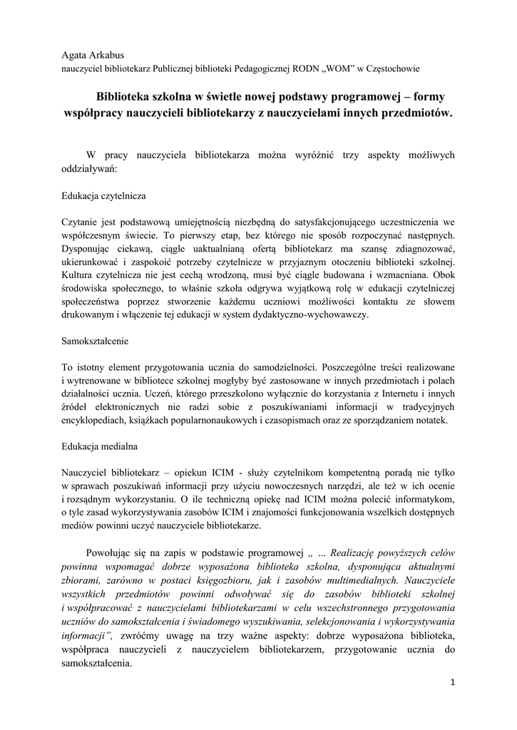 Agata Arkabus nauczyciel bibliotekarz Publicznej biblioteki Pedagogicznej RODN „WOM” w Częstochowie Biblioteka szkolna w świetle nowej podstawy programowej – formy współpracy nauczycieli bibliotekarzy z nauczycielami innych przedmiotów. W pracy nauczyciela bibliotekarza można wyróżnić trzy aspekty możliwych oddziaływań: Edukacja czytelnicza Czytanie jest podstawową umiejętnością niezbędną do satysfakcjonującego uczestniczenia we współczesnym świecie. To pierwszy etap, bez którego nie sposób rozpoczynać następnych. Dysponując ciekawą, ciągle uaktualnianą ofertą bibliotekarz ma szansę zdiagnozować, ukierunkować i zaspokoić potrzeby czytelnicze w przyjaznym otoczeniu biblioteki szkolnej. Kultura czytelnicza nie jest cechą wrodzoną, musi być ciągle budowana i wzmacniana. Obok środowiska społecznego, to właśnie szkoła odgrywa wyjątkową rolę w edukacji czytelniczej społeczeństwa poprzez stworzenie każdemu uczniowi możliwości kontaktu ze słowem drukowanym i włączenie tej edukacji w system dydaktyczno-wychowawczy. Samokształcenie To istotny element przygotowania ucznia do samodzielności. Poszczególne treści realizowane i wytrenowane w bibliotece szkolnej mogłyby być zastosowane w innych przedmiotach i polach działalności ucznia. Uczeń, którego przeszkolono wyłącznie do korzystania z Internetu i innych źródeł elektronicznych nie radzi sobie z poszukiwaniami informacji w tradycyjnych encyklopediach, książkach popularnonaukowych i czasopismach oraz ze sporządzaniem notatek. Edukacja medialna Nauczyciel bibliotekarz – opiekun ICIM - służy czytelnikom kompetentną poradą nie tylko w sprawach poszukiwań informacji przy użyciu nowoczesnych narzędzi, ale też w ich ocenie i rozsądnym wykorzystaniu. O ile techniczną opiekę nad ICIM można polecić informatykom, o tyle zasad wykorzystywania zasobów ICIM i znajomości funkcjonowania wszelkich dostępnych mediów powinni uczyć nauczyciele bibliotekarze. Powołując się na zapis w podstawie programowej „ ... Realizację powyższych celów powinna wspomagać dobrze wyposażona biblioteka szkolna, dysponująca aktualnymi zbiorami, zarówno w postaci księgozbioru, jak i zasobów multimedialnych. Nauczyciele wszystkich przedmiotów powinni odwoływać się do zasobów biblioteki szkolnej i współpracować z nauczycielami bibliotekarzami w celu wszechstronnego przygotowania uczniów do samokształcenia i świadomego wyszukiwania, selekcjonowania i wykorzystywania informacji”, zwróćmy uwagę na trzy ważne aspekty: dobrze wyposażona biblioteka, współpraca nauczycieli z nauczycielem bibliotekarzem, przygotowanie ucznia do samokształcenia. 1 Dobrze wyposażona biblioteka. W kontekście nowej podstawy programowej należy ustalić, z jakich źródeł chcą korzystać czytelnicy, czy zbiory są kompletne, czy centrum multimedialne zapewnia stosowny dostęp do nich. Przegląd dokumentu pozwala wstępnie określić, po jakie materiały będą przychodzić uczniowie i nauczyciele na wszystkich etapach kształcenia. Pamiętać należy, że źródła wiedzy wymienione na poprzednim etapie kształcenia będą również wykorzystywane w czasie bieżącej nauki (np. słownik ortograficzny wymieniony jest tylko w podstawie klas IV-VI, ale uczniowie gimnazjum i liceum nadal będą z niego korzystać, mimo, że podstawa programowa nie zawiera o nim wzmianki). Współpraca nauczycieli z nauczycielem bibliotekarzem. Warto przede wszystkim zwrócić uwagę na zapisy w podstawie programowej, które dotyczą kształtowanie kompetencji ponadprzedmiotowych np.: wyszukiwania informacji, analizowania ich i przetwarzania, współdziałania w zespole, rozumowania, interpretacji tekstów. Ich znajomość może skłonić zespół nauczycieli do wytyczenia obszarów wspólnej działalności, inicjowania projektów międzyprzedmiotowych, do skorelowania treści. O współpracy należy pomyśleć już na etapie planowanych działań na przyszły rok szkolny. Orientacje co do zakresu współpracy można zyskać w drodze ustnych ustaleń lub dokonując planowanej diagnozy potrzeb w tym zakresie. Rozmowa z nauczycielem może odbyć się z wykorzystaniem wykazu wymagań edukacyjnych – podstawy programowej przedmiotu nauczanego przez nauczyciela lub zestawieniem wymagań interesujących bibliotekarza. Diagnoza potrzeb nauczycieli pozwoli ukierunkować pracę biblioteki tak, by jej oferta została wykorzystana w racjonalny sposób. Wybór form współpracy uzależniony jest od bieżących potrzeb i możliwości szkoły, przede wszystkim zaś od wspólnej decyzji nauczycieli bibliotekarzy i nauczycieli innych specjalności. Wśród form współpracy możemy wyróżnić:  Zajęcia wyrównawcze. Bibliotekarze mogą zorganizować zajęcia wyrównawcze dla uczniów, którym brak umiejętności korzystania ze źródeł informacji. Cykl zajęć wyrównawczych może dotyczyć wyszukiwania, przetwarzania i tworzenia informacji oraz korzystania z nich podczas nauki. Wielu nauczycieli w miarę swoich możliwości stara się niwelować niedobory edukacyjne podczas własnych lekcji. Jeżeli niedobory te wynikają z braku umiejętności korzystania z informacji, ze złej organizacji samokształcenia, to bibliotekarz może wspomóc w tym zakresie pracę innych nauczycieli. Bibliotekarz może wówczas samodzielnie planować i prowadzić ćwiczenia z grupa uczniów, będzie odpowiedzialny za proces kształcenia i jego wyniki. Na decyzję, jacy uczniowie potrzebują dodatkowych ćwiczeń i w jakim zakresie, ma wpływ opinia nauczyciela na co dzień pracującego z klasą. 2  Wspólne lekcje. Wśród działań podejmowanych w ramach współpracy mogą znaleźć się lekcje prowadzone przez nauczyciela przedmiotu i nauczyciela bibliotekarza w ICIM lub bibliotecznej czytelni, z wykorzystaniem zgromadzonych tam materiałów i sprzętu. Dzięki wspólnym lekcjom młodzież może zostać zaangażowana w ćwiczenia, przem