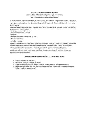REKRUTACJA DO 1 KLASY SPORTOWEJ Zespołu Szkół Mistrzostwa Sportowego w Poznaniu o profilu nowoczesny taniec sportowy. • W klasach I-III o profilu sportowym realizowany jest autorski program nauczania i obejmuje : - przygotowanie ogólnorozwojowe : wytrzymałość, szybkość, skoczność, gibkość, zwinność, koordynacja, - techniki tańca nowoczesnego: hip-hop, dancehall, break Dance, poppin’, house, disco slow, Dance show, fantasy show… - techniki tańca jazz’owego, - modern, - techniki uzupełniające barre au sol, - taniec klasyczny, - wiedza o tańcu. •Zawodnicy z klas sportowych są członkami Polskiego Związku Tańca Sportowego, oraz Klubu i zobowiązani są do wpłacania składki członkowskiej ustalanej przez Zarząd na każdy rok. •Klasy sportowe biorą udział w pokazach, zawodach sportowych rangi krajowej i międzynarodowej, mają możliwość udziału w obozach sportowych letnich i zimowych organizowanych przez Klub. WARUNKI PRZYJĘCIA UCZNIÓW DO KLASY SPORTOWEJ • • • • bardzo dobry stan zdrowia; zaliczanie prób sprawności fizycznej; ujawnione predyspozycje do uprawiania nowoczesnego tańca sportowego; zaświadczenie lekarskie o braku przeciwwskazań do uprawiania tańca sportowego (lekarz medycyny sportowej) ZASADY REKRUTACJI UCZNIÓW DO KLASY TANECZNEJ Warunkiem przyjęcia do klasy tanecznej jest: 1. Udział w teście sprawności sportowej, którego będą dokonywać przedstawiciele Klubu, nauczyciel tańca, instruktor prowadzący. Sprawdzeniu będą podlegać predyspozycje z zakresu: • • • • • • • Bieg 4 x 10 m Bieg na 50 m Bieg na 600 m Skok w dal z miejsca Siady z leżenia Skłon tułowia Prezentacja taneczna indywidualna (nie obowiązkowa) Istotnym warunkiem przyjęcia jest brak przeciwwskazań zdrowotnych do podejmowania przez dziecko dodatkowego wysiłku fizycznego. KRYTERIA EGZAMINU SPRAWNOŚCIOWEGO (do 90 punktów) A Testy sprawności sportowej B Prezentacja taneczna 0- 90 punktów 0- 10 punktów Testy sprawności sportowej od 0 do 90 pkt. • • • • • • Bieg 4 x 10 m od 0-15 pkt. Bieg na 50 m od 0-15 pkt. Bieg na 600 m od 0-15 pkt. Skok w dal z miejsca od 0-15 pkt. Siady z leżenia od 0-15 pkt. Skłon tułowia od 0-15 pkt. Testy sprawności specjalnej (taniec) od 0 do 10 pkt. • • Prezentacja taneczna w układzie solowym 1 min. (nieobowiązkowa) od 0-5 pkt. Autoprezentacja poświadczone dyplomami sukcesy taneczne od 0-2 pkt. wrażenia z rozmowy na temat tańca z kandydatem/ką od 0- 3 pkt. BEZ OBAW ! :) Kandydatki i kandydaci prezentują się solowo nieobowiązkowo jako sprawdzian koordynacji ruchowej i poczucia rytmu. Określone zostają uzdolnienia taneczne i warunki psychofizyczne do uprawiania tańca sportowego.