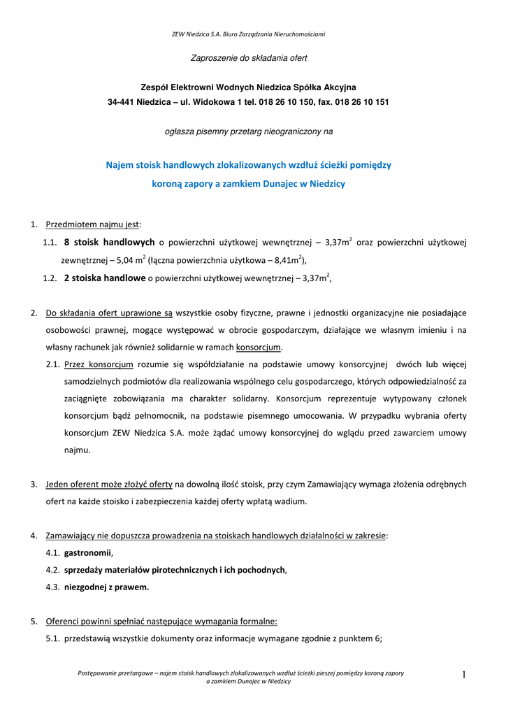 ZEW Niedzica S.A. Biuro Zarządzania Nieruchomościami Zaproszenie do składania ofert Zespół Elektrowni Wodnych Niedzica Spółka Akcyjna 34-441 Niedzica – ul. Widokowa 1 tel. 018 26 10 150, fax. 018 26 10 151 ogłasza pisemny przetarg nieograniczony na Najem stoisk handlowych zlokalizowanych wzdłuż ścieżki pomiędzy koroną zapory a zamkiem Dunajec w Niedzicy 1. Przedmiotem najmu jest: 1.1. 8 stoisk handlowych o powierzchni użytkowej wewnętrznej – 3,37m2 oraz powierzchni użytkowej zewnętrznej – 5,04 m2 (łączna powierzchnia użytkowa – 8,41m2), 1.2. 2 stoiska handlowe o powierzchni użytkowej wewnętrznej – 3,37m2, 2. Do składania ofert uprawione są wszystkie osoby fizyczne, prawne i jednostki organizacyjne nie posiadające osobowości prawnej, mogące występować w obrocie gospodarczym, działające we własnym imieniu i na własny rachunek jak również solidarnie w ramach konsorcjum. 2.1. Przez konsorcjum rozumie się współdziałanie na podstawie umowy konsorcyjnej dwóch lub więcej samodzielnych podmiotów dla realizowania wspólnego celu gospodarczego, których odpowiedzialność za zaciągnięte zobowiązania ma charakter solidarny. Konsorcjum reprezentuje wytypowany członek konsorcjum bądź pełnomocnik, na podstawie pisemnego umocowania. W przypadku wybrania oferty konsorcjum ZEW Niedzica S.A. może żądać umowy konsorcyjnej do wglądu przed zawarciem umowy najmu. 3. Jeden oferent może złożyć oferty na dowolną ilość stoisk, przy czym Zamawiający wymaga złożenia odrębnych ofert na każde stoisko i zabezpieczenia każdej oferty wpłatą wadium. 4. Zamawiający nie dopuszcza prowadzenia na stoiskach handlowych działalności w zakresie: 4.1. gastronomii, 4.2. sprzedaży materiałów pirotechnicznych i ich pochodnych, 4.3. niezgodnej z prawem. 5. Oferenci powinni spełniać następujące wymagania formalne: 5.1. przedstawią wszystkie dokumenty oraz informacje wymagane zgodnie z punktem 6; Postępowanie przetargowe – najem stoisk handlowych zlokalizowanych wzdłuż ścieżki pieszej pomiędzy koroną zapory a zamkiem Dunajec w Niedzicy 1 ZEW Niedzica S.A. Biuro Zarządzania Nieruchomościami 5.2. dokonają wpłaty wadium, na każde stoisko w wysokości 2 000,00 złotych (słownie: dwa tysiące złotych) przelewem na konto Wynajmującego w banku PKO S.A. o/ Nowy Targ nr konta: 10 1240 1574 1111 0000 0790 1809 lub gotówką w kasie ZEW Niedzica S.A. (np. Oferent, który składa dwie oferty na dwa stoiska handlowe dokonuje wpłaty wadium w wysokości 2 x 2 000,00 złotych tj. 4 000,00 złotych) 5.2.1. wadium musi być wniesione przed upływem terminu składania ofert. 5.2.2. w przypadku wnoszenia wadium przelewem na rachunek bankowy o terminie jego wniesienia decydować będzie data uznania rachunku bankowego Zamawiającego, a w przypadku wpłaty gotówki – termin wpłaty gotówki do kasy Wynajmującego. 5.2.3. wpłata musi zawierać wyraźne zaznaczenie, że dotyczy przedmiotowego postępowania, 5.3. wpłata wadium przepada na rzecz ZEW Niedzica S.A. w razie: 5.3.1. uchylania się przez Oferenta, który został wybrany w postępowaniu przetargowym, od podpisania umowy zgodnej z „Wzorem umowy najmu” w terminie określonym przez ZEW Niedzica S.A., 5.3.2. przedstawienia w ofercie nieprawdziwych danych, 5.3.3. gdy zawarcie umowy stało się niemożliwe z winy Oferenta, 5.4. nie zalegają z uiszczeniem podatków, opłat lub innych zobowiązań, które są zobowiązani na mocy obowiązujących przepisów prawa i stosownych umów uiszczać, w tym również dla ZEW Niedzica S.A (Formularz ofertowy - załącznik nr 2); 5.5. posiadają wszelkie wymagane prawem dokumenty potrzebne do prowadzenia działalności (Formularz ofertowy - załącznik nr 2); 5.6. złożą oświadczenie, że Oferent uważa się za związanego z ofertą przez okres 35 dni (Formularz ofertowy załącznik nr 2), 5.7. złożą oświadczenie, że akceptują „Wzór umowy najmu”, który stanowi załącznik nr 3 do niniejszej dokumentacji, 5.8. złożą oświadczenie, że wyrażają zgodę na przetwarzanie danych osobowych 5.9. oferta oraz wszystkie dokumenty z nią związane muszą być sporządzone pod rygorem nieważności w języku polskim w formie pisemnej. 6. Oferent zobowiązany jest przedstawić w treści oferty: 6.1. propozycję miesięcznej stawki netto obowiązującej w okresie od dnia 1 maja do 30 września 2014 roku (Formularz ofertowy – załącznik nr 2), 6.2. oświadczenie, że prowadzi działalność gospodarczą na podstawie aktualnego wpisu do ewidencji działalności gospodarczej oraz posiada wszelkie wymagane zezwolenia lub koncesje na prowadzenie działalności gospodarczej jeśli wymagają tego odrębne przepisy, 6.3. pisemne pełnomocnictwo dla osób uprawionych do podpisywania oferty i podejmowania zobowiązań w imieniu Oferenta, jeżeli osoby te nie są uwidocznione w odpisie z właściwego rejestru lub ewidencji Postępowanie przetargowe – najem stoisk handlowych zlokalizowanych wzdłuż ścieżki pieszej pomiędzy koroną zapory a zamkiem Dunajec w Niedzicy 2 ZEW Niedzica S.A. Biuro Zarządzania Nieruchomościami jako upoważnione do reprezentowania Oferenta. W przypadku gdy Oferentem jest konsorcjum, pełnomocnictwa muszą być podpisane przez wszystkich uprawionych reprezentantów członków konsorcjum. 6.4. krótki opis proponowanej działalności gospodarczej, 6.5. oświadczenie, że wyraża zgodę na przetwarzanie danych osobowych, 6.6. dołączyć dowód wpłaty wadium. 7. ZEW Niedzica S.A. oferuje po zawarciu umowy prowadzenie na przedmiocie najmu działalności gospodarczej z zachowaniem następujących warunków: 7.1. opłata podatku od nieruchomości – po stronie ZEW Niedzica S.A., 7.2. ubezpieczenie stoisk handlowe od ognia i innych zdarzeń losowych - po stronie ZEW Niedzica S.A., 7.3. ubezpieczenie towaru, mienia, wyposażenia od ewentualnej kradzieży, innego czynu niedozwolonego popełnionego przez osobę trzecią oraz innych 
