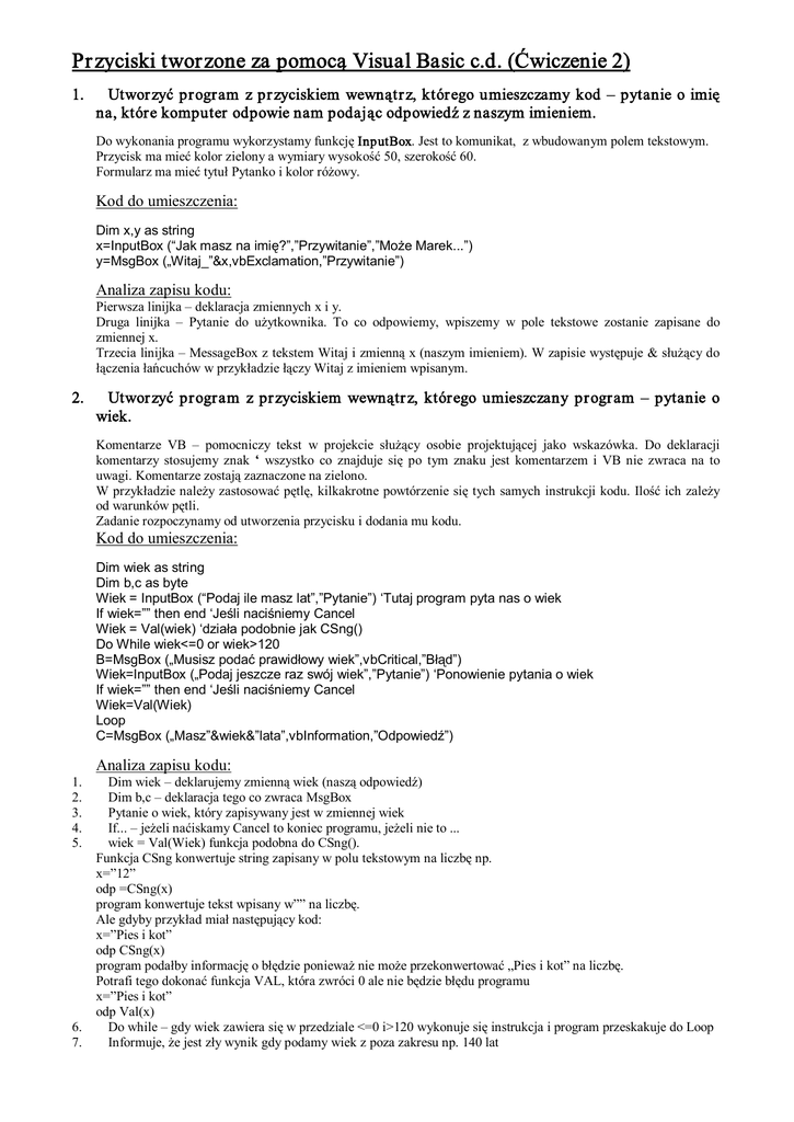 Pr zyciski tworzone za pomocą Visual Basic c.d. (Ćwiczenie 2) 1. Utwor zyć program z pr zyciskiem wewnątr z, którego umieszczamy kod – pytanie o imię na, które komputer odpowie nam podając odpowiedź z naszym imieniem. Do wykonania programu wykorzystamy funkcję InputBox. Jest to komunikat, z wbudowanym polem tekstowym. Przycisk ma mieć kolor zielony a wymiary wysokość 50, szerokość 60. Formularz ma mieć tytuł Pytanko i kolor różowy. Kod do umieszczenia: Dim x,y as string x=InputBox (“Jak masz na imię?”,”Przywitanie”,”Może Marek...”) y=MsgBox („Witaj_”&x,vbExclamation,”Przywitanie”) Analiza zapisu kodu: Pierwsza linijka – deklaracja zmiennych x i y. Druga linijka – Pytanie do użytkownika. To co odpowiemy, wpiszemy w pole tekstowe zostanie zapisane do zmiennej x. Trzecia linijka – MessageBox z tekstem Witaj i zmienną x (naszym imieniem). W zapisie występuje & służący do łączenia łańcuchów w przykładzie łączy Witaj z imieniem wpisanym. 2. Utwor zyć program z pr zyciskiem wewnątr z, którego umieszczany program – pytanie o wiek. Komentarze VB – pomocniczy tekst w projekcie służący osobie projektującej jako wskazówka. Do deklaracji komentarzy stosujemy znak ‘ wszystko co znajduje się po tym znaku jest komentarzem i VB nie zwraca na to uwagi. Komentarze zostają zaznaczone na zielono. W przykładzie należy zastosować pętlę, kilkakrotne powtórzenie się tych samych instrukcji kodu. Ilość ich zależy od warunków pętli. Zadanie rozpoczynamy od utworzenia przycisku i dodania mu kodu. Kod do umieszczenia: Dim wiek as string Dim b,c as byte Wiek = InputBox (“Podaj ile masz lat”,”Pytanie”) ‘Tutaj program pyta nas o wiek If wiek=”” then end ‘Jeśli naciśniemy Cancel Wiek = Val(wiek) ‘działa podobnie jak CSng() Do While wiek<=0 or wiek>120 B=MsgBox („Musisz podać prawidłowy wiek”,vbCritical,”Błąd”) Wiek=InputBox („Podaj jeszcze raz swój wiek”,”Pytanie”) ‘Ponowienie pytania o wiek If wiek=”” then end ‘Jeśli naciśniemy Cancel Wiek=Val(Wiek) Loop C=MsgBox („Masz”&wiek&”lata”,vbInformation,”Odpowiedź”) Analiza zapisu kodu: 1. 2. 3. 4. 5. Dim wiek – deklarujemy zmienną wiek (naszą odpowiedź) Dim b,c – deklaracja tego co zwraca MsgBox Pytanie o wiek, który zapisywany jest w zmiennej wiek If... – jeżeli naćiskamy Cancel to koniec programu, jeżeli nie to ... wiek = Val(Wiek) funkcja podobna do CSng(). Funkcja CSng konwertuje string zapisany w polu tekstowym na liczbę np. x=”12” odp =CSng(x) program konwertuje tekst wpisany w”” na liczbę. Ale gdyby przykład miał następujący kod: x=”Pies i kot” odp CSng(x) program podałby informację o błędzie ponieważ nie może przekonwertować „Pies i kot” na liczbę. Potrafi tego dokonać funkcja VAL, która zwróci 0 ale nie będzie błędu programu x=”Pies i kot” odp Val(x) 6. Do while – gdy wiek zawiera się w przedziale <=0 i>120 wykonuje się instrukcja i program przeskakuje do Loop 7. Informuje, że jest zły wynik gdy podamy wiek z poza zakresu np. 140 lat