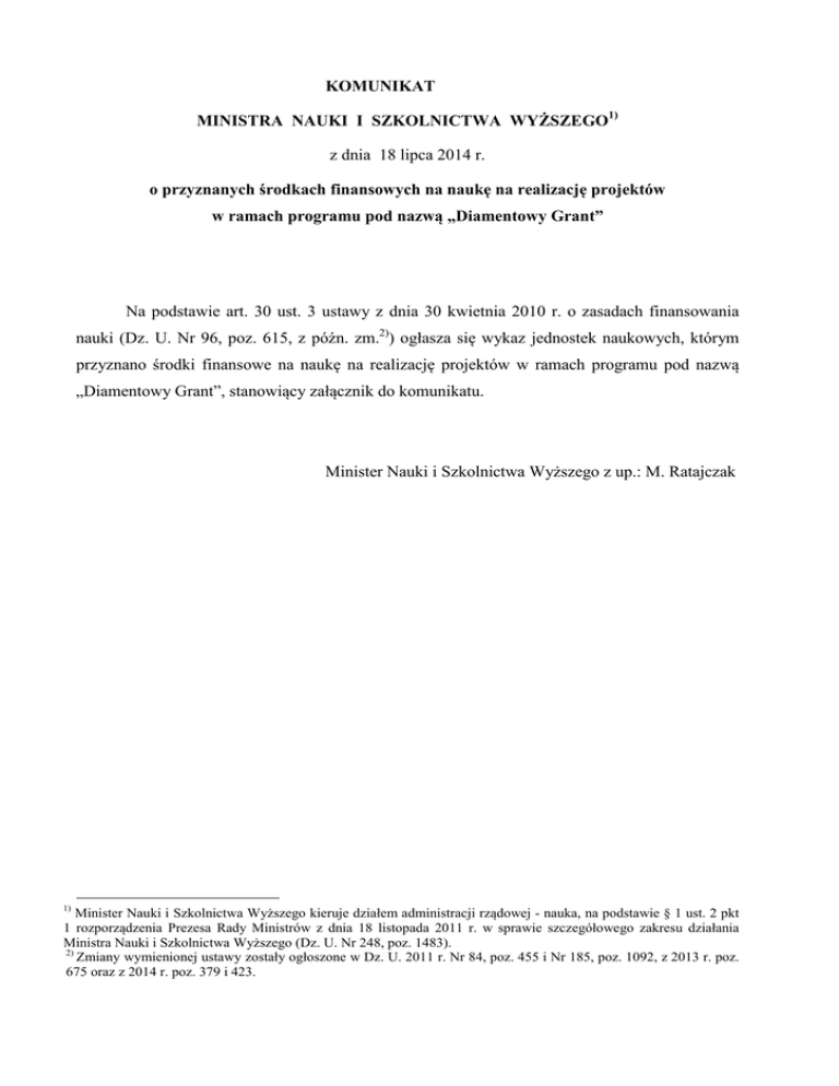 KOMUNIKAT MINISTRA NAUKI I SZKOLNICTWA WYŻSZEGO1) z dnia 18 lipca 2014 r. o przyznanych środkach finansowych na naukę na realizację projektów w ramach programu pod nazwą „Diamentowy Grant” Na podstawie art. 30 ust. 3 ustawy z dnia 30 kwietnia 2010 r. o zasadach finansowania nauki (Dz. U. Nr 96, poz. 615, z późn. zm.2)) ogłasza się wykaz jednostek naukowych, którym przyznano środki finansowe na naukę na realizację projektów w ramach programu pod nazwą „Diamentowy Grant”, stanowiący załącznik do komunikatu. Minister Nauki i Szkolnictwa Wyższego z up.: M. Ratajczak 1) Minister Nauki i Szkolnictwa Wyższego kieruje działem administracji rządowej - nauka, na podstawie § 1 ust. 2 pkt 1 rozporządzenia Prezesa Rady Ministrów z dnia 18 listopada 2011 r. w sprawie szczegółowego zakresu działania Ministra Nauki i Szkolnictwa Wyższego (Dz. U. Nr 248, poz. 1483). 2) Zmiany wymienionej ustawy zostały ogłoszone w Dz. U. 2011 r. Nr 84, poz. 455 i Nr 185, poz. 1092, z 2013 r. poz. 675 oraz z 2014 r. poz. 379 i 423. Załącznik do komunikatu Ministra Nauki i szkolnictwa Wyższego z dnia 18 lipca 2014 r. WYKAZ jednostek naukowych, którym przyznano środki finansowe na naukę na realizację projektów w ramach programu pod nazwą „Diamentowy Grant” L.p. Nazwa jednostki naukowej Imię i Nazwisko uczestnika programu Tytuł projektu badawczego Wysokość przyznanych środków 1. Uniwersytet im. Adama Mickiewicza w Poznaniu, Wydział Historyczny Maciej Grzelczyk Sztuka naskalna rejonu Kondoa w Tanzanii. Perspektywa archeologiczno-etnologiczna 195 350 2 Uniwersytet Warszawski, Michał Paweł ParniakWydział Fizyki Niedojadło 3. Uniwersytet Jagielloński, Wydział Prawa i Administracji Justyna Dominika Zygmunt 4. Uniwersytet Jagielloński, Wydział Prawa i Administracji Grzegorz Konrad Goniewicz 5. Uniwersytet Śląski w Katowicach, Wydział Filologiczny Łukasz Marek Milenkowicz 6. Warszawski Uniwersytet Medyczny, I Wydział Lekarski Antoni Jan Domagała 7. Szkoła Wyższa Psychologii Społecznej w Warszawie, Wydział Zamiejscowy w Sopocie Marta Katarzyna Wrońska 8. Uniwersytet Warszawski, Wydział Fizyki Michał Papaj 9. Wojskowa Akademia Techniczna im. Jarosława Dąbrowskiego, Wydział Nowych Technologii i Chemii Anna Katarzyna Ziołowicz Opracowanie podstaw kwantowego interfejsu atomy-światło opartego o rozpraszanie czterofotonowe w parach atomowych Doktryna fair use na gruncie polskiego i europejskiego prawa autorskiego – o potrzebie dokonania transplantu prawnego Perspektywa reformy systemu środków probacyjnych w kontekście doświadczeń Polski oraz krajów systemu common law i civil law Od neutralizacji do figuracji. Semiotyka i narratologia form utopijnych Zbadanie roli autofagii w odpowiedzi komórek nowotworowych na terapię fotodynamiczną Wyznaczniki zmian stanów uwagi w procesie twórczym Modelowanie kwantowego kontaktu punktowego w dwuwymiarowych izolatorach topologicznych Badania propagacji modów w światłowodach wielordzeniowych, w tym mikrostrukturalnych, przy zmiennych mechanicznych, termicznych i chemicznych warunkach zewnętrznych dla uniwersalnych i wieloparametrowych światłowodowych sond czujnikowych 200 000 138 344 194 501 132 000 200 000 195 789 112 000 198 550 10. Uniwersytet Jagielloński, Wydział Prawa i Administracji Kacper Jarosław Górski 11. Politechnika Gdańska, Wydział Chemiczny Miłosz Wieczór 12. Politechnika Wrocławska, Wydział Chemiczny Joanna Dorota Bednarska 13. Uniwersytet Gdański, Wydział Chemii Paweł Wityk 14. Instytut Rozrodu Zwierząt i Badań Żywności PAN Joanna Najmuła 15. Uniwersytet im. Adama Mickiewicza w Poznaniu, Wydział Prawa i Administracji Piotr Krzysztof Alexandrowicz 16. Uniwersytet Warszawski, Wydział Chemii Michał Kizling 17. Uniwersytet Rzeszowski, Pozawydziałowy Zamiejscowy Instytut Biotechnologii Stosowanej i Nauk Podstawowych Jennifer Gabriela Mytych 18. Politechnika Wrocławska, Wydział Podstawowych Problemów Techniki Maciej Piotr Polak 19. Uniwersytet Jagielloński, Wydział Biologii i Nauk o Ziemi Łukasz Andrzej Chrobok 20. Uniwersytet Jagielloński, Wydział Historyczny Joanna Barbara Jędrysik Starosta krakowski jako organ sądownictwa w pierwszej połowie XVII wieku Molekularny mechanizm wpływu stresu oksydacyjnego na stabilność strukturalną i dynamikę kompleksów telomerowego DNA z białkami Absorpcyjne widma dwukwantowe cząsteczek w roztworach: symulacje z zasad pierwszych Specyficzne oddziaływania białkoDNA a sensybilizowane uszkodzenia fotochemiczne i radiacyjne w modyfikowanych oligonukleotydach. Modelowanie molekularne oraz badania fizykochemiczne elementów organizacji w komórkach w kontekście skojarzonej foto- i radioterapii nowotworów Egzosomy pochodzenia zarodkowego/endometrialnego jako nowy element interakcji zarodekmatka u świni Wiążąca moc umów. Źródła swobody umów w prawie kanonicznym a współczesne kontrowersje co do jej podstaw Zastosowanie nanostrukturalnych kompozytów węglowych w enzymatycznych ogniwach paliwowych i biosensorach Poszukiwanie nowych właściwości białka klotho w zwalczaniu zakażeń bakteryjnych Obliczenia z zasad pierwszych struktury pasmowej, właściwości strukturalnych i optycznych dla półprzewodnikowych związków mieszanych wytworzonych na bazie materiałów o dużym niedopasowaniu Zegar biologiczny a epilepsja. Elektrofizjologiczne i immunohistochemiczne badania na szczurzym modelu napadów nieświadomości Interdyscyplinarne badania nad przemianami osadnictwa na Wyżynie Częstochowskiej. Od neolitu po okres wędrówek ludów 200 000 169 400 190 000 199 210 170 555 197 290 200 000 199 991 200 000 199 000 199 893 21. Uniwersytet Jagielloński, Wydział Filozoficzny Alicja Maria Rybkowska 22. Uniwersytet Jagielloński, Wydział Polonistyki Aleksandra Skórzak 23. Instytut Chemii Organicznej PAN Ernest Sebai 24. Politechnika Warszawska, Wydział Mechaniczny Energetyki i Lotnictwa 25. Uniwersytet Wrocła