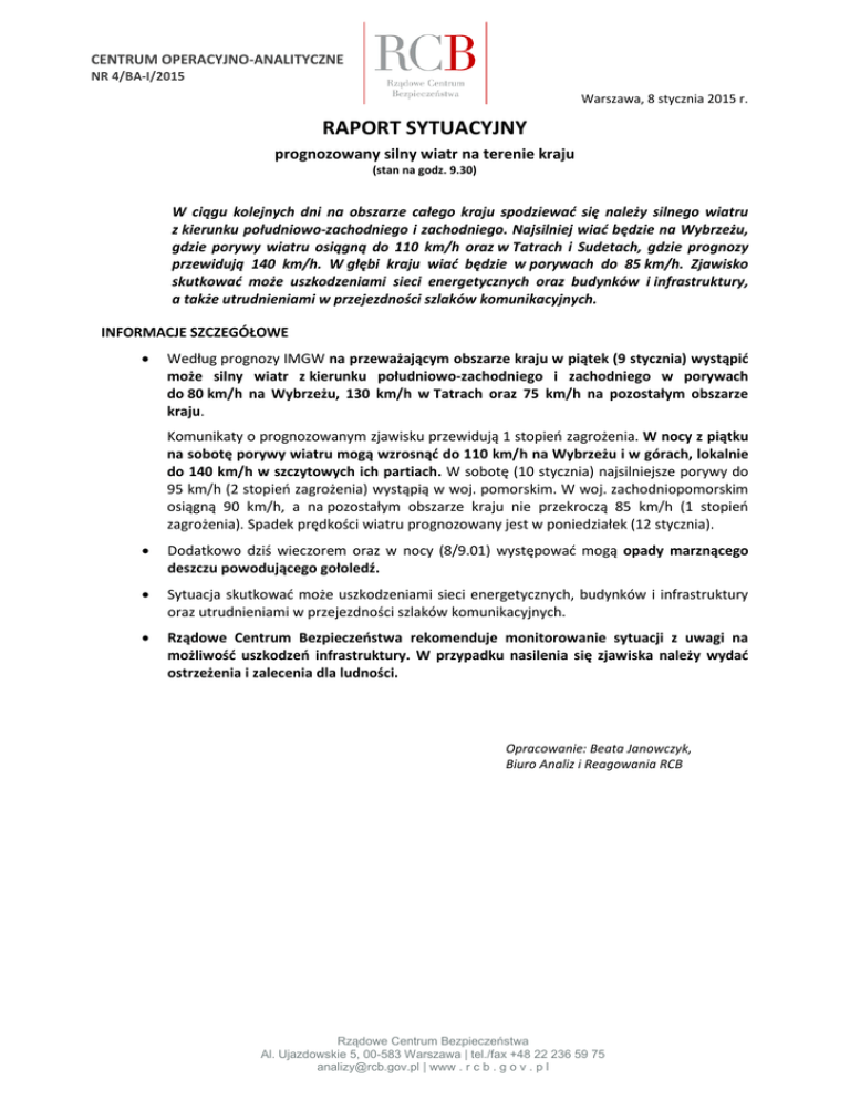 CENTRUM OPERACYJNO-ANALITYCZNE NR 4/BA-I/2015 Warszawa, 8 stycznia 2015 r. RAPORT SYTUACYJNY prognozowany silny wiatr na terenie kraju (stan na godz. 9.30) W ciągu kolejnych dni na obszarze całego kraju spodziewać się należy silnego wiatru z kierunku południowo-zachodniego i zachodniego. Najsilniej wiać będzie na Wybrzeżu, gdzie porywy wiatru osiągną do 110 km/h oraz w Tatrach i Sudetach, gdzie prognozy przewidują 140 km/h. W głębi kraju wiać będzie w porywach do 85 km/h. Zjawisko skutkować może uszkodzeniami sieci energetycznych oraz budynków i infrastruktury, a także utrudnieniami w przejezdności szlaków komunikacyjnych. INFORMACJE SZCZEGÓŁOWE Według prognozy IMGW na przeważającym obszarze kraju w piątek (9 stycznia) wystąpić może silny wiatr z kierunku południowo-zachodniego i zachodniego w porywach do 80 km/h na Wybrzeżu, 130 km/h w Tatrach oraz 75 km/h na pozostałym obszarze kraju. Komunikaty o prognozowanym zjawisku przewidują 1 stopień zagrożenia. W nocy z piątku na sobotę porywy wiatru mogą wzrosnąć do 110 km/h na Wybrzeżu i w górach, lokalnie do 140 km/h w szczytowych ich partiach. W sobotę (10 stycznia) najsilniejsze porywy do 95 km/h (2 stopień zagrożenia) wystąpią w woj. pomorskim. W woj. zachodniopomorskim osiągną 90 km/h, a na pozostałym obszarze kraju nie przekroczą 85 km/h (1 stopień zagrożenia). Spadek prędkości wiatru prognozowany jest w poniedziałek (12 stycznia). Dodatkowo dziś wieczorem oraz w nocy (8/9.01) występować mogą opady marznącego deszczu powodującego gołoledź. Sytuacja skutkować może uszkodzeniami sieci energetycznych, budynków i infrastruktury oraz utrudnieniami w przejezdności szlaków komunikacyjnych. Rządowe Centrum Bezpieczeństwa rekomenduje monitorowanie sytuacji z uwagi na możliwość uszkodzeń infrastruktury. W przypadku nasilenia się zjawiska należy wydać ostrzeżenia i zalecenia dla ludności. Opracowanie: Beata Janowczyk, Biuro Analiz i Reagowania RCB Rządowe Centrum Bezpieczeństwa Al. Ujazdowskie 5, 00-583 Warszawa | tel./fax +48 22 236 59 75 [email protected] | www . r c b . g o v . p l