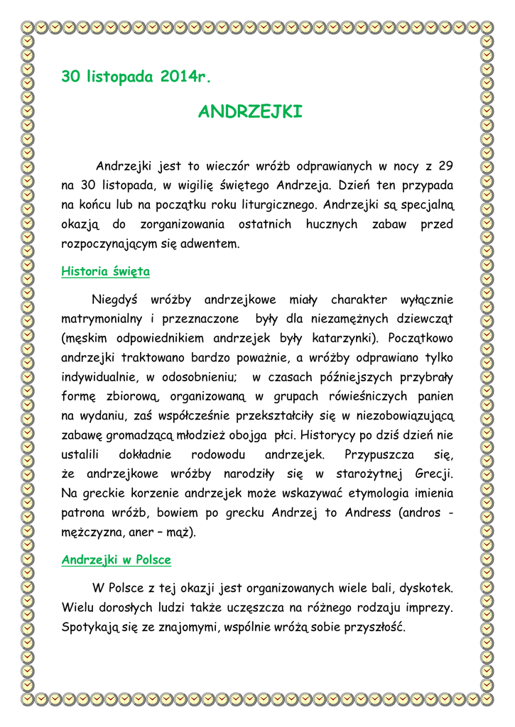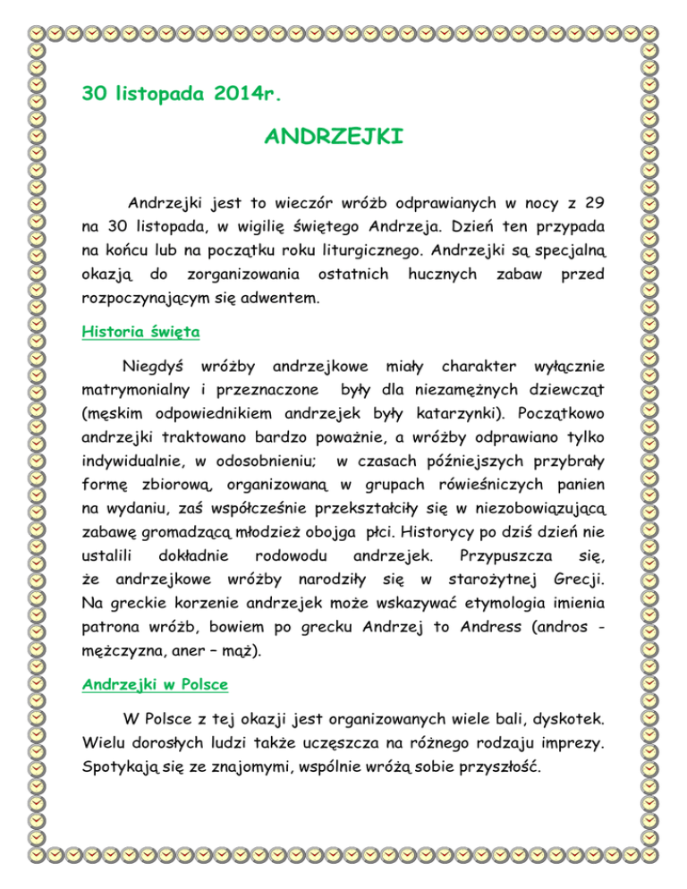 30 listopada 2014r. ANDRZEJKI Andrzejki jest to wieczór wróżb odprawianych w nocy z 29 na 30 listopada, w wigilię świętego Andrzeja. Dzień ten przypada na końcu lub na początku roku liturgicznego. Andrzejki są specjalną okazją do zorganizowania ostatnich hucznych zabaw przed rozpoczynającym się adwentem. Historia święta Niegdyś wróżby andrzejkowe matrymonialny i przeznaczone miały charakter wyłącznie były dla niezamężnych dziewcząt (męskim odpowiednikiem andrzejek były katarzynki). Początkowo andrzejki traktowano bardzo poważnie, a wróżby odprawiano tylko indywidualnie, w odosobnieniu; w czasach późniejszych przybrały formę zbiorową, organizowaną w grupach rówieśniczych panien na wydaniu, zaś współcześnie przekształciły się w niezobowiązującą zabawę gromadzącą młodzież obojga płci. Historycy po dziś dzień nie ustalili że dokładnie andrzejkowe rodowodu wróżby andrzejek. narodziły się w Przypuszcza starożytnej się, Grecji. Na greckie korzenie andrzejek może wskazywać etymologia imienia patrona wróżb, bowiem po grecku Andrzej to Andress (andros mężczyzna, aner – mąż). Andrzejki w Polsce W Polsce z tej okazji jest organizowanych wiele bali, dyskotek. Wielu dorosłych ludzi także uczęszcza na różnego rodzaju imprezy. Spotykają się ze znajomymi, wspólnie wróżą sobie przyszłość. Propozycje wróżb Andrzejki bez wróżb, to nie andrzejki. Teraz podamy Wam kilka propozycji. Najbardziej popularną wróżbą andrzejkową jest keromancja, wyjaśnijmy, że chodzi o stare, dobre lanie wosku. Ten sposób wróżenia polega na laniu wosku roztopionego w mosiężnym tyglu. Gorący wosk, zwykle przez dziurkę od klucza, wlewa się powoli do misy z zimną wodą. Kiedy zetknie się on z powierzchnią chłodnej wody, zastyga, przyjmując rozmaite, czasem bardzo fantazyjne kształty. Ich znaczenie odczytuje się, oglądając cień, jaki, oświetlone, rzucają na ścianę. W ten sposób można było wywróżyć cień sylwetki przyszłego męża lub akcesoria związane z jego profesją. Przez wieki praktykowania tego zwyczaju ułożono wręcz cały system interpretacji uzyskanych z wosku kształtów, który przyjęto później także w tasseomancji (pod tą mądrą nazwą kryje się wróżenie z fusów). Inne wróżby andrzejkowe Dawniej, dziewczyny wysiewały w garnkach lub na skrawku pola ziarna lnu i konopi, które następnie zagrabiano męskimi spodniami, w nadziei, że sprowadzi to do domu kandydata na męża. W zasadzie bardziej niż wróżbę, przypomina to zaklinanie rzeczywistości (Kresy Wschodnie). Wierzono również w to, że jeśli dziewczyna pościła przez cały dzień i modliła się do świętego Andrzeja, to we śnie mógł ukazać się jej przyszły ukochany. Inna wróżba polegała na ścinaniu przez pannę w dniu świętego Andrzeja gałązki wiśni lub czereśni, która musiała zakwitnąć w wigilię Bożego Narodzenia. Jeżeli się udało to dziewczyna mogła liczyć na rychłe pójście za mąż. W andrzejki przeprowadzano także losowanie przedmiotów o symbolicznym znaczeniu np. listek oznaczał staropanieństwo, obrączka lub wstążka z czepka – bliski ślub, różaniec – stan zakonny. PRZYSŁOWIA Gdy święty Andrzej ze śniegiem przybieży, sto dni śnieg na polu leży. Gdy w Andrzeja deszcz lub słota, w grudniu drogi bez błota. Jeżeli na świętego Andrzeja wiatr i mgła, to od Bożego Narodzenia będzie sroga zima. Noc Andrzeja świętego przyniesie nam narzeczonego. Na Świętego Andrzeja trza kożucha dobrodzieja. Święty Andrzej wróży szczęście i szybkie zamęście. Na świętego Andrzeja błyska pannom nadzieja. Śnieg na Andrzeja, dla zboża zła nadzieja. Święty Andrzej Ci ukaże, co Ci los przyniesie w darze. Tekst: Anna Szostek