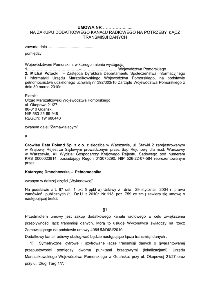 UMOWA NR ……………....... NA ZAKUPU DODATKOWEGO KANAŁU RADIOWEGO NA POTRZEBY ŁĄCZ TRANSMISJI DANYCH zawarta dnia ......................................... pomiędzy: Województwem Pomorskim, w którego imieniu występują: 1. ………………………………..–……………………… Województwa Pomorskiego 2. Michał Potocki – Zastępca Dyrektora Departamentu Społeczeństwa Informacyjnego i Informatyki Urzędu Marszałkowskiego Województwa Pomorskiego, na podstawie pełnomocnictwa udzielonego uchwałą nr 392/303/10 Zarządu Województwa Pomorskiego z dnia 30 marca 2010r. Płatnik: Urząd Marszałkowski Województwa Pomorskiego ul. Okopowa 21/27 80-810 Gdańsk NIP 583-25-69-948 REGON: 191686443 zwanym dalej “Zamawiającym” a Crowley Data Poland Sp. z o.o. z siedzibą w Warszawie, ul. Stawki 2 zarejestrowanym w Krajowej Rejestrze Sądowym prowadzonym przez Sąd Rejonowy dla m.st. Warszawy w Warszawie, XII Wydział Gospodarczy Krajowego Rejestru Sądowego pod numerem KRS 0000023814, posiadający Regon 013075290, NIP 526-22-07-584 reprezentowanym przez Katarzynę Dmochowską – Pełnomocnika zwanym w dalszej części „Wykonawcą” Na podstawie art. 67 ust. 1 pkt 5 ppkt a) Ustawy z dnia 29 stycznia 2004 r. prawo zamówień publicznych (t.j. Dz.U. z 2010r. Nr 113, poz. 759 ze zm.) zawiera się umowę o następującej treści: §1 Przedmiotem umowy jest zakup dodatkowego kanału radiowego w celu zwiększenia przepływności łącz transmisji danych, którą to usługę Wykonawca świadczy na rzecz Zamawiającego na podstawie umowy 496/UM/DISI/2010 Dodatkowy kanał radiowy obsługiwać będzie następujące łącza transmisji danych : 1) Symetryczne, cyfrowe i szyfrowane łącze transmisji danych o gwarantowanej przepustowości pomiędzy dwoma punktami brzegowymi (lokalizacjami) Urzędu Marszałkowskiego Województwa Pomorskiego w Gdańsku: przy ul. Okopowej 21/27 oraz przy ul. Długi Targ 1/7; 2) Symetryczne, cyfrowe i szyfrowane przepustowości pomiędzy dwoma łącze transmisji danych o gwarantowanej punktami brzegowymi (lokalizacjami) Urzędu Marszałkowskiego Województwa Pomorskiego w Gdańsku: przy ul. Okopowej 21/27 oraz przy ul. Długi Targ 1/7 z moŜliwością poprawnej realizacji usługi VOIP §2 W związku z zakupem dodatkowego kanału radiowego przepływność łącz o których mowa w §1 zostaje ustalona wg poniŜszych parametrów. 1. Gwarantowana przepustowość łącza , o którym mowa §1 pkt 1 zostaje zwiększona do przepustowości 6 Mbps (CIR 6 Mbps) w obu kierunkach . 2. Gwarantowana przepustowość łącza , o którym mowa §1 pkt 2 zostaje zwiększona do przepustowości 2 Mbps (CIR 2 Mbps) w obu kierunkach, z moŜliwością poprawnej realizacji usługi VOIP, §3 1. Zakup dodatkowego kanału radiowego oraz związane z tym zwiększenie parametrów łącz potwierdzone zostanie protokołem zdawczo-odbiorczym, podpisanym przez obie strony umowy bez zastrzeŜeń 2. Osobami upowaŜnionymi do podpisania protokołu zdawczo-odbiorczego strony są po stronie Wykonawcy Pan Andrzej Jezierski, a po stronie Zamawiającego ………………………………….. - pracownik Departamentu Społeczeństwa Informacyjnego i Informatyki Urzędu Marszałkowskiego Województwa Pomorskiego . 3. Zwiększenie parametrów łącz transmisji danych zostanie przeprowadzone do dnia ….03.2011 r. §4 1. Z tytułu prac związanych z uruchomieniem dodatkowego kanału radiowego i zwiększeniem parametrów łącz transmisji danych Zamawiający zapłaci na rzez Wykonawcy opłatę instalacyjną w wysokości 10 zł netto (słownie: dziesięć zł) powiększoną o obowiązującą stawkę podatku VAT 2. Termin płatności dotyczący opłaty instalacyjnej, o której mowa w ust 1 wynosi 14 dni od otrzymania przez Zamawiającego prawidłowo wystawionej faktury VAT 3. Zamawiający za zakup dodatkowego kanału radiowego na potrzeby łącza, o którym mowa w §1 pkt 1 uiszczał będzie miesięczny abonament w wysokości 400 zł netto (słownie: czterysta zł) powiększony o obowiązującą stawkę podatku VAT. 4. Zamawiający za zakup dodatkowego kanału radiowego na potrzeby łącza , o którym mowa w §1 pkt 2 uiszczał będzie miesięczny abonament w wysokości 200 zł netto (słownie: dwieście zł) powiększony o obowiązującą stawkę podatku VAT. 5. Abonament, o którym mowa w ust 3 i 4, zostanie doliczony do abonamentu o którym mowa w §5 ust 2 umowy 496/UM/DISI/2010 z dnia 8 grudnia 2010r i dotyczy okresu świadczenia usług począwszy od ….03.2011 r. do 31.12.2011 r. §5 1. Wszelkie zmiany zawartej umowy będą wymagały pisemnego aneksu pod rygorem niewaŜności. Zmiany umowy mogą jedynie dotyczyć: 1) terminu realizacji zamówienia, 2) warunków płatności, 3) zmiany parametrów łącz transmisji danych §6 W sprawach nieuregulowanych niniejszą umową zastosowanie mają przepisy kodeksu cywilnego oraz innych obowiązujących ustaw. §7 Umowę niniejszą sporządzono w trzech jednobrzmiących egzemplarzach - jeden egzemplarz dla Wykonawcy i dwa dla Zamawiającego. Wykonawca Zamawiający
