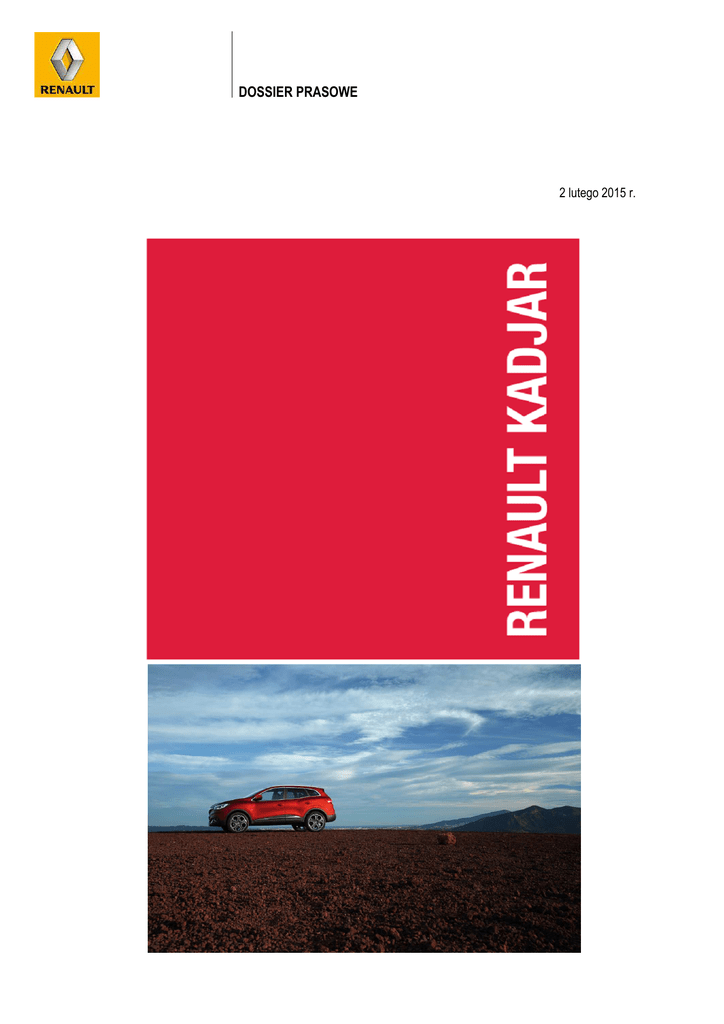 DOSSIER PRASOWE 2 lutego 2015 r. RENAULT PREZENTUJE MODEL KADJAR – SWÓJ PIERWSZY CROSSOVER W SEGMENCIE C Po sukcesie modelu Captur, Renault kontynuuje swoją ofensywę na rynku crossoverów i wprowadza KADJAR, swój pierwszy crossover w segmencie C. W tym dynamicznie rozwijającym się segmencie, interesującym dla wielu producentów, KADJAR ma pomóc w realizacji ambitnych celów Renault na rynkach pozaeuropejskich. Początkowo nowy model zostanie wprowadzony do sprzedaży w Europie i w licznych krajach afrykańskich oraz w basenie Morza Śródziemnego, a następnie w Chinach. Renault KADJAR wnosi nową dynamikę do przyjętych w tym segmencie kanonów i stanowi innowacyjną i atrakcyjną propozycję na rynków crossoverów. Nowy model zwraca uwagę płynną i atletyczną linią nadwozia. KADJAR posiada zarazem sportowe i wyrafinowane wnętrze, doskonale wykończone wysokiej jakości materiałami. Dostępne z napędem na dwa i na cztery koła, Renault KADJAR zaprasza do ucieczki od codzienności, a jednocześnie dzięki swoim kompaktowym wymiarom (4,45 m długości i 1,84 m szerokości) jest zwrotne, co przydaje się podczas jazdy po mieście. KADJAR wyposażony w nowoczesne systemy zapewnia dostęp do usług on-line dzięki tabletowi R-Link 2® oraz pełen komfort, który gwarantują najnowsze układy wspomagające prowadzenie auta. Renault KADJAR dysponuje również wyjątkowo dynamicznymi i oszczędnymi silnikami, które pozycjonują go na najwyższym poziomie w tym segmencie pod względem zużycia paliwa i emisji CO2. Renault KADJAR zostanie zaprezentowane podczas 85 Salonu Samochodowego w Genewie, który rozpocznie się 5 marca 2015 r. Sprzedaż nowego modelu ruszy na początku tego lata. 2 SPIS STREŚCI 01 KADJAR – ŚWIATOWY SAMOCHÓD ODPOWIADAJĄCY ŚWIATOWYM AMBICJOM MARKI Renault poszerza swoją ofertę crossoverów Renault KADJAR – samochód o światowych ambicjach Crossover o wyraźnych cechach Renault zaprojektowany na płycie podłogowej Aliansu 02 RENAULT KADJAR – NOWY STYL W ŚWIECIE CROSSOVERÓW Atletyczna bryła nadwozia o płynnych liniach Ma wszystko, co powinien mieć crossover plus jeszcze to „coś” Sportowe i wyrafinowane wnętrze 03 KADJAR, AUTO Z CHARAKTEREM, KTÓRE POMOŻE CI SPEŁNIĆ WSZYSTKIE PRAGNIENIA KADJAR dostępny z napędem 4x2 i 4x4 równie swobodnie czuje się w mieście jak i na bezdrożach Wysokiej klasy wyposażenie – personalizacja i dostęp do usług on-line podczas jazdy Bezpieczna ucieczka od codzienności 3 01 KADJAR – ŚWIATOWY SAMOCHÓD ODPOWIADAJĄCY ŚWIATOWYM AMBICJOM MARKI Po sukcesie modelu Captur, Renault zapowiada debiut modelu KADJAR, co najlepiej świadczy o dynamice marki we wprowadzaniu nowych produktów. W tym błyskawicznie rozwijającym się segmencie marka proponuje własną wizję crossovera. RENAULT POSZERZA SWOJĄ OFERTĘ CROSSOVERÓW KADJAR jest świadectwem potencjału Renault w tworzeniu lub wprowadzaniu istotnych zmian w modelach, pozwalających zdobyć nowe rynki i nowych klientów. O dynamice wprowadzania nowych modeli świadczy średni wiek modeli Renault, który zmniejszył się z 4,8 roku w 2012 r. do 4,2 roku w 2014 r., a pod koniec 2015 r. będzie wynosił 3,7 roku. W 2014 r. crossovery stanowiły niemal jedną piątą sprzedawanych na świecie samochodów, a ich udział w rynku europejskim wyniósł 23%, natomiast w Chinach – 26%. Segment ten stanowi również doskonały sposób wejścia na najważniejsze rynki w planach ekspansji Grupy. Po Renault Koleos, Captur był drugim crossoverem w gamie Renault. Model odniósł duży sukces. Ten miejski crossover wyposażony w innowacyjne i jednocześnie praktyczne rozwiązania uplasował się w czołówce sprzedaży crossoverów w segmencie B w Europie. W 2014 r. sprzedał się w ilości ponad 178 000 sztuk. Renault kontynuuje ofensywę w tym segmencie na rynkach pozaeuropejskich. KADJAR, plasujący się pomiędzy Capturem i Koleosem, umożliwia poszerzenie oferty marki i wejście do segmentu C. Większy od modelu Captur, stanowi nową ofertę w tym segmencie – łączy płynne linie z atletycznym i prestiżowym wyglądem, komfortowym wnętrzem i jednocześnie jest przyjazny dla środowiska. RENAULT KADJAR – SAMOCHÓD O ŚWIATOWYCH AMBICJACH W 2014 r. Grupa Renault sprzedała w 128 krajach całego świata 2 712 432 samochody. Dzięki swojej strategii rozwoju na rynkach pozaeuropejskich Renault sprzedaje obecnie 46% swoich samochodów poza Europą (w porównaniu do 37% w 2010 r.). Kluczowym czynnikiem rozwoju Grupy i umocnienia jej wizerunku jest plan wprowadzania nowych modeli. KADJAR przyczyni się do rozwoju Renault dzięki poszerzeniu gamy oferowanej przez Grupę oraz wejściu na nowe rynki. 4 KADJAR – ambitne cele sprzedaży w Europie i w basenie Morza Śródziemnego Renault ma w Europie mocną pozycję – w 2014 r. uplasowało się na trzecim miejscu na rynku samochodów osobowych i dostawczych. KADJAR jest produkowany w zakładzie w Palencji, a 83% jego produkcji jest przeznaczone na eksport do ponad 50 krajów na pięciu kontynentach. Nowy model wejdzie do sprzedaży latem tego roku, początkowo w Europie, a następnie w większości krajów basenu Morza Śródziemnego i w Afryce. W Chinach KADJAR ma odegrać przełomową rolę w ofensywie Grupy Renault KADJAR będzie pierwszym modelem Renault produkowanym w Chinach. Nowy crossover będzie stanowił mocny atut w rozwoju Grupy w tym kraju. Chiny, gdzie w 1999 r. sprzedano 600 tysięcy samochodów, są obecnie największym rynkiem zbytu na świecie. W 2014 r. sprzedano tam ponad 22 miliony samochodów. W grudniu 2013 r. Grupa Renault oficjalnie potwierdziła utworzenie joint venture z firmą Dongfeng i rozpoczęła budowę zakładu w Wuhan o początkowej mocy produkcyjnej 150 tysięcy aut. KADJAR PIERWSZYM MODELEM RENAULT PRODUKOWANYM W CHINACH W dniu 16 grudnia 2013 r. firmy Renault i Dongfeng podpisały umowę, na mocy której utworzono Dongfeng Renault Automotive Company (DRAC) i podję