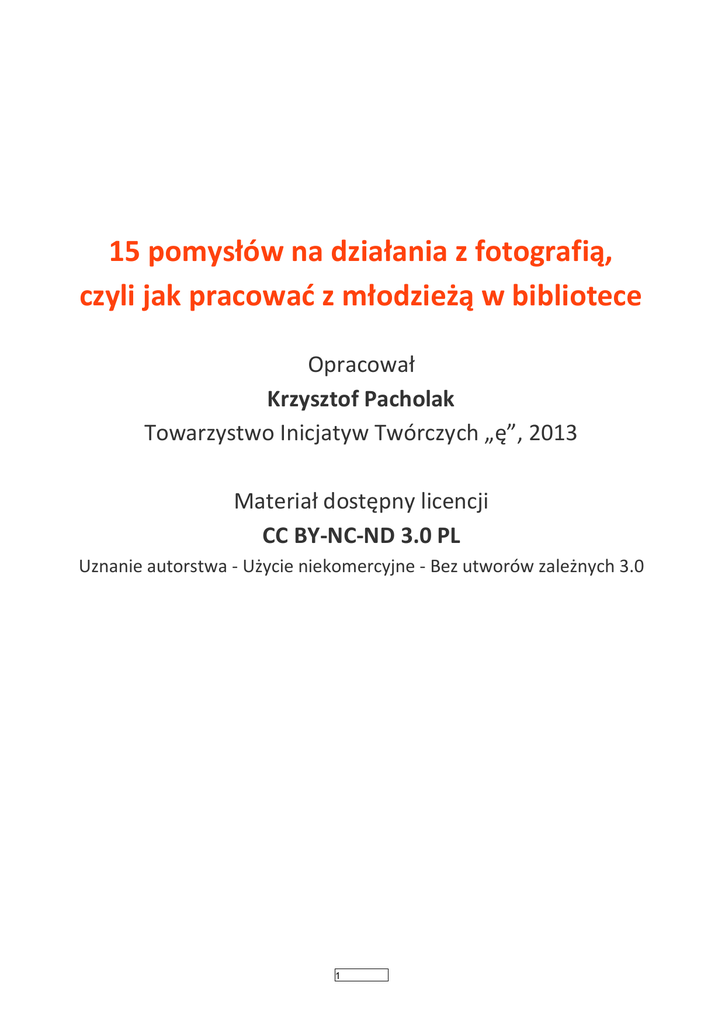 15 pomysłów na działania z fotografią, czyli jak pracować z młodzieżą w bibliotece Opracował Krzysztof Pacholak Towarzystwo Inicjatyw Twórczych „ę”, 2013 Materiał dostępny licencji CC BY-NC-ND 3.0 PL Uznanie autorstwa - Użycie niekomercyjne - Bez utworów zależnych 3.0 1 Pomysł na kółko fotograficzne nie musi ograniczać się wyłącznie do kwestii technicznych. Ogniskowe obiektywów, nowe matryce w aparatach cyfrowych, funkcje Photoshopa i filtry Instagramu to oczywiście ciekawe tematy i każdy, kto chce się fotografią zajmować profesjonalnie, prędzej czy później będzie musiał się z nimi zmierzyć. My natomiast nie musimy. Aparat fotograficzny wykorzystamy do innych celów. Fotografia jest językiem. Środkiem wyrazu o swoich bardzo specyficznych cechach, jednak zachowującym zdolności do przekazywania treści. Przy pomocy fotografii formułujemy komunikat, wyrażamy własne zdanie, pokazujemy własną wrażliwość i swój punkt widzenia. To jest w fotografii najpiękniejsze i najbardziej wartościowe. A do tego nie potrzebujemy znać perfekcyjnie techniki. „Mówić” fotografią może każdy. Jak zatem – nawet nie mając bogatej wiedzy i doświadczenia – poprowadzić proste zajęcia z dziećmi i młodzieżą? Oto 15 pomysłów na proste działania z fotografią. 1. Alfabet To jedno z najprostszych, a zarazem najprzyjemniejszych ćwiczeń. Prosimy grupę o zrobienie zdjęć, których tematem będą poszczególne litery alfabetu. A – asfalt, B – budynek, C – cukinia itp. To ćwiczenie idealne na „rozruszanie” grupy, na to, żeby zbyt długo się nie zastanawiać, tylko po prostu zacząć robić zdjęcia. Jako dodatek, można nałożyć dodatkowe ramy formalne, np. „tylko po jednym zdjęciu do jednej litery”. Uwaga: powstanie bardzo dużo zdjęć, musimy być gotowi na ich przeglądanie. 2. Autoportret Niby proste, ale ćwiczenie to może sprawić dużą trudność. Po pierwsze dlatego, że ktoś może się krępować samemu robić sobie zdjęcie, po drugie – właśnie przez swoją pozorną oczywistość – młodzi fotografowie będą chcieli koniecznie zrobić oryginalne zdjęcie. Obie te trudności są jednak bardzo kreatywne i dzięki nim może powstać wiele ciekawych prac (może ktoś wstydliwy zrobi sobie autoportret, na którym się ukryje/zakryje, albo ktoś – szukając oryginalnej formy – przerobi zdjęcie cyfrowo i zrobi z niego negatyw?). 3. Autoportret rodzinny robiony z telewizora Zadanie z serii „zdjęć socjologicznych”. Prosimy o ustawienie aparatu w tryb samowyzwalacza, postawienie go na telewizorze i sfotografowanie się z całą rodziną, w takich pozach, jakie zazwyczaj przyjmują domownicy oglądający wieczorem film. Powstanie bardzo głęboki, dokumentalny cykl zdjęć ukazujących nie tylko samych domowników, ale również wystrój pokoju, sprzęty gospodarstwa domowego, ubiór, fryzury, wzornictwo itp. Prawdziwie „antropologiczny” materiał, który będzie niezwykle interesujący, nawet jeśli zdjęcia nie będą idealnie technicznie. Któż by nie chciał zajrzeć do sąsiada z naprzeciwka? 2 4. Moje miasto okiem turysty + moje miasto okiem mieszkańca O fotografii mówi się często, że pozwala spojrzeć na świat z innej perspektywy. To prawda. Jednym z niezawodnych ćwiczeń na zmianę perspektywy, jest zadanie sfotografowania swojego miasta/wsi okiem przyjezdnego turysty oraz okiem mieszkańca. Trzeba „wcielić się w rolę” i przespacerować po okolicy inaczej niż zwykle. Takie zadanie może okazać się niezwykle odświeżające, młodzież przyniesie wiele zdjęć, którymi sama będzie zaskoczona. Najlepiej skonfrontować te zdjęcia z tymi robionymi „okiem mieszkańca”. Powstaną niezwykle interesujące „dyptyki”, z których z powodzeniem urządzić możemy wystawę. 5. Dzień z życia / tydzień z życia To klasyczny temat w fotografii, a przy okazji na tyle uniwersalny, że zrobić go może każdy. Tematem cyklu zdjęć ma być dzień z życia. Młodzi fotografowie będą musieli zastanowić się, jak ukazać swoją codzienność? Za pomocą jakich obrazów „zbudować” historię o sobie? Jako dodatkowy wymóg formalny możemy narzucić maksymalną liczbę zdjęć (np. 10 w cyklu). Podobnie z tematem „tydzień z życia”. Wymaga większego skupienia i noszenia ze sobą aparatu codziennie, ale jednocześnie daje większe pole do popisu. Można urozmaicić cykl o zdjęcia z weekendu itp. 6. Moja rodzina / moi przyjaciele Kolejny temat, który można zrealizować bez uprzedniego przygotowania. Fotografia to doskonały pretekst do odnowienia więzi rodzinnych. Może z jakimś wujkiem nie widzieliśmy się od ubiegłorocznych świąt? Dzięki fotografii możemy skompletować rodzinę przy zdjęciu grupowym, a dodatkowo każdemu zrobić pozowany, bliski portret. To fotograficzny „evergreen”, który przyniesie mnóstwo frajdy naszym fotografom. Pewnie na kilka tygodni po zdjęciach wciąż będą dostawać prośby o wykonanie odbitki… 7. Mieszkańcy miejscowości: od najmłodszego do najstarszego Temat ambitny i najprawdopodobniej nie obędzie się bez wsparcia instytucji. Stwórzmy „portret mieszkańców”, który zaczynał się będzie od najmłodszej osoby, a kończył na najstarszej. To idealny sposób na poznanie sąsiadów i ludzi mieszkających w tej samej miejscowości/wsi. To również świetna okazja do zrobienia wystawy, którą powiesić możemy w swojej bibliotece. Uwaga: nie każdy z fotografujących będzie miał na tyle śmiałości, żeby samemu się z tym tematem zmierzyć. Może dobrym pomysłem jest podzielenie uczestników zajęć na grupy? Konieczne też będzie nasze osobiste wsparcie: pewnie trzeba będzie wykonać kilka telefonów, namówić do zdjęcia czasami obcych ludzi. Z pewnością warto! 3 8. Miejsca, w których czuję się dobrze + miejsca, w których czuję się źle Kolejny temat stricte socjologiczny, a przy okazji interwenc