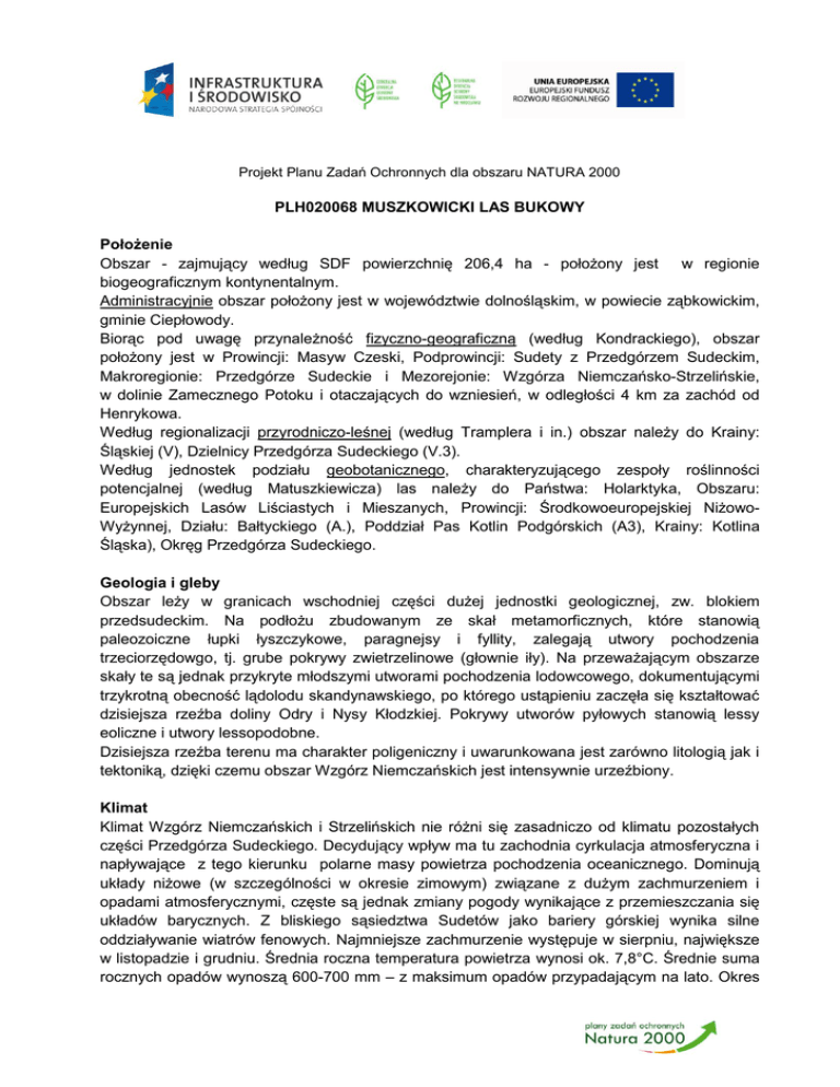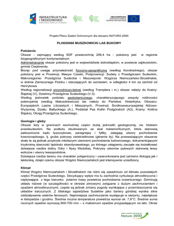 Projekt Planu Zadań Ochronnych dla obszaru NATURA 2000 PLH020068 MUSZKOWICKI LAS BUKOWY Położenie Obszar - zajmujący według SDF powierzchnię 206,4 ha - położony jest w regionie biogeograficznym kontynentalnym. Administracyjnie obszar położony jest w województwie dolnośląskim, w powiecie ząbkowickim, gminie Ciepłowody. Biorąc pod uwagę przynależność fizyczno-geograficzną (według Kondrackiego), obszar położony jest w Prowincji: Masyw Czeski, Podprowincji: Sudety z Przedgórzem Sudeckim, Makroregionie: Przedgórze Sudeckie i Mezorejonie: Wzgórza Niemczańsko-Strzelińskie, w dolinie Zamecznego Potoku i otaczających do wzniesień, w odległości 4 km za zachód od Henrykowa. Według regionalizacji przyrodniczo-leśnej (według Tramplera i in.) obszar należy do Krainy: Śląskiej (V), Dzielnicy Przedgórza Sudeckiego (V.3). Według jednostek podziału geobotanicznego, charakteryzującego zespoły roślinności potencjalnej (według Matuszkiewicza) las należy do Państwa: Holarktyka, Obszaru: Europejskich Lasów Liściastych i Mieszanych, Prowincji: Środkowoeuropejskiej NiżowoWyżynnej, Działu: Bałtyckiego (A.), Poddział Pas Kotlin Podgórskich (A3), Krainy: Kotlina Śląska), Okręg Przedgórza Sudeckiego. Geologia i gleby Obszar leży w granicach wschodniej części dużej jednostki geologicznej, zw. blokiem przedsudeckim. Na podłożu zbudowanym ze skał metamorficznych, które stanowią paleozoiczne łupki łyszczykowe, paragnejsy i fyllity, zalegają utwory pochodzenia trzeciorzędowgo, tj. grube pokrywy zwietrzelinowe (głownie iły). Na przeważającym obszarze skały te są jednak przykryte młodszymi utworami pochodzenia lodowcowego, dokumentującymi trzykrotną obecność lądolodu skandynawskiego, po którego ustąpieniu zaczęła się kształtować dzisiejsza rzeźba doliny Odry i Nysy Kłodzkiej. Pokrywy utworów pyłowych stanowią lessy eoliczne i utwory lessopodobne. Dzisiejsza rzeźba terenu ma charakter poligeniczny i uwarunkowana jest zarówno litologią jak i tektoniką, dzięki czemu obszar Wzgórz Niemczańskich jest intensywnie urzeźbiony. Klimat Klimat Wzgórz Niemczańskich i Strzelińskich nie różni się zasadniczo od klimatu pozostałych części Przedgórza Sudeckiego. Decydujący wpływ ma tu zachodnia cyrkulacja atmosferyczna i napływające z tego kierunku polarne masy powietrza pochodzenia oceanicznego. Dominują układy niżowe (w szczególności w okresie zimowym) związane z dużym zachmurzeniem i opadami atmosferycznymi, częste są jednak zmiany pogody wynikające z przemieszczania się układów barycznych. Z bliskiego sąsiedztwa Sudetów jako bariery górskiej wynika silne oddziaływanie wiatrów fenowych. Najmniejsze zachmurzenie występuje w sierpniu, największe w listopadzie i grudniu. Średnia roczna temperatura powietrza wynosi ok. 7,8°C. Średnie suma rocznych opadów wynoszą 600-700 mm – z maksimum opadów przypadającym na lato. Okres wegetacyjny jest u stosunkowo długi i trwa ok. 220 dni, natomiast ilość dni z potencjalną pokrywą śnieżną to co najmniej 50 dni, która jest tu jednak nietrwała a zimy bywają prawie bezśnieżne. Wody powierzchniowe Cały obszar leży w lewobrzeżnej części dorzecza Odry, w zlewni jej dopływu Oławy. Przez Obszar przepływa Zameczny Potok i Złotnik, których doliny mają równoleżnikowy przebieg. W granicach obszaru nie występują powierzchnie wód stojących, jedynie przy granicy obszaru zlokalizowane są stawy rybackie. W obrębie obszaru w kilku miejscach wypływają, bardzo rzadkie w Sudetach, wody bogate w węglan wapnia odkładające trawertyny. Istniejące formy ochrony przyrody zlokalizowane na terenie Obszaru Obszar Chronionego Krajobrazu „Wzgórza Niemczańsko-Strzelińskie” rezerwat przyrody „Muszkowicki Las Bukowy” Przedmioty ochrony obszaru W granicach obszaru wyróżniono 4 rodzaje siedlisk przyrodniczych z załącznika I Dyrektywy Siedliskowej, pokrywające wg SDF prawie cały obszar. Największą powierzchnię (ok. 77,4 %) zajmuje siedlisko 9170 grąd środkowoeuropejski i subkontynentalny (Galio-Carpinetum, TilioCarpinetum) z masowo występującą tu śnieżyczką przebiśniegiem Galanthus nivalis zachowane w ogólnym stanie z oceną B. Mniejsze powierzchnie (ok. 7 %) stanowią siedliska: 9110 kwaśne buczyny (Luzulo-Fagenion) oraz *91E0 podgórskie łęgi jesionowe z dużą populacją śnieżycy wiosennej Leucoium vernum. Cennym siedliskiem jest zajmujące niewielkie powierzchnię siedlisko 7220 źródliska wapienne ze zbiorowiskami Cratoneurion commutati. Przedmioty ochrony obszaru stanowią również 4 gatunki zwierząt wymienione w załączniku II ww. Dyrektywy, takie jak nietoperze: 1308 mopek Barbastella barbastellus i 1323 nocek Bechsteina Myotis bechsteinii oraz bezkręgowce: 1084 pachnica dębowa Osmoderma eremita i 1052 przeplatka maturna Hypodryas maturna. Ponadto obszarze znajdują się stanowiska innych, rzadkich i chronionych gatunków roślin i zwierząt nie stanowiących przedmioty ochrony obszaru, jak np. obrazki plamiste Arum maculatum i mięczaki. Zagrożenia Obszar stanowi fragment większego kompleksu leśnego Lasu Bukowego, który przedziela droga powiatowa nr 3172D, wzdłuż której wkraczać mogą rośliny inwazyjne. Fragment obszaru objęty ochroną jako rezerwat przyrody jest wyłączony z prowadzenia gospodarki leśnej, natomiast w pozostałej części obszaru gospodarka leśna niedopasowana do wymagań ochrony siedlisk przyrodniczych i siedlisk zwierząt stanowić może potencjalne zagrożenie dla przedmiotów ochrony Obszaru. Funkcjonujące od wielu lat ujęcie wody – zlokalizowane na stoku zbocza, przyczynia się drenowania wód podziemnych, a przez to również do odwodnienia terenu i pogorszenia stanu siedlisk leśnych i nieleśnych. Las jest również obiektem turystyki rekreacyjnej i spacerowej pieszo-rowerowej. Do granicy Lasu możliwy jest także wjazd samochodem. Projekt Planu Zadań Ochronnych Pr