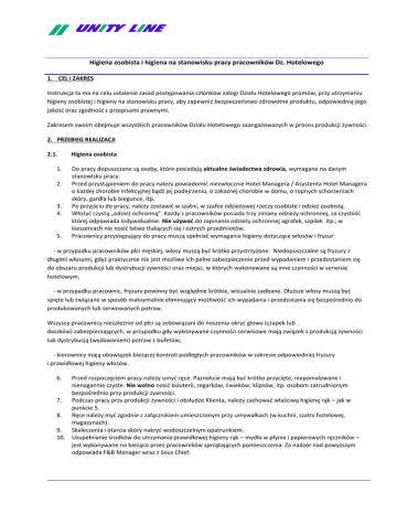 Higiena osobista i higiena na stanowisku pracy pracowników Dz. Hotelowego 1. CEL i ZAKRES Instrukcja ta ma na celu ustalenie zasad postępowania członków załogi Działu Hotelowego promów, przy utrzymaniu higieny osobistej i higieny na stanowisku pracy, aby zapewnić bezpieczeństwo zdrowotne produktu, odpowiednią jego jakość oraz zgodność z przepisami prawnymi. Zakresem swoim obejmuje wszystkich pracowników Działu Hotelowego zaangażowanych w proces produkcji żywności. 2. PRZEBIEG REALIZACJI 2.1. 1. 2. 3. 4. 5. Higiena osobista Do pracy dopuszczane są osoby, które posiadają aktualne świadectwa zdrowia, wymagane na danym stanowisku pracy. Przed przystąpieniem do pracy należy powiadomić niezwłocznie Hotel Managera / Asystenta Hotel Managera o każdej chorobie infekcyjnej bądź jej podejrzeniu, o zakaźnej chorobie w domu, o ropnych schorzeniach skóry, gardła lub biegunce, itp. Po przyjściu do pracy, należy zostawić w szatni, w szafce odzieżowej rzeczy osobiste i odzież osobistą. Włożyć czystą „odzież ochronną”. Każdy z pracowników posiada trzy zmiany odzieży ochronnej, za czystość której odpowiada indywidualnie. Nie używać do zapinania odzieży ochronnej agrafek, szpilek itp.; w kieszeniach nie nosić łatwo tłukących się i ostrych przedmiotów. Pracownicy przystępujący do pracy muszą spełniać wymagania higieny dotyczące włosów i fryzur: - w przypadku pracowników płci męskiej, włosy muszą być krótko przystrzyżone. Niedopuszczalne są fryzury z długimi włosami, gdyż praktycznie nie jest możliwe ich pełne zabezpieczenie przed wypadaniem i przedostaniem się do obszaru produkcji lub dystrybucji żywności oraz miejsc, w których wykonywane są inne czynności w serwisie hotelowym, - w przypadku pracownic, fryzury powinny być względnie krótkie, wizualnie zadbane. Dłuższe włosy muszą być spięte lub związane w sposób maksymalnie eliminujący możliwość ich wypadania i przedostania się bezpośrednio do produkowanych lub serwowanych potraw. Wszyscy pracownicy niezależnie od płci są zobowiązani do noszenia okryć głowy (czapek lub daszków) zabezpieczających, w przypadku gdy wykonywane czynności serwisowe mają związek z produkcją żywności lub dystrybucją (wydawaniem) potraw z bufetów, - kierownicy mają obowiązek bieżącej kontroli podległych pracowników w zakresie odpowiedniej fryzury i prawidłowej higieny włosów. 6. 7. 8. 9. 10. Przed rozpoczęciem pracy należy umyć ręce. Paznokcie mają być krótko przycięte, niepomalowane i nienagannie czyste. Nie wolno nosić biżuterii, zegarków, ćwieków, klipsów, itp. osobom zatrudnionym bezpośrednio przy produkcji żywności. Podczas pracy przy produkcji żywności i obsłudze Klienta, należy zachować właściwą higienę rąk – jak w punkcie 5. Ręce należy myć zgodnie z załącznikiem umieszczonym przy umywalkach (w kuchni, szatni hotelowej, magazynach). Skaleczenia i otarcia skóry nakryć wodoszczelnym opatrunkiem. Uzupełnianie środków do utrzymania prawidłowej higieny rąk – mydła w płynie i papierowych ręczników – jest wykonywane na bieżąco przez pracowników sprzątających pomieszczenia. Za nadzór nad powyższym odpowiada F&B Manager wraz z Sous Chief. Higiena osobista i higiena na stanowisku pracy pracowników Dz. Hotelowego 11. 12. 13. 14. 15. 16. 17. a) b) c) d) e) f) Ręce należy myć zawsze: – po wyjściu z toalety, – po rozmowie telefonicznej, – po drobnych pracach porządkowych, – po wyniesieniu śmieci, – po paczkowaniu jaj; – przed każdorazowym kontaktem z produkcją żywności. W trakcie pracy nie należy: palić, żuć, jeść, nie wolno również pluć, kichać, kaszleć. Wszelkie niedyspozycje zdrowotne należy zgłaszać swojemu przełożonemu. Posiłki należy spożywać tylko w jadalni hotelowej. Nie wolno palić tytoniu w pomieszczenia kuchennych i pomieszczeniach gastronomicznych (restauracja, bary). Przy pakowaniu artykułów spożywczych należy używać rękawiczek jednorazowych. Materiały do pakowania żywności należy przechowywać w miejscach do tego przeznaczonych, w których nie są narażone na zanieczyszczenia. Do krojenia różnego rodzaju surowców / produktów, należy używać sprzętu przeznaczonego wyłącznie do tego celu, tj. noży, desek, sprzętu zmechanizowanego, który jest czysty i zdezynfekowany. Do obróbki surowców, stosowane są deski o określonych kolorach: biała – do chleba oraz używana jako uniwersalna, żółta – do drobiu, niebieska – do ryb i owoców morza, zielona – do warzyw i owoców, czerwona – do mięsa wołowego, brązowa – do mięsa wieprzowego, Uwaga: 18. 19. 20. 21. 22. Przed krojeniem na białej desce innego surowca / produktu (niż chleb), należy deskę wyparzyć przed jej użyciem, a także wymyć i wyparzyć po jej użyciu. Każdą deskę przed użyciem należy sprawdzić pod względem czystości oraz braku uszkodzeń; w przypadkach uzasadnionych – myjemy / wyparzamy. Każdą deskę po użyciu należy wymyć i wyparzyć. Wszelkie uwagi o zniszczeniu, awarii sprzętu lub możliwości jej wystąpienia, należy natychmiast zgłaszać przełożonemu. Za dostępność środków służących do mycia i dezynfekcji osobistej pracowników odpowiada Hotel Manager. Wszelkie odpadki należy gromadzić w pojemnikach do tego przeznaczonych i usuwać po zapełnieniu pojemnika do 2/3 pojemności. W uzasadnionych przypadkach należy zgłosić przełożonemu działania zapobiegawcze / działania korygujące. W przypadku, gdy dany pracownik nie spełnia wymaganych standardów odnośnie prawidłowej higieny osobistej (punkty 1-9) nie może być dopuszczony do wykonywania czynności serwisowych (pracy) w obszarze produkcji żywności lub jej dystrybucji oraz w innych obszarach, gdzie odbywa się bezpośredni serwis na rzecz pasażerów.