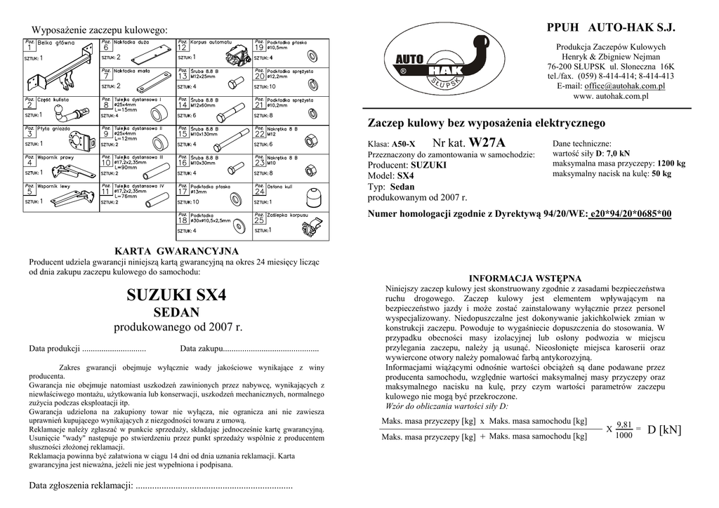 PPUH AUTO-HAK S.J. WyposaŜenie zaczepu kulowego: Produkcja Zaczepów Kulowych Henryk & Zbigniew Nejman 76-200 SŁUPSK ul. Słoneczna 16K tel./fax. (059) 8-414-414; 8-414-413 E-mail: [email protected] www. autohak.com.pl Zaczep kulowy bez wyposaŜenia elektrycznego W27A Klasa: A50-X Nr kat. Przeznaczony do zamontowania w samochodzie: Producent: SUZUKI Model: SX4 Typ: Sedan produkowanym od 2007 r. Dane techniczne: wartość siły D: 7,0 kN maksymalna masa przyczepy: 1200 kg maksymalny nacisk na kulę: 50 kg Numer homologacji zgodnie z Dyrektywą 94/20/WE: e20*94/20*0685*00 KARTA GWARANCYJNA Producent udziela gwarancji niniejszą kartą gwarancyjną na okres 24 miesięcy licząc od dnia zakupu zaczepu kulowego do samochodu: SUZUKI SX4 SEDAN produkowanego od 2007 r. Data produkcji .............................. Data zakupu............................................. Zakres gwarancji obejmuje wyłącznie wady jakościowe wynikające z winy producenta. Gwarancja nie obejmuje natomiast uszkodzeń zawinionych przez nabywcę, wynikających z niewłaściwego montaŜu, uŜytkowania lub konserwacji, uszkodzeń mechanicznych, normalnego zuŜycia podczas eksploatacji itp. Gwarancja udzielona na zakupiony towar nie wyłącza, nie ogranicza ani nie zawiesza uprawnień kupującego wynikających z niezgodności towaru z umową. Reklamacje naleŜy zgłaszać w punkcie sprzedaŜy, składając jednocześnie kartę gwarancyjną. Usunięcie "wady" następuje po stwierdzeniu przez punkt sprzedaŜy wspólnie z producentem słuszności złoŜonej reklamacji. Reklamacja powinna być załatwiona w ciągu 14 dni od dnia uznania reklamacji. Karta gwarancyjna jest niewaŜna, jeŜeli nie jest wypełniona i podpisana. Data zgłoszenia reklamacji: ................................................................... INFORMACJA WSTĘPNA Niniejszy zaczep kulowy jest skonstruowany zgodnie z zasadami bezpieczeństwa ruchu drogowego. Zaczep kulowy jest elementem wpływającym na bezpieczeństwo jazdy i moŜe zostać zainstalowany wyłącznie przez personel wyspecjalizowany. Niedopuszczalne jest dokonywanie jakichkolwiek zmian w konstrukcji zaczepu. Powoduje to wygaśniecie dopuszczenia do stosowania. W przypadku obecności masy izolacyjnej lub osłony podwozia w miejscu przylegania zaczepu, naleŜy ją usunąć. Nieosłonięte miejsca karoserii oraz wywiercone otwory naleŜy pomalować farbą antykorozyjną. Informacjami wiąŜącymi odnośnie wartości obciąŜeń są dane podawane przez producenta samochodu, względnie wartości maksymalnej masy przyczepy oraz maksymalnego nacisku na kulę, przy czym wartości parametrów zaczepu kulowego nie mogą być przekroczone. Wzór do obliczania wartości siły D: Maks. masa przyczepy [kg] x Maks. masa samochodu [kg] Maks. masa przyczepy [kg] + Maks. masa samochodu [kg] X 9,81 = 1000 D [kN] INSTRUKCJA MontaŜu i eksploatacji zaczepu kulowego Oznaczenie zacisku wg ISO PN 1 L 2 + 3 31 4 R 5 58R 6 54 7 58L 15 Łączenie przewodów A Kierunkowskazy lewe Tylne światła przeciwmgłowe Masa Kierunkowskazy prawe Światła pozycyjne prawe Światła hamowania Światła pozycyjne lewe 16 15 6 A L=76mm 4 15 15 16 A Kolejność czynności przy montaŜu L=90mm A 18 18 16 6 9 B 14 7 11 8 3x14 5 C 1 8 C 13 18 10 12 18 9 2 B 3 Niniejszy zaczep kulowy przeznaczony jest do zamontowania w samochodzie: SUZUKI SX4 SEDAN, produkowanym od 2007 r., numer katalogowy W27A i słuŜy do ciągnięcia przyczep o masie całkowitej 1200 kg i nacisku na kulę max 50 kg. OD PRODUCENTA Dziękujemy za wybór produkowanego przez naszą firmę zaczepu kulowego. Jego niezawodność została potwierdzona licznymi testami oraz opiniami zadowolonych klientów. JednakŜe niezawodność zaczepów kulowych jest zaleŜna równieŜ od prawidłowego montaŜu oraz prawidłowej eksploatacji. Z tego powodu prosimy Państwa o staranne przeczytanie niniejszej instrukcji montaŜu oraz przestrzeganie właściwych wskazówek. Zaczep kulowy naleŜy zamontować w miejscach do tego celu przeznaczonych przez producenta samochodu. 1. Zdemontować zderzak wraz z jego metalowym wzmocnieniem. 2. Od spodu samochodu odszukać istniejące otwory A i przewiercić je wiertłem ø11mm do wnętrza bagaŜnika. 3. Od strony bagaŜnika rozwiercić otwory do wymiaru około ø18mm. 4. W powiększone otwory, od strony bagaŜnika wsunąć tulejki dystansowe zgodnie z rysunkiem, przyłoŜyć nakładki duŜe (poz. 6). Wsadzić śruby M10x130mm (poz. 15). 5. Na wystające śruby od spodu samochodu nałoŜyć wsporniki boczne (poz. 4 i 5) i skręcić luźno nakrętkami M10. 6. Od strony bagaŜnika poprzez pozostałe otwory nakładek wywiercić otwory ø11mm. Skręcić luźno śrubami M10x30mm (poz. 16) poprzez przyłoŜoną od spodu nakładki (poz. 7) jak pokazano na rysunku. 7. Belkę główną zaczepu (poz. 1) przyłoŜyć do tylnego płata w taki sposób aby otwory B pokryły się z fabrycznie przygotowanymi otworami w tylnym płacie i skręcić luźno śrubami M12x60mm (poz. 14). NaleŜy pamiętać u tulejach dystansowych (poz. 9). 8. W punktach C wywiercić otwory w tylnym płacie wiertłem ø13mm. 9. Przez wywiercone otwory przełoŜyć śruby M12x60mm (poz. 14). NałoŜyć tuleje dystansowe (poz. 8) i skręcić z belką główną jak pokazano na rysunku. 10. Przykręcić korpus automatu (poz. 12) śrubami M12x25mm (poz. 13) wraz z blachą pod gniazdo (poz. 3). Zamocować kulę (poz. 2) zgodnie z instrukcją dołączaną do zaczepu z końcówką szybkodemontowalną. 11. Dokręcić wszystkie śruby z momentem jak pokazano w tabeli. 12. Zdemontować zderzak wraz z jego metalowym wzmocnieniem. 13. Podłączyć przewody gniazdka 7 – bieg. do instalacji elektrycznej zgodnie z instrukcją fabryczną samochodu (zaleca się wykonanie w ASO). 14. Uzupełnić ewentualne ubytki powłoki malarskiej zaczepu powstałe w trakcie montaŜu. Zalecany moment skręcający dla śrub i nakrętek 8,8: M 8 - 25 Nm M 10 - 55 Nm M 12 - 85 Nm M 14 - 135 Nm UWAGA Po zamontowaniu zac