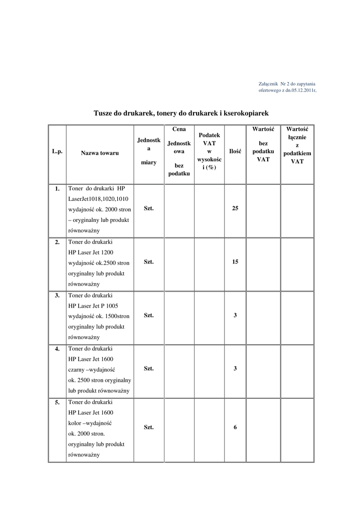 Załącznik Nr 2 do zapytania ofertowego z dn.05.12.2011r, Tusze do drukarek, tonery do drukarek i kserokopiarek Cena L.p. Nazwa towaru Jednostk a miary 1. Jednostk owa bez podatku Podatek VAT w wysokośc i (%) Wartość Ilość Toner do drukarki HP LaserJet1018,1020,1010 wydajność ok. 2000 stron Szt. 25 Szt. 15 Szt. 3 Szt. 3 Szt. 6 – oryginalny lub produkt równoważny 2. Toner do drukarki HP Laser Jet 1200 wydajność ok.2500 stron oryginalny lub produkt równoważny 3. Toner do drukarki HP Laser Jet P 1005 wydajność ok. 1500stron oryginalny lub produkt równoważny 4. Toner do drukarki HP Laser Jet 1600 czarny –wydajność ok. 2500 stron oryginalny lub produkt równoważny 5. Toner do drukarki HP Laser Jet 1600 kolor –wydajność ok. 2000 stron. oryginalny lub produkt równoważny bez podatku VAT Wartość łącznie z podatkiem VAT 6. Toner do drukarki HP Laser Jet 1150 czarny, wydajność Szt. 4 Szt. 4 Szt. 3 Szt. 3 Szt. 3 Szt. 4 Szt. 6 Szt. 3 ok.2500 stron. oryginalny lub produkt równoważny 7. Toner do drukarki HP Laser Jet 1320N Czarny, wydajność ok. 2500stron. oryginalny lub produkt równoważny 8. Toner do drukarki HP Laser Jet 2420N wydajność ok. 6000 stron. oryginalny lub produkt równoważny 9. Toner do drukarki HP Laser Jet P1102 wydajność ok. 1600 stron. oryginalny lub produkt równoważny 10. Toner do drukarki Brother MFC -7820N wydajność ok. 2500 stron. oryginalny lub produkt równoważny 11. Toner do drukarki Brother DPC-6690 CW czarny –wydajność ok.450 stron. oryginalny lub produkt równoważny 12 Toner do drukarki Brother DPC-6690 CW kolor –wydajność ok.325 stron. oryginalny lub produkt równoważny 12. Toner do drukarki HP Laser Jet P 2055 -wydajność ok. 2300 str. oryginalny lub produkt równoważny 13. Toner do drukarki Lexmark E 120 -wydajność ok.2000 Szt. 12 Szt. 2 Szt. 3 Szt. 3 Szt. 4 Szt. 3 Szt. 6 Szt. 12 stron. oryginalny lub produkt równoważny 14. Toner do drukarki Lexmark E 340 wydajność ok. 2500 str. oryginalny lub produkt równoważny 15. Toner do drukarki Lexmark E 260 -wydajność ok. 3500 str. oryginalny lub produkt równoważny 16. Toner do drukarki Lexmark T 640 -wydajność ok.6000 str. oryginalny lub produkt równoważny 17. Toner do drukarki OKI B430d-wydajność ok.3500 stron. oryginalny lub produkt równoważny `18. Toner do drukarki SAMSUNG ML 1665 wydajność ok. 1500 str. oryginalny lub produkt równoważny 19. Kartridż do drukarki Canon Pixma i X7000 7 BK pojemność 25 ml. oryginalny lub produkt równoważny 20. Kartridż do drukarki Canon Pixma i X7000 kolor 9- Y, C, M, pojemność 14 ml. oryginalny lub produkt równoważny 21. Kartridż do drukarki Canon Pixma i X7000 9 PBK –pojemność 14 Szt. 4 Szt. 3 Szt. 3 Szt. 6 Szt. 3 Szt. 6 Szt. 6 Szt. 9 ml. oryginalny lub produkt równoważny 22. Kartridż do drukarki Canon Pixma i X7000 9 -CLEAR –pojemność 191ml. oryginalny lub produkt równoważny 23. Kartridż do drukarki HP DJ 488 CA czarny – pojemność 42 ml. oryginalny lub produkt równoważny 24. Kartridż do drukarki HP DJ 488 CA kolor – pojemność 42 ml. oryginalny lub produkt równoważny 25. Kartridż do drukarki HP Office Jet 6000-XL czarny – pojemność 49 ml. oryginalny lub produkt równoważny 26. Kartridż do drukarki HP Office Jet 6000-XL kolor – pojemność 6 ml. oryginalny lub produkt równoważny 27. Kartridż do drukarki HP Office Jet 8000-XL czarny XL – pojemność 49 ml oryginalny lub produkt równoważny 28. Kartridż do drukarki HP Office Jet 8000-XL kolor XL – pojemność 6 ml. oryginalny lub produkt równoważny 29. Kartridż do drukarki HP DJ D 4360 Czarny XL- pojemność Szt. 3 Szt. 6 Szt. 3 Szt. 2 Szt. 6 Szt. 4 Szt. 2 Szt. 2 25 ml. oryginalny lub produkt równoważny 30. Kartridż do drukarki HP DJ D 4360 Kolor XL- pojemność 13 ml. oryginalny lub produkt równoważny 31. Kartridż do drukarki HP DJ 5150 czarny – pojemność 19 ml. oryginalny lub produkt równoważny 32. Kartridż do drukarki HP DJ 5150 kolor –pojemność 17 ml. oryginalny lub produkt równoważny 33. Kartridż do drukarki HP DJ 1120c czarny – pojemność 42 ml. oryginalny lub produkt równoważny 34. Kartridż do drukarki HP DJ 1120c kolor – pojemność 15 ml. oryginalny lub produkt równoważny 35. Kartridż do drukarki HP DJ 1125c czarny – pojemność 42 ml. oryginalny lub produkt równoważny 36. Kartridż do drukarki HP DJ 1125c kolor – pojemność 15 ml. oryginalny lub produkt równoważny 37. Kartridż do drukarki HP DJ 1220c czarny – pojemność Szt. 2 Szt. 2 Szt. 6 Szt. 4 Szt. 6 Szt. 4 Szt. 3 Szt. 3 42 ml. oryginalny lub produkt równoważny 38. Kartridż do drukarki HP DJ 1220c kolor – pojemność 19 ml. oryginalny lub produkt równoważny 39. Kartridż do drukarki HP DJ 710c czarny – pojemność 42 ml. oryginalny lub produkt równoważny 40. Kartridż do drukarki HP DJ 710c kolor – pojemność 15 ml. oryginalny lub produkt równoważny 41. Kartridż do drukarki HP PSC 1510 czarny – pojemność 5 ml. oryginalny lub produkt równoważny 42. Kartridże do drukarki HP PSC 1510 kolor – pojemność 5ml. oryginalny lub produkt równoważny 43. Kartridż do drukarki HP DJ 6540 czarny – pojemność 11 ml. oryginalny lub produkt równoważny 44. Kartridż do drukarki HP DJ 6540 kolor – pojemność 7 ml. oryginalny lub produkt równoważny 45. Kartridż do drukarki HP Office Jet PRO K 5400 czarny XL – Szt. 3 Szt. 6 Szt. 3 Szt. 6 Szt. 3 Szt. 6 Szt. 4 Szt. 3 pojemność 58,9 ml. oryginalny lub produkt równoważny 46. Kartridż do drukarki HP Office Jet PRO K 5400 kolor XL– pojemność 17,1 ml. oryginalny lub produkt równoważny 47. Kartridż do drukarki HP OJ PRO K 8600 czarny XL– pojemność 58,9 ml. oryginalny lub produkt równoważny 48. Kartridż do drukarki HP OJ PRO K 8600 kolor XL– pojemność 17,1 ml. oryginalny lub produkt równoważny 49. Kartridż do drukarki HP Deskjet 3650 czarny– pojemność 10 ml. oryginalny lub produkt równoważny 50. Kartridż