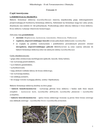 Mikrobiologia – II rok Towaroznawstwo i Dietetyka Ćwiczenie 11 Część teoretyczna I. FERMENTACJA MLEKOWA Bakterie fermentacji mlekowej (Lactobacillaceae) stanowią niejednorodną grupę mikroorganizmów przeprowadzających beztlenową fermentację mlekową. Substratami tej fermentacji mogą być cukry proste, disacharydy oraz niektóre tri- lub polisacharydy. Przekształcają cukier mleczny (laktozę) w kwas mlekowy. Kwas mlekowy wykazuje właściwości konserwujące. Zaliczamy tutaj gramdodatnie: ziarniaki: Streptococcus, Lactococcus, Leuconostoc, Oenococcus, Pediococcus regularne, nieprzetrwalnikujące laseczki (zwane pałeczkami mlekowymi): Lactobacillus ze względu na podobne wykorzystanie i podobieństwo prowadzonych procesów również nieregularne, nieprzetrwalnikujące pałeczki Bifidobacterium są coraz częściej zaliczane do bakterii fermentacji mlekowej (choć nie należą do rodziny Lactobacillaceae) Cechy charakterystyczne: • grupa silnie zróżnicowana morfologicznie (pałeczki, laseczki, formy kuliste), • nie wytwarzają przetrwalników, • są to bakterie gramdodatnie, • są beztlenowcami, • mają zdolność rozkładu laktozy do kwasu mlekowego, • nie wytwarzają katalazy, • nie redukują azotanów, • do swojego wzrostu wymagają adeniny, tyminy i hipoksantyny. Bakterie fermentacji mlekowej dzielimy na dwie grupy: • bakterie homofermentatywne – wytwarzają głównie kwas mlekowy i bardzo małe ilości innych związków – Lactococcus lactis, Lactobacillus delbrueckii, Lactobacillus plantarum i Lactobacillus acidophilus, • bakterie heterofermentatywne – oprócz kwasu mlekowego tworzone są pewne ilości kwasu octowego oraz aldehydu octowego – Lactobacillus brevis i Lactobacillus fermentum. 1 Mikrobiologia – II rok Towaroznawstwo i Dietetyka Kefir – sporządzany z mleka krowiego lub koziego, fermentację powodują drobnoustroje w postaci ziaren kefirowych złożonych z bakterii Lactobacillaceae (Streptococcus lactis 75% i Betabacterium caucasicum 25%) żyjących w symbiozie z drożdżami z gatunku Candida kefyr. Minimum cukrowe – najmniejsza ilość cukru zawarta w kiszonym materiale, dostateczna aby bakterie fermentacji mlekowej mogły go rozkładać do kwasu mlekowego w takiej ilości, aby pH całej zakiszanej masy wyniosło 4,2. II. PROBIOTYKI Probiotyki to pojedyncze lub mieszane kultury żywych mikroorganizmów, które podawane człowiekowi lub zwierzętom wywierają na ich organizmy korzystny wpływ. Ich działanie polega na utrzymywaniu właściwej równowagi mikroflory zasiedlającej organizm ludzki. Mikroflora jelitowa człowieka: autochtoniczna – Bacteroides, Bifidobacterium, Lactobacillus allochtoniczna (przejściowa, w tym również patogenna) rywalizuje o miejsce bytowania i w niektórych sytuacjach (np. po kuracji antybiotykowej) wypiera prawidłowe mikroorganizmy, podawanie preparatów probiotycznych pozwala przywrócić naturalną mikroflorę, bakterie probiotyczne muszą być odporne na niskie pH soku żołądkowego i na sole żółci Do bakterii o udokumentowanych cecha probiotycznych zalicza się: Lactobacillus acidophilus, Lactobacillus casei, Lactobacillus paracasei, bakterie z rodzaju Bifidobacterium. III. PRÓBA REDUKTAZOWA – opis i zasada a) 10 cm3 dokładnie wymieszanego mleka przenieść do sterylnej probówki i jałowo dodać 0,5 cm3 błękitu metylenowego, zamienić korek z waty na jałowy korek z tworzywa sztucznego lub zakleić parafilmem, b) dokładnie wymieszać zawartość probówki, obracając ja kilkakrotnie do góry dnem, c) probówkę wstawić do łaźni wodnej o temp. 35-37ºC, d) jednocześnie umieścić w łaźni probówkę z 1 cm3 mleka i termometrem w celu stwierdzenia, kiedy zawartość probówki osiągnie temp. 37ºC, e) od tego momentu liczyć czas inkubacji mleka w łaźni. Obserwacje prowadzić na początku, co 10 min., a później co 30 min. Co 30 min należy probówkę odwrócić do góry dnem i z powrotem co zapobiega powstawaniu warstwy tłuszczu unieruchamiającej drobnoustroje, f) oznaczenie uznać za zakończone, gdy mleko w probówce (z wyjątkiem 0,5 cm warstwy górnej) zostanie odbarwione, g) zależność między czasem odbarwienia, a zawartością drobnoustrojów przedstawia tabela: Czas odbarwiania błękitu metylenowego < 20 min. 20 min. – 2 godz. 2,0 – 5,5 godz. 5,5 – 7,0 godz. > 7,0 godz. Liczba bakterii w 1 cm3 (mln) > 20 20 – 4 4 – 0,5 0,5 – 0,1 < 0,1 Jakość mleka Bardzo zła Zła Średnia Dobra Bardzo dobra 2 Mikrobiologia – II rok Towaroznawstwo i Dietetyka Próba reduktazowa polega na badaniu szybkości zużycia tlenu znajdującego się w mleku. Każde mleko zawiera mikroorganizmy, to lepszej jakości będzie ich posiadało mniej, to złej jakości więcej. Więcej drobnoustrojów to szybsze zużycie tlenu, mniej to wolniejsze zużycie. Po zużyciu tlenu drobnoustroje wykorzystują jako akceptora wodoru błękit metylenowy, który na skutek zmian osydo-redukcyjnych środowiska staje się bezbarwny. Im szybciej nastąpi odbarwienie mleka tym pewniejsze, że mleko posiada dużo mikroorganizmów i jest gorszej jakości. Część praktyczna: Wszystkie doświadczenia należy wykonać w warunkach sterylnych! 1. Odczyty posiewów z metody popłuczyn a) policzyć ilość drobnoustrojów na agarze odżywczym przed myciem i po myciu, uwzględniając rozcieńczenia, obliczyć efekt dezynfekcyjny dla bakterii (y = 100 – B/A * 100%). Te same obliczenia wykonać dla drobnoustrojów na agarze brzeczkowym b) wyniki zapisać w tabeli zbiorczej (na ćwiczeniach) c) wykorzystując średnie dla drobnoustrojów, objętość popłuczyn i posiewów oraz pole powierzchni butelki obliczyć ilość bakterii oraz grzybów w jtk na 1 cm2 powierzchni d) obliczenia, tabelę zbiorczą i omówienie wyników zamieścić w sprawozdaniu 3. 2. Odczyty posiewów z metody bezpośredniej (Richtera) a) policzyć ilość drobnoustrojów wyrosłych wewnątrz słoiczka i pole powierzchni sł