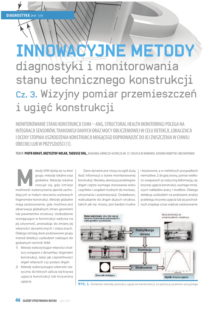 DIAGNOSTYKA >> SHM INNOWACYJNE METODY diagnostyki i monitorowania stanu technicznego konstrukcji Wizyjny pomiar przemieszczeń i ugięć konstrukcji Cz. 3. MONITOROWANIE STANU KONSTRUKCJI (SHM – ANG. STRUCTURAL HEALTH MONITORING) POLEGA NA INTEGRACJI SENSORÓW, TRANSMISJI DANYCH ORAZ MOCY OBLICZENIOWEJ W CELU DETEKCJI, LOKALIZACJI I OCENY STOPNIA USZKODZENIA KONSTRUKCJI MOGĄCEGO DOPROWADZIĆ DO JEJ ZNISZCZENIA W CHWILI OBECNEJ LUB W PRZYSZŁOŚCI [1]. TEKST: PIOTR KOHUT, KRZYSZTOF HOLAK, TADEUSZ UHL, AKADEMIA GÓRNICZOHUTNICZA IM. ST. STASZICA W KRAKOWIE, KATEDRA ROBOTYKI I MECHATRONIKI etody SHM dzielą się na dwie grupy: metody lokalne oraz globalne. Metody lokalne stosuje się, gdy istnieje możliwość wykorzystania zjawisk zachodzących w małym otoczeniu wybranych fragmentów konstrukcji. Metody globalne mają zastosowanie, gdy możliwa jest obserwacja globalnych zmian geometrii lub parametrów struktury. Uszkodzenie występujące w konstrukcji wpływa na jej sztywność, prowadząc do zmiany jej własności dynamicznych i statycznych. Dlatego istnieją dwie podstawowe grupy metod detekcji uszkodzeń należące do globalnych technik SHM: 1) Metody wykorzystujące własności struktury związane z dynamiką i drganiami konstrukcji, takie jak częstotliwości drgań własnych czy postaci drgań. 2) Metody wykorzystujące własności statyczne, do których zalicza się krzywa ugięcia konstrukcji lub krzywizna ugięcia. M 46 SŁUŻBY UTRZYMANIA RUCHU lipiec 2012 Dane dynamiczne niosą na ogół dużą ilość informacji o stanie monitorowanej konstrukcji. Niestety, akwizycja przebiegów drgań często wymaga stosowania wielu czujników i urządzeń trudnych do montażu, utrzymania i automatyzacji. Dodatkowo, wzbudzanie do drgań dużych struktur, takich jak np. mosty, jest bardzo trudne i kosztowne, a w niektórych przypadkach niemożliwe. Z drugiej strony, pomiar wielkości związanych ze statyczną deformacją, np. krzywej ugięcia konstrukcji, wymaga mniejszych nakładów pracy i środków. Dlatego detekcja uszkodzeń na podstawie analizy przebiegu krzywej ugięcia lub jej pochodnych znajduje coraz większe zastosowanie. RYS. 1. Schemat metody pomiaru ugięcia konstrukcji za pomocą systemu wizyjnego W przypadku konstrukcji o skomplikowanych kształtach rośnie ilość sensorów służących do pomiaru przemieszczeń, a wraz z nią koszt systemu monitorującego jej stan. W wielu zastosowaniach umieszczenie sensorów na obiekcie jest bardzo trudne lub niemożliwe ze względu na warunki środowiskowe lub geometryczne. Istnieje potrzeba coraz szerszego wprowadzania systemów bezkontaktowych jako atrakcyjnej alternatywy dla sieci czujników pomiarowych. Przykładowo, systemy wizyjne znajdują coraz większe zastosowanie w monitorowaniu stanu konstrukcji. Ich głównymi zaletami są duża gęstość pomiarowa, niski koszt oraz uniwersalność zastosowania. Przedstawiona w artykule metoda pomiarowa [2] umożliwia wizyjny pomiar ugięcia konstrukcji w płaszczyźnie. Proces pomiarowy składa się z następujących kroków: kalibracji systemu, usunięcia zniekształceń perspektywicznych z obrazu, jeśli zachodzi taka konieczność, oraz właściwego pomiaru ugięcia. W pierwszym kroku wyznaczany jest współczynnik skali, niezbędny do wyrażenia zmierzonej wartości ugięcia w jednostkach metrycznych. Kalibracja skali może być przeprowadzana na różne sposoby, najczęściej za pomocą specjalnych tablic skalujących. W kolejnym kroku, rejestrowane są obrazy konstrukcji: obraz referencyjny oraz obrazy konstrukcji poddanej działaniu obciążenia. System umożliwia wykonanie kolejnych fotografii badanego obiektu z różnych punktów przestrzeni, co oznacza, że położenie i orientacja aparatu pomiarowego podczas akwizycji kolejnych zdjęć może być dowolna. Obrazy wykonane w taki sposób posiadają zniekształcenia perspektywiczne, dlatego należy przeprowadzić usunięcie wpływu efektu perspektywy. Na obiekcie umieszczany jest zestaw prostokątnych znaczników, współpłaszczyznowych z analizowaną płaszczyzną konstrukcji. Znaczniki te są wykrywane i dopasowywane automatycznie na dwóch obrazach: referencyjnym oraz po przyłożeniu obciążeń. Po rektyfikacji, czyli usunięciu efektu pespektywy, fotografie wykonane z różnych punktów przestrzeni mogą zostać na siebie nałożone. W ostatnim kroku wykonuje się pomiar ugięcia konstrukcji za pomocą współczynnika korelacji. Konstrukcja jest dzielona na fragmenty, wzorce jasności. Krzywa ugięcia obliczana jest na podstawie różnic pomiędzy położeniami odpowiadających sobie wzorców jasności na dwóch obrazach. Metoda pomiarowa została schematycznie przedstawiona na rysunku 1. Wizyjny system pomiarowy umożliwia monitorowanie statycznych przemieszczeń, ugięć i deformacji konstrukcji inżynierii lądowej. Urządzenie składa się z jednego lub więcej fotograficznych aparatów pomiarowych o wysokiej rozdzielczości oraz oprogramowania pracującego w środowisku Windows. W skład systemu wchodzą także oświetlenie i zestaw znaczników. Dwuwymiarowe pole przemieszczeń punktów konstrukcji otrzymywane jest w wyniku przetwarzania i analizy obrazów zarejestrowanych przed i po obciążeniu konstrukcji. Metoda umożliwia wykonywanie kolejnych fotografii obiektu z różnych punktów przestrzennych. REKLAMA SHM >> DIAGNOSTYKA ul. Poznańska 129/133; 05-850 Ożarów Mazowiecki, tel. (+48 22) 666 01 45 tel. Biuro Handlowe: +(48 22) 666 14 06, (+48 22) 733 54 21, fax (+48 22) 665 21 55 e-mail: info vigo.com.pl zobacz lepiej niż inni Ceny kamer już od 29 500 zł OFERUJEMY: kamery termograficzne kamery termograficzne do strefy EX mierniki wilgotności i temperatury analizatory gazów pirometry multimetry, mierniki, testery, kalibratory www.vigo.com.pl lipiec 2012 SŁUŻBY UTRZYMANIA RUCHU 47 DIAGNOSTYKA >> SHM o długości 13,5 m. Rejestrowano przebieg ugięcia konstrukcji pod wpływem ciężaru przejeżdżających n