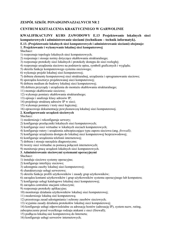 ZESPÓŁ SZKÓŁ PONADGIMNAZJALNYCH NR 2 CENTRUM KSZTAŁCENIA KRAKTYCZNEGO W GARWOLINIE KWALIFIKACYJNY KURS ZAWODOWY E.13 Projektowanie lokalnych sieci komputerowych i administrowanie sieciami (technikum – technik informatyk). E.13. (Projektowanie lokalnych sieci komputerowych i administrowanie sieciami) obejmuje: 1. Projektowanie i wykonywanie lokalnej sieci komputerowej Słuchacz: 1) rozpoznaje topologie lokalnych sieci komputerowych; 2) rozpoznaje i stosuje normy dotyczące okablowania strukturalnego; 3) rozpoznaje protokoły sieci lokalnych i protokoły dostępu do sieci rozległej; 4) rozpoznaje urządzenia sieciowe na podstawie opisu, symboli graficznych i wyglądu; 5) określa funkcje komputerowego systemu sieciowego; 6) wykonuje projekt lokalnej sieci komputerowej; 7) dobiera elementy komputerowej sieci strukturalnej, urządzenia i oprogramowanie sieciowe; 8) sporządza kosztorys projektowanej sieci komputerowej; 9) dobiera medium do budowy lokalnej sieci komputerowej; 10) dobiera przyrządy i urządzenia do montażu okablowania strukturalnego; 11) montuje okablowanie sieciowe; 12) wykonuje pomiary okablowania strukturalnego; 13) opisuje i analizuje klasy adresów IP; 14) projektuje strukturę adresów IP w sieci; 15) wykonuje pomiary i testy sieci logicznej; 16) opracowuje dokumentację powykonawczą lokalnej sieci komputerowej. 2. Konfigurowanie urządzeń sieciowych Słuchacz: 1) modernizuje i rekonfiguruje serwery; 2) konfiguruje przełączniki lokalnych sieci komputerowych; 3) konfiguruje sieci wirtualne w lokalnych sieciach komputerowych; 4) konfiguruje rutery i urządzenia zabezpieczające typu zapora sieciowa (ang. firewall); 5) konfiguruje urządzenia dostępu do lokalnej sieci komputerowej bezprzewodowej; 6) konfiguruje urządzenia telefonii internetowej; 7) dobiera i stosuje narzędzia diagnostyczne; 8) tworzy sieci wirtualne za pomocą połączeń internetowych; 9) monitoruje pracę urządzeń lokalnych sieci komputerowych. 3. Administrowanie sieciowymi systemami operacyjnymi Słuchacz: 1) instaluje sieciowe systemy operacyjne; 2) konfiguruje interfejsy sieciowe; 3) udostępnia zasoby lokalnej sieci komputerowej; 4) charakteryzuje usługi serwerowe; 5) określa funkcje profili użytkowników i zasady grup użytkowników; 6) zarządza kontami użytkowników i grup użytkowników systemu operacyjnego lub komputera; 7) konfiguruje usługi katalogowe lokalnej sieci komputerowej; 8) zarządza centralnie stacjami roboczymi; 9) rozpoznaje protokoły aplikacyjne; 10) monitoruje działania użytkowników lokalnej sieci komputerowej; 11) modernizuje lokalną sieć komputerową; 12) przestrzega zasad udostępniania i ochrony zasobów sieciowych; 13) wyjaśnia zasady działania protokołów lokalnej sieci komputerowej; 14) konfiguruje usługi odpowiedzialne za adresację hostów (adresację IP), system nazw, ruting, zabezpieczenie przed wszelkiego rodzaju atakami z sieci (firewall); 15) podłącza lokalną sieć komputerową do Internetu; 16) konfiguruje usługi serwerów internetowych; 17) określa rodzaje awarii lub wadliwego działania lokalnej sieci komputerowej; 18) lokalizuje i usuwa przyczyny wadliwego działania systemów sieciowych; 19) zabezpiecza komputery przed zawirusowaniem, niekontrolowanym przepływem informacji oraz utratą danych. Technik informatyk potwierdzając kwalifikacje wchodzące w skład tego zawodu, uzyskuje wiedzę i umiejętności niezbędne do pracy w trzech obszarach branży informatycznej. (E12) Technik informatyk planuje konfiguracje, dobiera podzespoły i montuje z nich komputery. Nadzoruje organizacją pracy podczas montażu. Przygotowuje do pracy systemy komputerowe z oprogramowaniem systemowym i narzędziowym. Przygotowuje i konfiguruje urządzenia peryferyjne. Doradza klientowi w zakresie konfiguracji i modernizacji systemów komputerowych i urządzeń peryferyjnych. Odpowiada za konserwacje urządzeń techniki komputerowej w czasie ich okresu użytkowania. Zabezpiecza, rekonfiguruje i utrzymuje w optymalnej wydajności systemy operacyjne. Wykonuje zadania serwisowe polegające na diagnozowaniu i usuwaniu usterek komputera osobistego, urządzeń peryferyjnych i systemu operacyjnego. Monitoruje pracę systemów komputerowych. Wycenia i kosztorysuje konfiguracje systemów komputerowych oraz ich konserwacje i naprawy. Dba o aspekty ekologiczne na stanowisku pracy (recycling) oraz o bezpieczeństwo i higienę pracy. Potrafi zorganizować i prowadzić sklep komputerowy, serwis czy hurtownię komputerową. (E13) Technik informatyk wykonuje projekt okablowania strukturalnego lokalnej sieci komputerowej. Dobiera urządzenia sieciowe, komputery, medium transmisyjne oraz oprogramowanie systemowe i narzędziowe do pracy w sieci lokalnej. Montuje elementy lokalnej sieci komputerowej według projektu. Instaluje i konfiguruje urządzenia sieciowe i sieciowe systemy operacyjne. Odpowiada za właściwe działanie lokalnej sieci komputerowej. Projektuje i wykonuje modernizację lokalnej sieci komputerowej. Administruje zasobami i użytkownikami lokalnej sieci komputerowej. Podłącza sieć lokalną do Internetu i zabezpiecza przepływ danych w sieci. Nadzoruje politykę bezpieczeństwa danych osobowych w postaci elektronicznej. Diagnozuje i naprawia awarie występujące w lokalnej sieci komputerowej. Organizuje pracę podczas montażu sieci i jej naprawy przestrzegając zasad bezpieczeństwa i higieny pracy. Nadzoruje procesami projektowania, montażu i naprawy lokalnej sieci komputerowej. Jest przygotowany do prowadzenia działalności usługowej dotyczącej lokalnej sieci komputerowej. (E14) Technik informatyk projektuje i wykonuje strony internetowe, sklepy internetowe i systemy zarządzania treścią. Buduje dynamiczne witryny wykorzystujące internetowe bazy danych i usługi zdalnych serwerów. Tworzy aplikacje, skrypty i aplety wykonywane po stronie klienta oraz serwera. Administruje aplikacjami i witrynami internetowymi. Projektuje i tworzy bazy dan