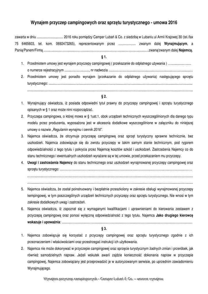 Wynajem przyczep campingowych oraz sprzętu turystycznego - umowa 2016 zawarta w dniu .............................. 2016 roku pomiędzy Camper Lubań & Co. z siedzibą w Lubaniu ul Armii Krajowej 30 (tel./fax 75 6465603, tel. kom. 0692473265), reprezentowanym przez …………….. zwanym dalej Wynajmującym, a Panią/Panem/Firmą ........................................................................................................................zwaną/zwanym dalej Najemcą. § 1. 1. Przedmiotem umowy jest wynajem przyczepy campingowej ( przekazanie do odpłatnego używania ) …....................... o numerze rejestracyjnym ............................, nr nadwozia ................................................................................................ 2. Przedmiotem umowy jest ponadto wynajem (przekazanie do odpłatnego używania) następującego sprzętu turystycznego: .................................................................................................................................................................... ............................................................................................................................................................................................. § 2. 1. Wynajmujący oświadcza, iż posiada odpowiedni tytuł prawny do przyczepy campingowej i sprzętu turystycznego opisanych w § 1 oraz może nimi rozporządzać. 2. Przyczepa campingowa, o której mowa w § 1ust.1, obok urządzeń technicznych wyszczególnionych dla danego typu modelu przez producenta, wyposażona jest w akcesoria dodatkowe wyszczególnione w załączniku do niniejszej umowy o nazwie „Regulamin wynajmu i cennik 2016”. 3. Najemca oświadcza, że otrzymuje przyczepę campingową oraz sprzęt turystyczny sprawne technicznie, bez uszkodzeń. Najemca zobowiązuje się do zwrotu przyczepy w takim samym stanie technicznym, pod rygorem odpowiedzialności z tego tytułu i pokrycia przez Najemcę kosztów szkód i uszkodzeń. Zastrzeżenia Najemcy co do stanu technicznego i ewentualnych uszkodzeń wyrażane są w tej umowie, przed przekazaniem mu przyczepy. 4. Uwagi i zastrzeżenia Najemcy do stanu technicznego oraz uszkodzeń wynajmowanej przyczepy campingowej oraz sprzętu turystycznego: ....................................................................................................................................................... ............................................................................................................................................................................................. ............................................................................................................................................................................................. 5. Najemca oświadcza, że został poinstruowany i bezpłatnie przeszkolony w zakresie obsługi wynajmowanej przyczepy kempingowej, w tym poszczególnych urządzeń technicznych przyczepy oraz sprzętu turystycznego. Nie wnosi w tym zakresie dodatkowych uwag i zastrzeżeń. 6. Najemca oświadcza, iż zapoznał się z wymaganymi kwalifikacjami i uprawnieniami do kierowania zestawem z przyczepą campingową oraz ponosi wyłączną odpowiedzialność z tego tytułu. Najemca Jako drugiego kierowcę wskazuje i upoważnia: ..................................................................................................................................................... § 3. 1. Najemca zobowiązuje się korzystać z przyczepy campingowej oraz sprzętu turystycznego zgodnie z ich przeznaczeniem i właściwościami oraz przestrzegać instrukcji ich użytkowania. 2. Najemca nie może dokonywać w przyczepie campingowej oraz sprzęcie turystycznym żadnych zmian i przeróbek, jak również samodzielnych napraw. Jeżeli wskutek awarii zajdzie konieczność dokonania napraw w przyczepie campingowej, Najemca zobowiązany jest przeprowadzić je w autoryzowanym serwisie, po uprzednim zawiadomieniu Wynajmującego. W Wyynnaajjeem m pprrzzyycczzeepp ccaam mppiinnggoow wyycchh -- C Caam mppeerr LLuubbaańń && C Coo.. –– uum moow waa w wyynnaajjm muu -23. Szczegółowe warunki i zasady wynajmu przyczep kempingowych oraz sprzętu turystycznego, obowiązki i prawa stron, zobowiązania i odpowiedzialność Najemcy oraz inne postanowienia określa „Regulamin wynajmu i cennik 2016” stanowiący załącznik do niniejszej umowy i jej integralną część. § 4. 1. Przyczepę campingową oraz sprzęt turystyczny ,o których mowa wyżej, wynajmuje się od dnia ................................... 2016 roku do dnia .................................2016 roku, do godz.15.00. Najemca zobowiązuje się do zwrotu przedmiotu najmu do upływu tego terminu, pod rygorem kar określonych w „Regulaminie wynajmu i cenniku 2016” . 2. Miejsce odbioru przyczepy kempingowej: ...................................................................................................... 3. Miejsce zwrotu przyczepy kempingowej : ....................................................................................................... 4. Najemca nie ma prawa przedłużenia terminu wynajmu bez wyraźnej zgody Camper Lubań. § 5. 1. Opłaty, wraz z należnym podatkiem VAT, z tytułu wynajmu przyczepy i sprzętu turystycznego wynoszą: - za przyczepę campingową .....................................zł ( razem z uiszczoną 20% zaliczką ) - za sprzęt turystyczny .....................................zł - za środki chemiczne do toalety .....................................zł - ryczałt za zużycie gazu 30 zł - za transport przyczepy ......................................zł - z tytułu kaucji - RAZEM DO ZAPŁATY 700 zł …...................................zł (słownie: ...........................................................) 2. Na poczet należności Wynajmującego zaliczana jest przedpłata dokonana przez Najemcę w momencie rezerwacji. Najemca zobowiązany jest wpłaci