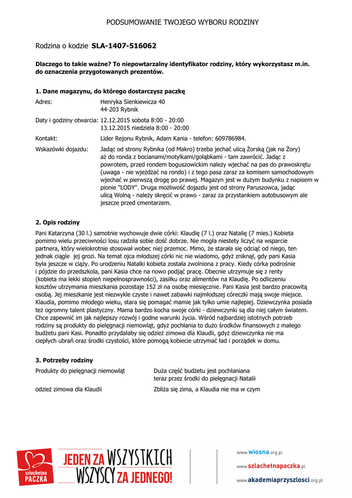 PODSUMOWANIE TWOJEGO WYBORU RODZINY Rodzina o kodzie SLA-1407-516062 Dlaczego to takie ważne? To niepowtarzalny identyfikator rodziny, który wykorzystasz m.in. do oznaczenia przygotowanych prezentów. 1. Dane magazynu, do którego dostarczysz paczkę Adres: Henryka Sienkiewicza 40 44-203 Rybnik Daty i godziny otwarcia: 12.12.2015 sobota 8:00 - 20:00 13.12.2015 niedziela 8:00 - 20:00 Kontakt: Lider Rejonu Rybnik, Adam Kania - telefon: 609786984. Wskazówki dojazdu: Jadąc od strony Rybnika (od Makro) trzeba jechać ulicą Żorską (jak na Żory) aż do ronda z bocianami/motylkami/gołąbkami - tam zawrócić. Jadąc z powrotem, przed rondem boguszowickim należy wjechać na pas do prawoskrętu (uwaga - nie wjeżdżać na rondo) i z tego pasa zaraz za komisem samochodowym wjechać w pierwszą drogę po prawej. Magazyn jest w dużym budynku z napisem w pionie "LODY". Druga możliwość dojazdu jest od strony Paruszowca, jadąc ulicą Wolną - należy skręcić w prawo - zaraz za przystankiem autobusowym ale jeszcze przed cmentarzem. 2. Opis rodziny Pani Katarzyna (30 l.) samotnie wychowuje dwie córki: Klaudię (7 l.) oraz Natalię (7 mies.) Kobieta pomimo wielu przeciwności losu radziła sobie dość dobrze. Nie mogła niestety liczyć na wsparcie partnera, który wielokrotnie stosował wobec niej przemoc. Mimo, że starała się odciąć od niego, ten jednak ciągle jej grozi. Na temat ojca młodszej córki nic nie wiadomo, gdyż zniknął, gdy pani Kasia była jeszcze w ciąży. Po urodzeniu Natalki kobieta została zwolniona z pracy. Kiedy córka podrośnie i pójdzie do przedszkola, pani Kasia chce na nowo podjąć pracę. Obecnie utrzymuje się z renty (kobieta ma lekki stopień niepełnosprawności), zasiłku oraz alimentów na Klaudię. Po odliczeniu kosztów utrzymania mieszkania pozostaje 152 zł na osobę miesięcznie. Pani Kasia jest bardzo pracowitą osobą. Jej mieszkanie jest niezwykle czyste i nawet zabawki najmłodszej córeczki mają swoje miejsce. Klaudia, pomimo młodego wieku, stara się pomagać mamie jak tylko umie najlepiej. Dziewczynka posiada też ogromny talent plastyczny. Mama bardzo kocha swoje córki - dziewczynki są dla niej całym światem. Chce zapewnić im jak najlepszy rozwój i godne warunki życia. Wśród najbardziej istotnych potrzeb rodziny są produkty do pielęgnacji niemowląt, gdyż pochłania to dużo środków finansowych z małego budżetu pani Kasi. Ponadto przydałaby się odzież zimowa dla Klaudii, gdyż dziewczynka nie ma ciepłych ubrań oraz środki czystości, które pomogą kobiecie utrzymać ład i porządek w domu. 3. Potrzeby rodziny Produkty do pielęgnacji niemowląt Duża część budżetu jest pochłaniana teraz przez środki do pielęgnacji Natalii odzież zimowa dla Klaudii Zbliża się zima, a Klaudia nie ma w czym PODSUMOWANIE TWOJEGO WYBORU RODZINY Rodzina o kodzie SLA-1407-516062 chodzić. PODSUMOWANIE TWOJEGO WYBORU RODZINY Rodzina o kodzie SLA-1407-516062 Środki czystości Często ich brakuje. - Żywność trwała: Jakich produktów żywnościowych potrzebuje rodzina: Herbata, Cukier, Konserwy mięsne, Kawa, Makaron, Konserwy rybne, Mąka Produkty dla niemowląt: mleko zastępcze nr 2 Inne produkty żywnościowe: budyń, słodycze dla dzieci - Środki czystości Jakich środków czystości potrzebuje rodzina: Proszek do prania, Płyn do mycia naczyń, Mydło/żel myjący, Płyny czyszczące, Szampon Artykuły dziecięce: pieluchy jednorazowe (7-18 kg), krem przeciw odparzeniom, chusteczki nawilżające, - Odzież Klaudia Rodzaj odzieży: jeans Kategoria: spodnie Rozmiar: 156 cm Sylwetka: szczupła Uwagi: Klaudia Rodzaj odzieży: przejściowe Kategoria: bluzka Rozmiar: 156 cm Sylwetka: Uwagi: Katarzyna Rodzaj odzieży: jeans Kategoria: spodnie Rozmiar: 38 Sylwetka: Uwagi: PODSUMOWANIE TWOJEGO WYBORU RODZINY Rodzina o kodzie SLA-1407-516062 Katarzyna Rodzaj odzieży: przejściowa Kategoria: bluzka Rozmiar: 165 cm Sylwetka: Uwagi: - Obuwie Klaudia Rodzaj obuwia: zimowe Kategoria: buty - kozaki Rozmiar: 34 Uwagi: Katarzyna Rodzaj obuwia: zimowe/przejściowe Kategoria: buty ziomwe - kozaki i buty płaskie Rozmiar: 39 Uwagi: - Pomoce szkolne Jakich pomocy szkolnych potrzebuje rodzina? Zeszyty, Farbki, Bloki, Przybory do pisania, Kredki, Piórnik - Wyposażenie mieszkania Jakiego wyposażenia mieszkania potrzebuje rodzina: Koc Inne: Ciepły koc w dowolnym rozmiarze który będzie przydatny na zimowe wieczory. Brakujące sprzęty: Krzesełko do karmienia dla Natalii(używane) - Specjalne upominki Pani Katarzyna - kosmetyki do pielęgnacji twarzy, Klaudia - konik (uwielbia bawić się konikami), Natalia - grzechotki PODSUMOWANIE TWOJEGO WYBORU RODZINY Rodzina o kodzie SLA-1407-516062 4. Osoby opiekujące sie rodziną - Wolontariusz opiekun rodziny E-mail: [email protected] Telefon: 501787655, 501787655 Preferowana forma kontaktu: codziennie 8-22 - Lider Rejonu Imię i nazwisko: Adam Kania 5. Jak jeszcze możemy Ci pomóc? Przekazujemy praktyczne wskazówki w przygotowaniu paczki. * Paczki możesz dostarczyć wyłącznie do tego magazynu, z którego wybrana została rodzina. * Pamiętaj, że po wybraniu przez Ciebie rodziny nikt inny nie będzie już dla niej przygotowywał paczki. * Nie musisz zaspokoić wszystkich potrzeb rodziny, zwróć jednak uwagę, że wszystkie wymienione rzeczy są dla rodziny bardzo ważne. * Rzeczy, które podarujesz rodzinie powinny być dla niej prezentem. Nie muszą być one nowe, a jeśli są używane – niech będą zadbane. Paczka przygotowywana jest z myślą o drugim człowieku – jest jak prezent. Przygotuj paczkę tak, by podniosła poczucie własnej wartości u obdarowanych przez Ciebie osób. * Paczki powinny być podzielone na kilka, poręcznych, niezbyt ciężkich pudeł, prosimy nie dostarczać do magazynu produktów zapakowanych w reklamówki czy worki foliowe. Należy pamiętać, że w większości magazynów nie będzie sprzętu do transportu przygotowanych paczek - będą one n