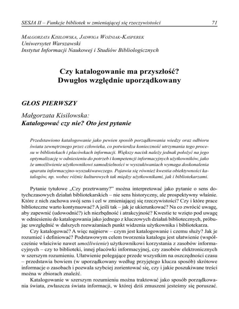 SESJA II – Funkcje bibliotek w zmieniającej się rzeczywistości 71 Małgorzata Kisilowska, Jadwiga Woźniak-Kasperek Uniwersytet Warszawski Instytut Informacji Naukowej i Studiów Bibliologicznych Czy katalogowanie ma przyszłość? Dwugłos względnie uporządkowany GŁOS PIERWSZY Małgorzata Kisilowska: Katalogować czy nie? Oto jest pytanie Przedstawiono katalogowanie jako pewien sposób porządkowania wiedzy oraz odbioru świata zewnętrznego przez człowieka, co potwierdza konieczność utrzymania tego procesu w bibliotekach i placówkach informacji. Większy nacisk należy jednak położyć na jego optymalizację w odniesieniu do potrzeb i kompetencji informacyjnych użytkowników, jako że umożliwienie użytkownikowi samodzielności w wyszukiwaniach wymaga doskonalenia aparatu informacyjno-wyszukiwawczego. Pojawia się również kwestia obiektywności katalogów, np. wobec różnic kulturowych tak między użytkownikami, jak i bibliotekarzami. Pytanie tytułowe „Czy przetrwamy?” można interpretować jako pytanie o sens dotychczasowych działań bibliotekarskich – nie sens historyczny, ale prospektywny właśnie. Które z nich zachowa swój sens i cel w zmieniającej się rzeczywistości? Czy i które prace biblioteczne warto kontynuować? A jeśli tak – jak je ukierunkować? Na co zwrócić uwagę, aby zapewnić (udowodnić?) ich niezbędność i atrakcyjność? Kwestie te wzięto pod uwagę w odniesieniu do katalogowania jako jednego z kluczowych działań bibliotecznych, próbując uwzględnić w dalszych rozważaniach punkt widzenia użytkownika i bibliotekarza. Czy katalogować? A więc najpierw – czym jest katalogowanie i czemu służy? Jak je rozumieć i definiować? Podstawowym celem tworzenia katalogu jest ułatwienie (współcześnie właściwie nawet umożliwienie) użytkownikowi korzystania z zasobów informacyjnych – czy to biblioteki, innej placówki informacyjnej, czy zasobów elektronicznych w szerszym rozumieniu. Ułatwienie polegające przede wszystkim na oszczędności czasu – przedstawia bowiem (w uporządkowany według przyjętego klucza sposób) skrótowe informacje o zasobach i pozwala szybciej zorientować się, czy i jakie poszukiwane treści można w zbiorach znaleźć. Katalogowanie w szerszym rozumieniu można traktować jako sposób porządkowania świata, zwłaszcza świata informacji, w której dziś zmuszeni jesteśmy się poruszać. 72 Biblioteki XXI wieku. Czy przetrwamy? Takie uporządkowane zbiory informacji znajdujemy przecież nie tylko w środowisku elektronicznym. Różnorodne oferty produkcyjne, handlowe, usługowe czy rozrywkowe są porządkowane tak, aby adresatom – potencjalnym nabywcom – ułatwić wybór i zachęcić do skorzystania. Przykładem takich działań mogą być chociażby tablice informacyjne w domach handlowych, które zawierają listę dostępnych sklepów, mapę ich rozmieszczenia w budynku, a także rodzaje dostępnych asortymentów i usług – najczęściej poprzez oznaczenie ich odpowiednimi kolorami. W supermarketach znaleźć można oznaczenia miejsc dla poszczególnych grup towarów, co pozwala zorientować się w położeniu poszukiwanego makaronu czy nabiału. W tym przypadku jednak za wyjątek nie służący dobru nabywcy, a korzyści oferenta, uznać należy okresowe zmiany ustawienia towarów na półkach tak, aby zmusić klientów do dłuższych poszukiwań i zakupienia „po drodze” towarów, których wcześniej nie umieścili na swojej „liście zakupów”. Dostępne są katalogi aukcyjne, wydawnicze, katalogi firm wysyłkowych i tych rozprowadzających swoje produkty w sprzedaży bezpośredniej. Poziom głębszego wtajemniczenia reprezentują ci, którzy potrafią budować katalogi w sposób „wciągający”, angażujący użytkownika, zachęcający go do zajrzenia dalej, w głąb, co jeszcze kryje się na kolejnych kartach, stronach, za zakrętem. Wykorzystywane są do tego różne narzędzia, odpowiednio do okoliczności. Znów – w sklepie powszechnie znanym takim bodźcem jest zapach świeżego pieczywa, sprzedawanego jednak w najodleglejszej części hali sprzedażowej tak, aby klient musiał przejść obok wielu różnych innych produktów, zanim dotrze do „wymarzonej” bułeczki. W katalogach portali internetowych stosowane są podchwytliwe nazwy i tytuły, sugerujące często treści bardziej pociągające, niż rzeczywista informacja. Oznaczenia kolorystyczne przyciągają wzrok i zwracają uwagę na „możliwości”, z których grzechem byłoby nie skorzystać. Można powiedzieć, że cały nasz świat został „skatalogowany” na mapach, aby umożliwić nam przemieszczanie się, orientację w przestrzeni, znajdowanie poszukiwanych miejsc właśnie za pośrednictwem mapy, czyli swoistego aparatu informacyjno-wyszukiwawczego. Podobną funkcję pełnią również przewodniki turystyczne, pokazując, co warto w danym regionie zobaczyć. Trzeba przy tym pamiętać o odmiennościach kultur regionalnych, narodowych czy religijnych, które powodują, że te swoiste narzędzia informacyjno-wyszukiwawcze na inne elementy kładą nacisk i w związku z tym mogą różnić się między sobą, w zależności od uwarunkowań kulturowych autora i adresata. Katalogowanie jako sposób porządkowania świata jest więc jedną z cech nieodłącznych współczesnej kultury. Przy tak rozwiniętej ofercie informacyjnej człowiek nie jest w stanie przeszukiwać zasoby wiedzy bez jakiegokolwiek przewodnika, sugerującego wartość poszczególnych dostępnych obiektów. Przy czym nie chodzi tu o wartość obiektywną, którą dość rzadko można ustalić. Raczej o opisanie obiektu tyloma jego cechami, które ułatwią użytkownikowi stwierdzenie, czy dla jego konkretnych potrzeb (informacyjnych) dany obiekt wartość – subiektywną – w danym momencie posiada, czy też nie. Taka sytuacja zdaje się przesądzać, że odpowiedź na pytanie ogólne „Czy katalogować?” powinna by