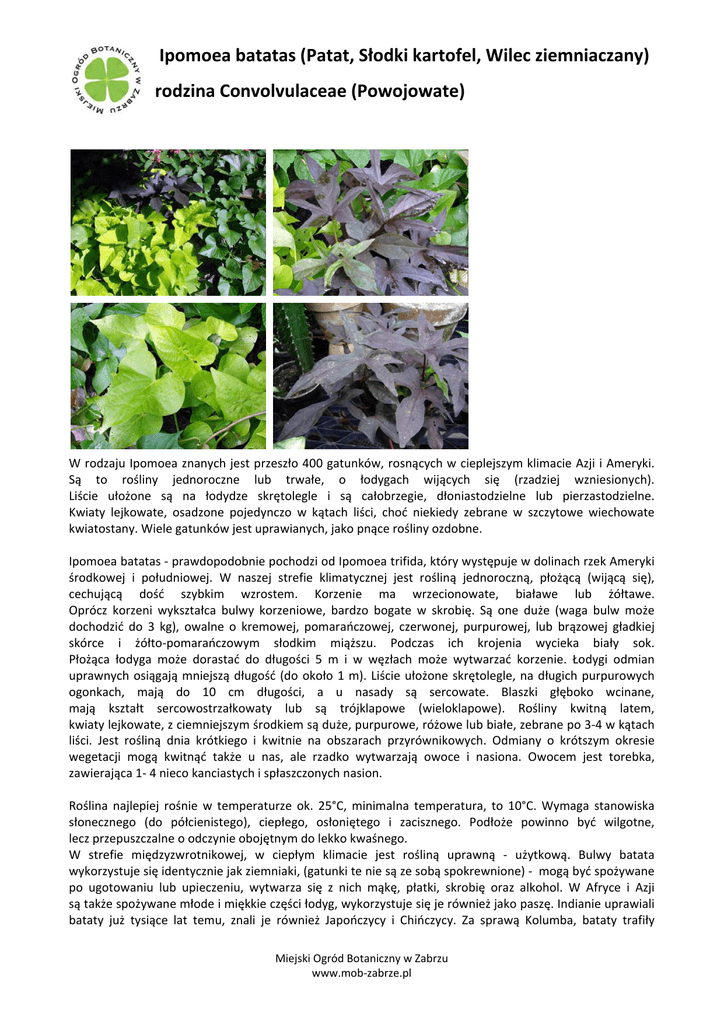 Ipomoea batatas (Patat, Słodki kartofel, Wilec ziemniaczany) rodzina Convolvulaceae (Powojowate) W rodzaju Ipomoea znanych jest przeszło 400 gatunków, rosnących w cieplejszym klimacie Azji i Ameryki. Są to rośliny jednoroczne lub trwałe, o łodygach wijących się (rzadziej wzniesionych). Liście ułożone są na łodydze skrętolegle i są całobrzegie, dłoniastodzielne lub pierzastodzielne. Kwiaty lejkowate, osadzone pojedynczo w kątach liści, choć niekiedy zebrane w szczytowe wiechowate kwiatostany. Wiele gatunków jest uprawianych, jako pnące rośliny ozdobne. Ipomoea batatas ‐ prawdopodobnie pochodzi od Ipomoea trifida, który występuje w dolinach rzek Ameryki środkowej i południowej. W naszej strefie klimatycznej jest rośliną jednoroczną, płożącą (wijącą się), cechującą dość szybkim wzrostem. Korzenie ma wrzecionowate, białawe lub żółtawe. Oprócz korzeni wykształca bulwy korzeniowe, bardzo bogate w skrobię. Są one duże (waga bulw może dochodzić do 3 kg), owalne o kremowej, pomarańczowej, czerwonej, purpurowej, lub brązowej gładkiej skórce i żółto‐pomarańczowym słodkim miąższu. Podczas ich krojenia wycieka biały sok. Płożąca łodyga może dorastać do długości 5 m i w węzłach może wytwarzać korzenie. Łodygi odmian uprawnych osiągają mniejszą długość (do około 1 m). Liście ułożone skrętolegle, na długich purpurowych ogonkach, mają do 10 cm długości, a u nasady są sercowate. Blaszki głęboko wcinane, mają kształt sercowostrzałkowaty lub są trójklapowe (wieloklapowe). Rośliny kwitną latem, kwiaty lejkowate, z ciemniejszym środkiem są duże, purpurowe, różowe lub białe, zebrane po 3‐4 w kątach liści. Jest rośliną dnia krótkiego i kwitnie na obszarach przyrównikowych. Odmiany o krótszym okresie wegetacji mogą kwitnąć także u nas, ale rzadko wytwarzają owoce i nasiona. Owocem jest torebka, zawierająca 1‐ 4 nieco kanciastych i spłaszczonych nasion. Roślina najlepiej rośnie w temperaturze ok. 25°C, minimalna temperatura, to 10°C. Wymaga stanowiska słonecznego (do półcienistego), ciepłego, osłoniętego i zacisznego. Podłoże powinno być wilgotne, lecz przepuszczalne o odczynie obojętnym do lekko kwaśnego. W strefie międzyzwrotnikowej, w ciepłym klimacie jest rośliną uprawną ‐ użytkową. Bulwy batata wykorzystuje się identycznie jak ziemniaki, (gatunki te nie są ze sobą spokrewnione) ‐ mogą być spożywane po ugotowaniu lub upieczeniu, wytwarza się z nich mąkę, płatki, skrobię oraz alkohol. W Afryce i Azji są także spożywane młode i miękkie części łodyg, wykorzystuje się je również jako paszę. Indianie uprawiali bataty już tysiące lat temu, znali je również Japończycy i Chińczycy. Za sprawą Kolumba, bataty trafiły Miejski Ogród Botaniczny w Zabrzu www.mob‐zabrze.pl Ipomoea batatas (Patat, Słodki kartofel, Wilec ziemniaczany) rodzina Convolvulaceae (Powojowate) do Europy. Roślinę uprawia się także jako roślinę ozdobną i można ją zastosować do osłaniania ogrodzeń i balkonów ‐ szczególnie odmiany o ciekawie wybarwionych i powcinanych liściach. Rozmnaża się je przez wysiew nasion, przez podział bulw oraz sadzonki wierzchołkowe. Miejski Ogród Botaniczny w Zabrzu www.mob‐zabrze.pl