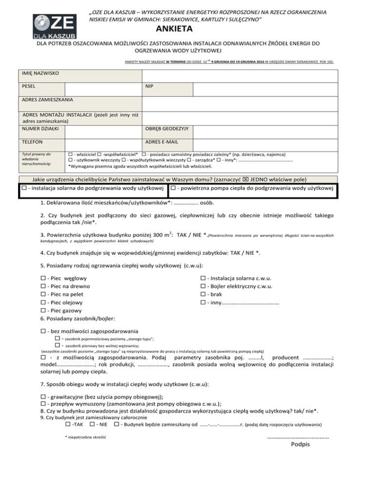 „OZE DLA KASZUB – WYKORZYSTANIE ENERGETYKI ROZPROSZONEJ NA RZECZ OGRANICZENIA NISKIEJ EMISJI W GMINACH: SIERAKOWICE, KARTUZY I SULĘCZYNO” ANKIETA DLA POTRZEB OSZACOWANIA MOŻLIWOŚCI ZASTOSOWANIA INSTALACJI ODNAWIALNYCH ŹRÓDEŁ ENERGII DO OGRZEWANIA WODY UŻYTKOWEJ ANKIETY NALEŻY SKŁADAĆ W TERMINIE OD GODZ. 12 00 9 GRUDNIA DO 19 GRUDNIA 2016 W URZĘDZIE GMINY SIERAKOWICE POK 102. IMIĘ NAZWISKO PESEL NIP ADRES ZAMIESZKANIA ADRES MONTAŻU INSTALACJI (jeżeli jest inny niż adres zamieszkania) NUMER DZIAŁKI OBRĘB GEODEZYJY TELEFON ADRES E-MAIL Tytuł prawny do władania nieruchomością: - właściciel -współwłaściciel* - posiadacz samoistny posiadacz zależny* (np. dzierżawca, najemca) - użytkownik wieczysty - współużytkownik wieczysty - zarządca* - inny*: ……………………………………….. *Wymagana pisemna zgoda wszystkich współwłaścicieli lub właścicieli. Jakie urządzenia chcielibyście Państwo zainstalować w Waszym domu? (zaznaczyć JEDNO właściwe pole) - instalacja solarna do podgrzewania wody użytkowej - powietrzna pompa ciepła do podgrzewania wody użytkowej 1. Deklarowana ilość mieszkańców/użytkowników*: …………….. osób. 2. Czy budynek jest podłączony do sieci gazowej, ciepłowniczej lub czy obecnie istnieje możliwość takiego podłączenia tak /nie*. 2 3. Powierzchnia użytkowa budynku poniżej 300 m : TAK / NIE *.(Powierzchnia mierzona po wewnętrznej długości ścian na wszystkich kondygnacjach, z wyjątkiem powierzchni klatek schodowych) 4. Czy budynek znajduje się w wojewódzkiej/gminnej ewidencji zabytków: TAK / NIE *. 5. Posiadany rodzaj ogrzewania ciepłej wody użytkowej (c.w.u): - Piec węglowy - Piec na drewno - Piec na pelet - Piec olejowy - Piec gazowy 6. Posiadany zasobnik/bojler: - Instalacja solarna c.w.u. - Bojler elektryczny c.w.u. - brak - inny…………………………………. - bez możliwości zagospodarowania - zasobnik pojemnościowy poziomy „starego typu”; - zasobnik pionowy bez wolnej wężownicy; (wszystkie zasobniki poziome „starego typu” są nieprzystosowane do pracy z instalacją solarną lub powietrzną pompą ciepłą) - z możliwością zagospodarowania. Podaj parametry zasobnika poj. ………l, producent ………………..; model……………………..; rok produkcji, …………………, zasobnik posiada wolną wężownicę do podłączenia instalacji solarnej lub pompy ciepła. 7. Sposób obiegu wody w instalacji ciepłej wody użytkowe (c.w.u): - grawitacyjne (bez użycia pompy obiegowej); - przepływ wymuszony (zamontowana jest pompy obiegowa c.w.u.); 8. Czy w budynku prowadzona jest działalność gospodarcza wykorzystująca ciepłą wodę użytkową? tak/ nie*. 9. Czy budynek jest zamieszkiwany całorocznie -TAK - NIE - Budynek będzie zamieszkany od ……-……-…………….r. (podaj datę rozpoczęcia użytkowania) * niepotrzebne skreślić ………………………………… Podpis „OZE DLA KASZUB – WYKORZYSTANIE ENERGETYKI ROZPROSZONEJ NA RZECZ OGRANICZENIA NISKIEJ EMISJI W GMINACH: SIERAKOWICE, KARTUZY I SULĘCZYNO” INSTALACJA SOLARNA DO PODGRZEWANIA WODY UŻYTKOWEJ (UWAGA! WYPEŁNIĆ TYLKO JEŻELI WYBRANO INSTALACJĘ SOLARNĄ DO PODGRZEWANIA WODY UŻYTKOWEJ) 1. Sugerowana lokalizacja kolektorów -Dach skośny (około 45°) -Dach skośny (20°÷35°) -Dach płaski (0°÷20°) -Elewacja budynku -Balkon/Taras* -Budynek sąsiedni (W przypadku gdy żaden z zaproponowanych schematów nie pasuje do Państwa sytuacji prosimy o naniesienie uwag i odręczne skorygowanie jednego ze schematów lub zrobienie dodatkowego rysunku, który obrazowałby Państwa sytuację) 2. Orientacja miejsca gdzie maja być zamontowane kolektory względem stron świata: -południowa (kierunek optymalny); -południowo- wschodnia; -południowo- zachodnia. 3. Przybliżona powierzchnia połaci dachowej na której mogą być montowane kolektory: ………m2 ; 4. Istniejące kondygnacje (zaznacz posiadane kondygnacje np. piwnica, parter, 1 piętro i poddasze ) piwnica parter 1 piętro 2 piętro 3 piętro 4 piętro poddasze użytkowe 5. Sugerowana trasa rurociągów instalacji solarnej: - wewnątrz budynku ; - na zewnątrz po elewacji ; - wolnym kanałem wentylacyjnym; - istnieje instalacja glikolowa ; - inna - jaka: :............... „OZE DLA KASZUB – WYKORZYSTANIE ENERGETYKI ROZPROSZONEJ NA RZECZ OGRANICZENIA NISKIEJ EMISJI W GMINACH: SIERAKOWICE, KARTUZY I SULĘCZYNO” 6. Sugerowana lokalizacja zasobnika solarnego : -pomieszczenie kotłowni w budynku; - w innym budynku – w odległości ………m od planowanej instalacji, w odległości ……m od pieca. Konieczna jest budowa …………. m ciepłociągu. Rodzaj utwardzenia podłoża, - trawa, -kostka, - beton, -inne………………………………………………. - inne pomieszczenie w piwnicy - w odległości ………m od pieca; - inne …………………………………………… Przy doborze lokalizacji należy uwzględnić: wagę zasobnika z wodą : ok 500 kg, wymiary zasobnika: wysokosć ok 200 cm, średnica ok 70 cm. Temperaturę pomieszczenia - minimum +6°C. 7. Proszę podać odległość od pieca do miejsca posadowienia kolektorów (z dokładnością do 1 m). Uwzględnić należy planowany przebieg przewodów wewnątrz budynku lub na zewnątrz budynku. Odległość od pieca do kolektorów wyniesie ……………………metrów. (W przypadku gdy instalacja obiegu glikolu jest już częściowo wykonana, należy podać jedynie brakującą odległość) 8. Występujący rodzaj pokrycia dachowego: -Blachodachówka; -Dachówka; -Eternit; (Uwaga! W przypadku -Papa; pokrycia dachu -inne ……………………………………………..; eternitem nie ma możliwości instalacji urządzeń na dachu) 9. Proszę podać materiał z jakiego wykonana jest instalacja ciepłej i zimnej wody użytkowej w miejscu potencjalnego podłączenia instalacji solarnej Zimna woda: rury ze stali, miedzi, z 