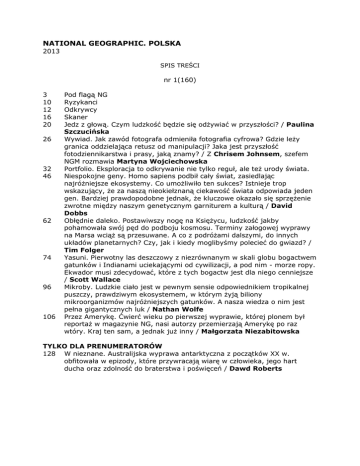 NATIONAL GEOGRAPHIC. POLSKA 2013 SPIS TREŚCI nr 1(160) 3 10 12 16 20 26 32 46 62 74 96 106 Pod flagą NG Ryzykanci Odkrywcy Skaner Jedz z głową. Czym ludzkość będzie się odżywiać w przyszłości? / Paulina Szczucińska Wywiad. Jak zawód fotografa odmieniła fotografia cyfrowa? Gdzie leży granica oddzielająca retusz od manipulacji? Jaka jest przyszłość fotodziennikarstwa i prasy, jaką znamy? / Z Chrisem Johnsem, szefem NGM rozmawia Martyna Wojciechowska Portfolio. Eksploracja to odkrywanie nie tylko reguł, ale też urody świata. Niespokojne geny. Homo sapiens podbił cały świat, zasiedlając najróżniejsze ekosystemy. Co umożliwiło ten sukces? Istnieje trop wskazujący, że za naszą nieokiełznaną ciekawość świata odpowiada jeden gen. Bardziej prawdopodobne jednak, że kluczowe okazało się sprzężenie zwrotne między naszym genetycznym garniturem a kulturą / David Dobbs Obłędnie daleko. Postawiwszy nogę na Księżycu, ludzkość jakby pohamowała swój pęd do podboju kosmosu. Terminy załogowej wyprawy na Marsa wciąż są przesuwane. A co z podróżami dalszymi, do innych układów planetarnych? Czy, jak i kiedy moglibyśmy polecieć do gwiazd? / Tim Folger Yasuni. Pierwotny las deszczowy z niezrównanym w skali globu bogactwem gatunków i Indianami uciekającymi od cywilizacji, a pod nim - morze ropy. Ekwador musi zdecydować, które z tych bogactw jest dla niego cenniejsze / Scott Wallace Mikroby. Ludzkie ciało jest w pewnym sensie odpowiednikiem tropikalnej puszczy, prawdziwym ekosystemem, w którym żyją biliony mikroorganizmów najróżniejszych gatunków. A nasza wiedza o nim jest pełna gigantycznych luk / Nathan Wolfe Przez Amerykę. Ćwierć wieku po pierwszej wyprawie, której plonem był reportaż w magazynie NG, nasi autorzy przemierzają Amerykę po raz wtóry. Kraj ten sam, a jednak już inny / Małgorzata Niezabitowska TYLKO DLA PRENUMERATORÓW 128 W nieznane. Australijska wyprawa antarktyczna z początków XX w. obfitowała w epizody, które przywracają wiarę w człowieka, jego hart ducha oraz zdolność do braterstwa i poświęceń / Dawd Roberts nr 2(161) 3 10 12 16 20 26 34 44 50 70 88 100 120 Pod flagą NG Ryzykanci Odkrywcy Skaner Jedz z głową. Jak zachować świeżość żywności? Sposoby stare i nowe, naturalne i naukowe / Adam Robiński Fotoreportaż. Pokaż łapę, czyli projektowe wariacje natury na temat stopy / Ingo Arndt Pigmeje. Żyją nie tylko w Afryce i nie tylko w tropikalnym lesie. Mają nieprawdopodobny zmysł orientacji. Ale dlaczego są tacy mali? Czy to przypadek, czy przystosowanie do środowiska? / Andrzej Muszyński Sekrety wzrostu. Ludzki wzrost to skomplikowana sprawa. Wbrew pozorom wcale nie jest tak, że wraz z postępami cywilizacji jesteśmy coraz wyżsi. Weźmy taki paleolit. Wtedy to dopiero rośliśmy / Adam Robiński Libia. Kilka dekad rządów szalonego dyktatora nie mogło pozostać bez wpływu na społeczną i gospodarczą tkankę kraju. Dodajmy do tego skutki wojny domowej, a powstanie obraz państwa zdezorientowanego / Robert Draper Jad. Wiele zwierząt na świecie dysponuje śmiercionośną "bronią biologiczną" - jadami. Podglądając ich działanie, medycyna potrafi sprawić, by w zmodyfikowanej formie posłużyły nam jako leki / Jennifer S. Holland Sekwoje. Mamutowce olbrzymie to drzewa o największej na świecie miąższości. Potrafią żyć kilka tysięcy lat. Czy to nie wystarczające powody, by bliżej im się przyjrzeć? / David Quammen Dziki korytarz. Kirgizi z Korytarza Wachańskiego nie uciekali przed cywilizacją - ona po prostu nigdy do nich nie dotarła. I choć mieszkają w urzekającej krainie, życie bez dróg, prądu i medycyny pełne jest śmierci / Michael Finkel Savoir-vivre. Towarzyskie formy nie są zbędnym balastem, reliktem dawnego społeczeństwa. One czynią życie milszym / Maciej Nikodemski TYLKO DLA PRENUMERATORÓW 128 Wściekła pogoda. Na temat zmian klimatu napisano już tysiące tomów. Mimo to wciąż wielu rzeczy nie jesteśmy w stanie przewidzieć. Pewne jest więc: pogoda jeszcze nie raz nas zaskoczy / David Roberts nr 3(162) 3 10 12 16 26 38 46 58 64 84 94 110 118 Pod flagą NG Ryzykanci Odkrywcy Skaner Jedz z głową. Kariera hamburgera okazuje się mieć zaskakujący związek z rozwojem motoryzacji / Adam Robiński Fotoreportaż. Pierwotne ludy i ich sposoby życia powoli odchodzą w przeszłość. W Indonezji można jednak jeszcze podpatrzyć np. Mentawajów / Paweł Łączny Teatr boży. Bezkresna Syberia jest doskonałym miejscem, by na odludziu budować alternatywne społeczeństwo. Po upadku ZSRR wielu mesjaszów powiodło tam swoich wyznawców / Maciej Nikodemski Władcy umysłów. Głęboka ludzka potrzeba duchowości sprawia, że aby zostać guru i zgromadzić grupę wyznawców, nie trzeba mieć nadzwyczajnej charyzmy. Wystarczy determinacja / Maciej Nikodemski Ropa z łupków. Nowe metody wydobycia ropy gwałtownie zwiększyły jej produkcję w USA. Ale ofiarą tego boomu pada środowisko - przyrodnicze i społeczne / Edwin Dobb Piłka z odpadków. Afrykańscy chłopcy często grają prymitywnymi piłkami, które sami wytwarzają z będących pod ręką materiałów. Ale ich radość i emocje wcale nie są przez to mniejsze / Jessica Hilltout Czas dronów. Już niedługo niebo nad naszymi głowami zaroi się od niewielkich latających maszyn. Oprócz nowych możliwości działania przyniosą nam też zagrożenia, np. permanentną inwigilację / Jon Horgan Puszczyk uralski. Pewna sowa - dzika i mało towarzyska, jak na sowę przystało - zauroczyła fotografa i niespodziewanie została puszczańską ptasią modelką na trzy lata / Amanda Figle Włosy. Człowiek jako jedyny ssak pozbawiony jest futra. Być może właśnie ten brak uczynił nas ludźmi, bo pozwolił mówić / Izabela Filc-Redlińska TYLKO DLA PRENUMERATORÓW 128 Chiny. We współczesnych Chinach 10 lat to cała epoka. Zwłaszcza nad Zaporą Trzech Przełomów - inwestycj