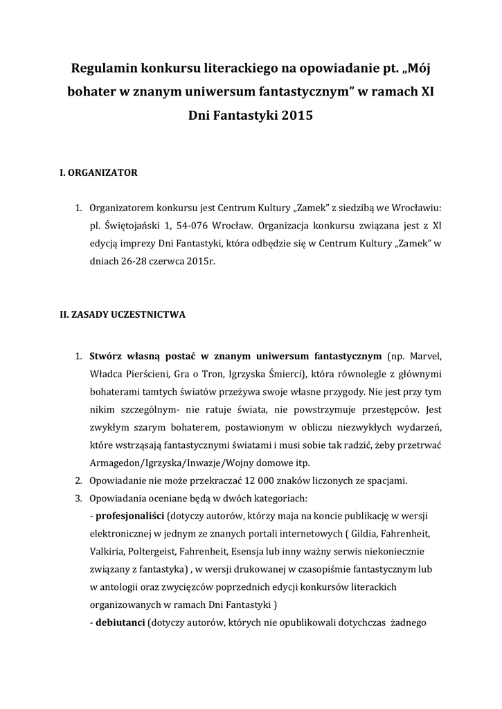 Regulamin konkursu literackiego na opowiadanie pt. „Mój bohater w znanym uniwersum fantastycznym” w ramach XI Dni Fantastyki 2015 I. ORGANIZATOR 1. Organizatorem konkursu jest Centrum Kultury „Zamek” z siedzibą we Wrocławiu: pl. Świętojański 1, 54-076 Wrocław. Organizacja konkursu związana jest z XI edycją imprezy Dni Fantastyki, która odbędzie się w Centrum Kultury „Zamek” w dniach 26-28 czerwca 2015r. II. ZASADY UCZESTNICTWA 1. Stwórz własną postać w znanym uniwersum fantastycznym (np. Marvel, Władca Pierścieni, Gra o Tron, Igrzyska Śmierci), która równolegle z głównymi bohaterami tamtych światów przeżywa swoje własne przygody. Nie jest przy tym nikim szczególnym- nie ratuje świata, nie powstrzymuje przestępców. Jest zwykłym szarym bohaterem, postawionym w obliczu niezwykłych wydarzeń, które wstrząsają fantastycznymi światami i musi sobie tak radzić, żeby przetrwać Armagedon/Igrzyska/Inwazje/Wojny domowe itp. 2. Opowiadanie nie może przekraczać 12 000 znaków liczonych ze spacjami. 3. Opowiadania oceniane będą w dwóch kategoriach: - profesjonaliści (dotyczy autorów, którzy maja na koncie publikację w wersji elektronicznej w jednym ze znanych portali internetowych ( Gildia, Fahrenheit, Valkiria, Poltergeist, Fahrenheit, Esensja lub inny ważny serwis niekoniecznie związany z fantastyka) , w wersji drukowanej w czasopiśmie fantastycznym lub w antologii oraz zwycięzców poprzednich edycji konkursów literackich organizowanych w ramach Dni Fantastyki ) - debiutanci (dotyczy autorów, których nie opublikowali dotychczas żadnego tekstu w wyżej wymienionych miejscach, zarówno w formie elektronicznej, jak i drukowanej) 4. Podstawowymi kryteriami oceny będą przede wszystkim: pomysłowość, wysoki poziom merytoryczny oraz zachowanie i znajomość realiów oryginału. 5. Opowiadania oceniane będą przez specjalnie powołane do tego celu jury. 6. W tym roku sędziowania w konkursie podejmą się m.in. pisarze: Aneta Jadowska, Martyna Raduchowska, Marcin Rusnak oraz koordynatorka bloku literackiego Magdalena Pioruńska. 7. Decyzje Jury są ostateczne i niepodważalne. 8. Do udziału w Konkursie nie będą dopuszczone prace: a) wykonane na odpłatne zlecenie b) realizowane przy udziale członków jury c) do których prawa autorskie zostały przekazane osobom trzecim. III. PRAWA AUTORSKIE 1. Zgłaszając opowiadanie, twórcy oświadczają, że przysługuje im autorskie prawo majątkowe i osobiste do nadesłanego utworu 2. Twórcy zgadzają się na publikowanie opowiadań przez organizatorów Konkursu na wszelkich polach eksploatacji. 3. Twórcy oświadczają, że nie będą rościć praw do wynagrodzenia z tytułu wykorzystania nadesłanych przez nich opowiadań na wszelkich polach eksploatacji. IV. ZGŁOSZENIA 1. Prace konkursowe należy nadsyłać na adres mailowy: [email protected] - wyłącznie jako załącznik w formacie .rtf w temacie proszę wpisać kategorię oraz słowo „konkurs”. -sugerujemy wysłanie e-maili ze zgłoszeniem do konkursu z opcja "potwierdzenie odbioru". 2. W treści maila należy podać dokładne dane osobowe oraz telefon kontaktowy. 3. Wysyłając pracę należy zarazem zaznaczyć w jakiej kategorii ma być oceniana. 4. Jedna osoba może nadesłać na konkurs jedno opowiadanie 5. Prace nie spełniające powyższych wymagań nie będą brane pod uwagę. 6. Ostateczny termin zgłoszeń mija 24 maja (niedziela) 2015 roku. IV. NAGRODY 1. W poszczególnych kategoriach zostaną przyznane następujące nagrody: Profesjonaliści (mający za sobą co najmniej jedną publikację drukowaną lub w Internecie) - I miejsce – nagroda pieniężna w wysokości 500 zł - II miejsce – nagroda rzeczowa - III miejsce – nagroda rzeczowa Debiutanci - I miejsce - nagroda pieniężna w wysokości 300 zł - II miejsce – nagroda rzeczowa - III miejsce – nagroda rzeczowa 2. Opowiadanie nagrodzone w kategorii profesjonaliści zostanie zamieszczone w folderze Dni Fantastyki. 3. W zależności od poziomu i atrakcyjności prac, jury może przyznać wyróżnienia. 4. Organizatorzy zastrzegają sobie prawo innego podziału nagród. 5. Ogłoszenie wyników konkursu nastąpi na stronie internetowej www.dnifantastyki.pl w dniu 8 czerwca. 6. Laureaci zostaną powiadomieni o wyniku konkursu mailowo i telefonicznie poza nagrodami przysługują im darmowe akredytacje na Dni Fantastyki. 7. Wręczenie nagród nastąpi 27 czerwca w trakcie gali Dni Fantastyki (obecność laureatów na gali jest obowiązkowa). Udział w konkursie i przesłanie swoich danych osobowych jest jednocześnie wyrażeniem zgody na ich gromadzenie i przetwarzanie organizatorów w celach statystycznych i konkursowych, z zastrzeżeniem prawa do ich poprawiania i uzupełniania zgodnie z Ustawą o ochronie danych osobowych z dn. 29.08.1997 r.
