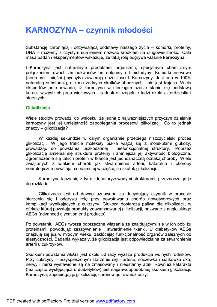 KARNOZYNA – czynnik młodości Substancję chroniącą i odżywiającą podstawy naszego życia – komórki, proteiny, DNA – możemy z czystym sumieniem nazwać środkiem na długowieczność. Cała masa badań i eksperymentów wskazuje, że taką rolę odgrywa właśnie karnozyna. L-Karnozyna jest naturalnym produktem organizmu, specjalnym chemicznym połączeniem dwóch aminokwasów beta-alaniny i L-histadyny. Komórki nerwowe (neurony) i mięśni (myocyty) zawierają duże ilości L-Karnozyny. Jest ona w 100% naturalną substancją, nie ma żadnych skutków ubocznych i nie jest trująca. Wielu ekspertów prze-powiada, iż karnozyna w niedługim czasie stanie się podstawą kuracji wszystkich grup wiekowych – jednak szczególnie ludzi około czterdziestki i starszych. Glikolizacja Wiele studiów prowadzi do wniosku, że jedną z najważniejszych przyczyn działania karnozyny jest jej umiejętność zapobiegania procesowi glikolizacji. Co to jednak znaczy – glikolizacja? W każdej sekundzie w całym organizmie przebiega niszczycielski proces glikolizacji. W jego trakcie molekuły białka wiążą się z molekułami glukozy, prowadząc do powstania uszkodzonej i niefunkcjonalnej struktury. Poprzez glikolizację zmienia się struktura proteiny i zmniejsza jej aktywność biologiczna. Zgromadzenie się takich protein w tkance jest jednoznaczną oznaką choroby. Wiele związanych z wiekiem chorób jak stwardnienie arterii, katarakta i choroby neurologiczne powstają, co najmniej w części, na skutek glikolizacji. Karnozyna łączy się z tymi zdenaturyzowanymi strukturami, przeznaczając je do rozkładu. Glikolizacja jest od dawna uznawana za decydujący czynnik w procesie starzenia się i odgrywa rolę przy powstawaniu chorób nowotworowych oraz komplikacji wynikających z cukrzycy. Glukoza dostarcza paliwa dla glikolizacji, w efekcie której powstają produkty zaawansowanej glikolizacji, nazwane z angielskiego AEGs (advanced glycation end products). Po powstaniu, AEGs tworzą poprzeczne wiązania ze znajdującymi się w ich pobliżu proteinami, powodując zesztywnienie i stwardnienie tkanki. U diabetyków AEGs znajdują się już w młodym wieku, zakłócając funkcjonalność organów zależnych od elastyczności. Badania wykazały, że glikolizacja jest odpowiedzialna za stwardnienie arterii u cukrzyków. Skutkiem powstania AEGs jest około 50 razy wyższa produkcja wolnych rodników. Przy cukrzycy – przyspieszonym starzeniu się - arterie, soczewka i siatkówka oka, nerwy i nerki wystawione są na zmasowany i nieustanny atak. Również katarakta (też często występująca u diabetyków) jest najprawdopodobniej skutkiem glikolizacji. Karnozyna, zapobiegając glikolizacji, chroni więc również oczy. PDF created with pdfFactory Pro trial version www.pdffactory.com Co prawda proces starzenia się przebiega u cukrzyków szybciej, niemniej jednak AEGs powodują u starzenie się nas wszystkich i dlatego pobieranie karnozyny przynosi korzyść każdemu człowiekowi. Karbonylacja Dlaczego starsi ludzie (również i zwierzęta) wyglądają całkiem inaczej niż młodzi? To proces przemian zachodzący w proteinach ciała. Proteiny – białka – są substancjami odpowiedzialnymi za prawidłowe funkcjonowanie każdego żywego organizmu. Dlatego rozpad protein ma takie niszczycielskie skutki dla funkcjonowania organizmu i jego wyglądu zewnętrznego. Nasze ciało składa się w dużej części z białka. Ponieważ nasz system obronny nie jest w stanie skutecznie chronić protein przed utlenianiem i przed innymi atakami, zmieniają się one, a my się starzejemy. Oprócz utleniania i glikolizacji zachodzi w nas jeszcze jeden destruktywny proces – karbonylacja. Jest to – ujmując to w uproszczeniu - łączenie się protein z węglem, na skutek czego powstają niezdolne do normalnego funkcjonowania struktury. Niezliczona ilość różnych naukowych badań wykazuje, że karnozyna jest skuteczna w zwalczaniu wszystkich tych form denaturacji białka. Przywraca ona kontrolę nad normalną cyrkulacją komórek. Jak to się dzieje? Wyobraźmy sobie silnik, którego właściciel zaniedbuje koniecznej zmiany oleju. Gdy tylko kończą się domieszane do oleju środki czyszczące, tworzą się zabrudzenia i na ważnych częściach silnika pojawia się mazisty osad. Ten osad staje się coraz grubszy i coraz bardzie ogranicza funkcjonalność silnika, doprowadzając w końcu do jego zniszczenia. Tak samo jak ten silnik, również nasz organizm potrzebuje wydajnego systemu usuwającego takie „maziste osady”. Gdy się pojawią, mogą szybko zatkać korytarze cyrkulacji komórek. W ten sposób zostaje ograniczona funkcjonalność komórek i – co ważniejsze – uszkodzone komórki otrzymują możliwość szybkiego rozmnażania się. Efektem jest zwiększona niestabilność chromosomów, prowadząca do degeneracji i raka. Innym ważnym skutkiem jest senescencja, stan, w którym ustaje cyrkulacja komórek. Widzimy więc, że karbonylacja protein może mieć fatalne skutki. Karnozyna pomaga chronić białka i – jak przy wymianie oleju w samochodzie – troszczy się w naszym organizmie o odpowienią wymianę w odpowiednim czasie. Odmładzanie W Ameryce, Japonii i krajach skandynawskich zalecana jest już teraz przez specjalistów zajmujących się problematyką starzenia. Nie ma ona żadnych niepożądanych skutków ubocznych ani nie koliduje z żadnymi lekarstwami. Ostatnią fazę życia dzielących się komórek nazywamy senescencją. Karnozyna ma niezwykłe właściwości odmładzania komórek zbliżających się do senescencji, wydłużając w ten sposób ich okres życia. Karnozyna przeciwdziała na wiele sposobów procesowi starzenia się i – chociaż to brzmi wręcz nieprawdopodobnie – jest w stanie odnawiać nasze komórki. Zawsze uważano, że zestarzałych komórek nie można odnowić – aż do czasu odkrycia działania karnozyny. PDF created with pdfFactory Pro trial version 