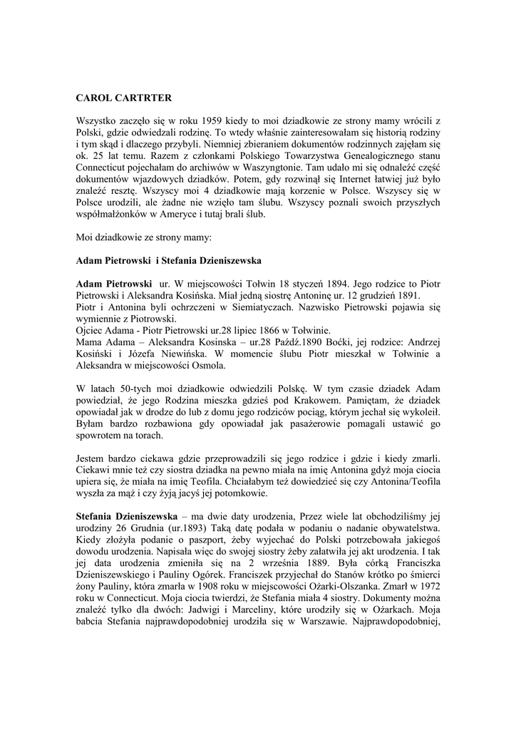 CAROL CARTRTER Wszystko zaczęło się w roku 1959 kiedy to moi dziadkowie ze strony mamy wrócili z Polski, gdzie odwiedzali rodzinę. To wtedy właśnie zainteresowałam się historią rodziny i tym skąd i dlaczego przybyli. Niemniej zbieraniem dokumentów rodzinnych zajęłam się ok. 25 lat temu. Razem z członkami Polskiego Towarzystwa Genealogicznego stanu Connecticut pojechałam do archiwów w Waszyngtonie. Tam udało mi się odnaleźć część dokumentów wjazdowych dziadków. Potem, gdy rozwinął się Internet łatwiej juŜ było znaleźć resztę. Wszyscy moi 4 dziadkowie mają korzenie w Polsce. Wszyscy się w Polsce urodzili, ale Ŝadne nie wzięło tam ślubu. Wszyscy poznali swoich przyszłych współmałŜonków w Ameryce i tutaj brali ślub. Moi dziadkowie ze strony mamy: Adam Pietrowski i Stefania Dzieniszewska Adam Pietrowski ur. W miejscowości Tołwin 18 styczeń 1894. Jego rodzice to Piotr Pietrowski i Aleksandra Kosińska. Miał jedną siostrę Antoninę ur. 12 grudzień 1891. Piotr i Antonina byli ochrzczeni w Siemiatyczach. Nazwisko Pietrowski pojawia się wymiennie z Piotrowski. Ojciec Adama - Piotr Pietrowski ur.28 lipiec 1866 w Tołwinie. Mama Adama – Aleksandra Kosinska – ur.28 Paźdź.1890 Boćki, jej rodzice: Andrzej Kosiński i Józefa Niewińska. W momencie ślubu Piotr mieszkał w Tołwinie a Aleksandra w miejscowości Osmola. W latach 50-tych moi dziadkowie odwiedzili Polskę. W tym czasie dziadek Adam powiedział, Ŝe jego Rodzina mieszka gdzieś pod Krakowem. Pamiętam, Ŝe dziadek opowiadał jak w drodze do lub z domu jego rodziców pociąg, którym jechał się wykoleił. Byłam bardzo rozbawiona gdy opowiadał jak pasaŜerowie pomagali ustawić go spowrotem na torach. Jestem bardzo ciekawa gdzie przeprowadzili się jego rodzice i gdzie i kiedy zmarli. Ciekawi mnie teŜ czy siostra dziadka na pewno miała na imię Antonina gdyŜ moja ciocia upiera się, Ŝe miała na imię Teofila. Chciałabym teŜ dowiedzieć się czy Antonina/Teofila wyszła za mąŜ i czy Ŝyją jacyś jej potomkowie. Stefania Dzieniszewska – ma dwie daty urodzenia, Przez wiele lat obchodziliśmy jej urodziny 26 Grudnia (ur.1893) Taką datę podała w podaniu o nadanie obywatelstwa. Kiedy złoŜyła podanie o paszport, Ŝeby wyjechać do Polski potrzebowała jakiegoś dowodu urodzenia. Napisała więc do swojej siostry Ŝeby załatwiła jej akt urodzenia. I tak jej data urodzenia zmieniła się na 2 września 1889. Była córką Franciszka Dzieniszewskiego i Pauliny Ogórek. Franciszek przyjechał do Stanów krótko po śmierci Ŝony Pauliny, która zmarła w 1908 roku w miejscowości OŜarki-Olszanka. Zmarł w 1972 roku w Connecticut. Moja ciocia twierdzi, Ŝe Stefania miała 4 siostry. Dokumenty moŜna znaleźć tylko dla dwóch: Jadwigi i Marceliny, które urodziły się w OŜarkach. Moja babcia Stefania najprawdopodobniej urodziła się w Warszawie. Najprawdopodobniej, gdyŜ w aktach dotyczących Rutek odnalazłam Stefanię Dzieniszewską, która urodziła się 26 listopada 1893. Wydaje się dziwne i zastanawiające, Ŝe róŜnica między tą data a datą podawaną pierwotnie przez babcie, to dokładnie 1 miesiąc. Ale jej rodzice to Stanisław Dzieniszewski i Michalina. Dziadkowie ze strony ojca: Jan Kaczmarczyk – urodzony we wsi Wydmusy, wyemigrował z Polski w 1904 roku. Jego rodzice to Andrea Kaczmarczyk i Rosalia Samsel. Jan zmarła w 1937. Ślub z Anna Dąbkowską miał miejsce w New Britain w Kościele Sacred Heart. Jan miał 2 braci (Franciszek i Józef), którzy teŜ wyemigrowali do USA Anna Dąbkowska – ojciec Jozef Dabkowski i Anna zd.? Informacja z aktu ślubu) Anna zmarła w 1918 w czasie epidemii grypy w USA. Anna pojechała do Polski do wsi Wołkowe, gdzie urodziła córkę Annę w 1907 roku. W roku 1909 obydwie wróciły do USA. Informacje podane w akcie zgonu Anny (mamy) przez jej męŜa Jana podają, Ŝe jej rodzice to John Dichawchea i Mary Brslak i ze urodziła się we wsi Wołkowe. PoniewaŜ bardzo trudno jest zdobyć jakiekolwiek informacje z parafii Myszyniec moje informacje na temat tych dziadków są tak skromne.