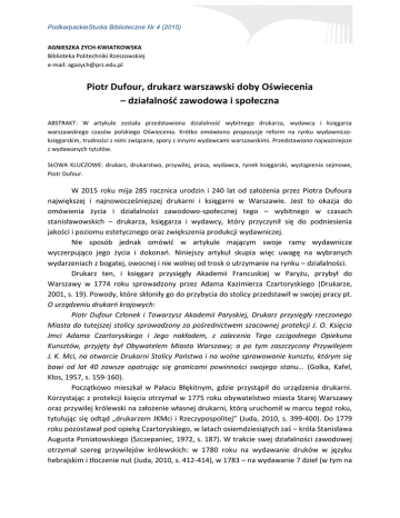 PodkarpackieStudia Biblioteczne Nr 4 (2015) AGNIESZKA ZYCH-KWIATKOWSKA Biblioteka Politechniki Rzeszowskiej e-mail: [email protected] Piotr Dufour, drukarz warszawski doby Oświecenia – działalność zawodowa i społeczna ABSTRAKT: W artykule została przedstawiona działalność wybitnego drukarza, wydawcy i księgarza warszawskiego czasów polskiego Oświecenia. Krótko omówiono propozycje reform na rynku wydawniczoksięgarskim, trudności z nimi związane, spory z innymi wydawcami warszawskimi. Przedstawiono najważniejsze z wydawanych tytułów. SŁOWA KLUCZOWE: drukarz, drukarstwo, przywilej, prasa, wydawca, rynek księgarski, wystąpienia sejmowe, Piotr Dufour. W 2015 roku mija 285 rocznica urodzin i 240 lat od założenia przez Piotra Dufoura największej i najnowocześniejszej drukarni i księgarni w Warszawie. Jest to okazja do omówienia życia i działalności zawodowo-społecznej tego – wybitnego w czasach stanisławowskich – drukarza, księgarza i wydawcy, który przyczynił się do podniesienia jakości i poziomu estetycznego oraz zwiększenia produkcji wydawniczej. Nie sposób jednak omówić w artykule mającym swoje ramy wydawnicze wyczerpująco jego życia i dokonań. Niniejszy artykuł skupia więc uwagę na wybranych wydarzeniach z bogatej, owocnej i nie wolnej od trosk o utrzymanie na rynku – działalności. Drukarz ten, i księgarz przysięgły Akademii Francuskiej w Paryżu, przybył do Warszawy w 1774 roku sprowadzony przez Adama Kazimierza Czartoryskiego (Drukarze, 2001, s. 19). Powody, które skłoniły go do przybycia do stolicy przedstawił w swojej pracy pt. O urządzeniu drukarń krajowych: Piotr Dufour Członek i Towarzysz Akademii Paryskiej, Drukarz przysięgły rzeczonego Miasta do tutejszej stolicy sprowadzony za pośrednictwem szacownej protekcji J. O. Księcia Jmci Adama Czartoryskiego i Jego nakładem, z zalecenia Tego czcigodnego Opiekuna Kunsztów, przyjęty był Obywatelem Miasta Warszawy; a po tym zaszczycony Przywilejem J. K. Mci, na otwarcie Drukarni Stolicy Państwa i na wolne sprawowanie kunsztu, którym się bawi od lat 40 zawsze opatrując się granicami powinności swojego stanu… (Golka, Kafel, Kłos, 1957, s. 159-160). Początkowo mieszkał w Pałacu Błękitnym, gdzie przystąpił do urządzenia drukarni. Korzystając z protekcji księcia otrzymał w 1775 roku obywatelstwo miasta Starej Warszawy oraz przywilej królewski na założenie własnej drukarni, którą uruchomił w marcu tegoż roku, tytułując się odtąd „drukarzem JKMci i Rzeczypospolitej” (Juda, 2010, s. 399-400). Do 1779 roku pozostawał pod opieką Czartoryskiego, w latach osiemdziesiątych zaś – króla Stanisława Augusta Poniatowskiego (Szczepaniec, 1972, s. 187). W trakcie swej działalności zawodowej otrzymał szereg przywilejów królewskich: w 1780 roku na wydawanie druków w języku hebrajskim i tłoczenie nut (Juda, 2010, s. 412-414), w 1783 – na wydawanie 7 dzieł (w tym na PodkarpackieStudia Biblioteczne Nr 4 (2015) druk Powieści moralnych Jeana Françoisa Marmontela) i 2 czasopism (Juda, 2010, s. 423424), a w 1784 roku otrzymał tytuł konsyliarza nadwornego J. K. Mci (Drukarze, 2001, s. 20). Pierwszy z tych przywilejów musiał odstąpić Janowi Antoniemu Krügerowi, który stworzył w Nowym Dworze silny ośrodek literatury dla ludności żydowskiej. Dufour nie pozbył się przezornie czcionek hebrajskich, w które wyposażył swoją oficynę i wykorzystał je w 1792 roku, publikując tekst pt. Hymn przy obchodzie uroczystości dnia 3 maja 1792 r. Wydrukował go w dwu edycjach. Pierwsza w formacie in plano obejmowała 6 kart pełnoarkuszowych z ułożonymi równolegle czterema wersjami językowymi (w hebrajskim oraz przekładach na języki: polski, niemiecki i francuski). Druga – formatu in quarto, liczyła trzy i pół arkusza tych samych wersji językowych utworu (Drukarze, 2001, s. 33-34). W 1785 roku Dufour spostrzegł, że wydawanie czcionką cyrylicką ksiąg dla starowierców rosyjskich może stać się dla niego między innymi szansą na zwiększenie dochodów. Kupiec rosyjski Michaił Grigoriewicz Sołowiew miał sfinansować całe przedsięwzięcie i kolportować książki do Rosji (Drukarze, 2001, s. 32). Współpracując z Sołowiewem Dufour zatrudnił w 1784 roku Antoniego Czarniawskiego z drukarni w Supraślu, zakupił czcionki cyrylickie, a w 1786 roku uzyskał przywilej Stanisława Augusta na druk ksiąg w języku ruskim, z prawem wyłączności na terenie Warszawy (Juda, 2010, s. 432433). Pierwsze druki wyszły spod pras Dufoura jeszcze przed wystawieniem przywileju tzn. w 1785 roku. Cykl wydawniczy owych ksiąg przerwano latem 1788 roku, kiedy to Antoni Czarniawski objął kierownictwo w Drukarni Wolnej Jana Potockiego (Szczepaniec, 1995, s. 25-26). W 1787 roku Dufour nabył od Jana Augusta Posera przywilej z 1.IX.1769 r. na wydawanie Belizariusza Marmontela (Juda, 2010, s. 385-386). Piotr Dufour wiódł głośny spór ze wspomnianym drukarzem o wydawanie Powieści moralnych Marmontela. Początek tego konfliktu miał miejsce w 1770 roku. Otóż w tym właśnie roku Poser otrzymał przywilej króla na wydawanie powiastek Marmontela. W pięć lat później Adam Kazimierz Czartoryski powierzył druk przekładu tego samego dzieła Dufourowi, co spotkało się ze sprzeciwem i protestem Posera. Spór nie był łatwy do rozstrzygnięcia, jednak argumenty wydawcy, że Poser nie zrealizował zobowiązań i że chodzi o różniące się między sobą wersje przekładu, okazały się przekonujące. Dlatego sprawa ucichła bez poważniejszych konsekwencji (Szczepaniec, 1966, s. 127). Przy okazji wzmiankowanego wydarzenia warto wspomnieć o innym jeszcze, znamiennym dla życia wydawniczego i literackiego epoki Oświecenia – aresztowaniu Dufoura i przetrzymywaniu go przez dwa tygodnie w wieży marszałkowskiej, z powodu wydrukowania memoriału Tomasza Kajetana Węgierskiego do Rady Nieustającej przeciw Wilczewskim (Szyndler, 199