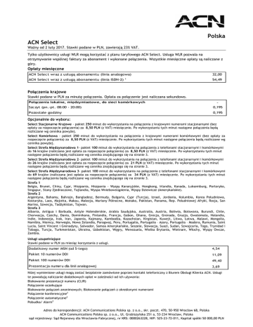 Polska ACN Select Ważny od 2 luty 2017. Stawki podane w PLN, zawierają 23% VAT. Tylko użytkownicy usługi WLR mogą korzystać z planu taryfowego ACN Select. Usługa WLR pozwala na otrzymywanie wspólnej faktury za abonament i wykonane połączenia. Wszystkie miesięczne opłaty są naliczane z góry. Opłaty miesięczne ACN Select wraz z usługą abonamentu (linia analogowa) 32,00 ACN Select wraz z usługą abonamentu (linia ISDN-2) ¹ 54,49 Połączenia krajowe Stawki podane w PLN za minutę połączenia. Opłata za połączenie jest naliczana sekundowo. Połączenia lokalne, międzymiastowe, do sieci komórkowych - Szczyt (pn.-pt. 08:00 - 20:00) 0,195 Pozostałe godziny 0,195 Opcjonalnie do wyboru: Select Stacjonarne Krajowe - pakiet 250 minut do wykorzystania na połączenia z krajowymi numerami stacjonarnymi (bez opłaty za rozpoczęcie połączenia) za 8,50 PLN (z VAT) miesięcznie. Po wykorzystaniu tych minut następne połączenia będą rozliczane wg cennika powyżej. Select Komórkowa - pakiet 250 minut do wykorzystania na połączenia z krajowymi numerami komórkowymi (bez opłaty za rozpoczęcie połączenia) za 8,50 PLN (z VAT) miesięcznie. Po wykorzystaniu tych minut następne połączenia będą rozliczane wg cennika powyżej. Select Strefa Międzynarodowa 1- pakiet 100 minut do wykorzystania na połączenia z telefonami stacjonarnymi i komórkowymi do 16 krajów (naliczana jest opłata za rozpoczęcie połączenia) za 8,50 PLN (z VAT) miesięcznie. Po wykorzystaniu tych minut następne połączenia będą rozliczane wg cennika znajdującego się na stronie 3. Select Strefa Międzynarodowa 2- pakiet 100 minut do wykorzystania na połączenia z telefonami stacjonarnymi i komórkowymi do 26 krajów (naliczana jest opłata za rozpoczęcie połączenia) za 21 PLN (z VAT) miesięcznie. Po wykorzystaniu tych minut następne połączenia będą rozliczane wg cennika znajdującego się na stronie 3. Select Strefa Międzynarodowa 3- pakiet 100 minut do wykorzystania na połączenia z telefonami stacjonarnymi i komórkowymi do 69 krajów (naliczana jest opłata za rozpoczęcie połączenia) za 34 PLN (z VAT) miesięcznie. Po wykorzystaniu tych minut następne połączenia będą rozliczane wg cennika znajdującego się na stronie 3. Strefa 1 Belgia, Brunei, Chiny, Cypr, Hiszpania, Hiszpania - Wyspy Kanaryjskie, Hongkong, Irlandia, Kanada, Luksemburg, Portoryko, Singapur, Stany Zjednoczone, Tajlandia, Wyspa Wniebowstąpienia, Wyspy Dziewicze (Amerykańskie). Strefa 2 Argentyna, Bahamy, Bahrajn, Bangladesz, Bermudy, Bułgaria, Cypr (Turcja), Izrael, Jordania, Kolumbia, Korea Południowa, Kostaryka, Laos, Majotta, Makau, Malezja, Mariany Północne, Monako, Pakistan, Panama, Rep. Południowej Afryki, Rosja, San Marino, Szwecja, Tadżykistan, Tajwan. Strefa 3 Albania, Antigua i Barbuda, Antyle Holenderskie, Arabia Saudyjska, Australia, Austria, Boliwia, Botswana, Burundi, Chile, Chorwacja, Czechy, Dania, Dominikana, Finlandia, Francja, Gabon, Ghana, Grecja, Grenada, Gruzja, Gwatemala, Holandia, Indie, Indonezja, Irak, Iran, Japonia, Kajmany, Kambodża, Kazachstan, Kirgistan, Kuwejt, Litwa, Łotwa, Malawi, Mongolia, Namibia, Niemcy, Norwegia, Nowa Zelandia, Paragwaj, Peru, Portugalia, Portugalia – Azory, Portugalia – Madera, Rumunia, Saint Lucia, Saint Vincent i Grenadyny, Salwador, Samoa Amerykańskie, Seszele, Słowacja, Suazi, Sudan, Szwajcaria, Togo, Trynidad i Tobago, Turcja, Turkmenistan, Ukraina, Uzbekistan, Węgry, Wenezuela, Wielka Brytania, Wietnam, Włochy, Wyspy Owcze, Zambia. Usługi uzupełniające Stawki podane w PLN za miesiąc korzystania z usługi. Dodatkowy numer MSN (od 5-tego) 4,54 Pakiet 10 numerów DDI 11,09 Pakiet 100 numerów DDI 49,40 Prezentacja numeru dla linii analogowej 3,69 Niżej wymienione usługi mogą zostać bezpłatnie zamówione poprzez kontakt telefoniczny z Biurem Obsługi Klienta ACN. Usługi te powodują naliczanie dodatkowych opłat w zależności od ich używania: Blokowanie prezentacji numeru (CLIR) Połączenie oczekujące Blokowanie połączeń anonimowych; Blokowanie połączeń z określonymi numerami Połączenie konferencyjne2 Połączenie automatyczne2 Pobudka/ Alarm2 Adres do korespondencji: ACN Communications Polska sp. z o.o., skr. poczt. 470, 50-950 Wrocław 68, Polska ACN Communications Polska sp. z o.o., Ul. Grabiszyńska 251 a, 53-234 Wrocław, Polska sąd rejestrowy: Sąd Rejonowy dla Wroclawia-Fabrycznej, nr KRS: 0000263228, NIP: 525-23-72-011, Kapitał spółki 50 000,00 PLN Polska ACN Select Ważny od 2 luty 2017. Stawki podane w PLN, zawierają 23% VAT. Dla Państwa bezpieczeństwa, połączenia z numerami specjalnymi (Premium Rate) w tym planie taryfowym są zablokowane. Aby odblokować te połączenia, należy skontaktować się z Biurem Obsługi Klienta ACN. Zastosowanie mają dodatkowe warunki. Opłaty administracyjne 3) 0,00 Rachunek szczegółowy (za każdy rachunek) 2,00 Koszt kopii faktury (rachunku szczegółowego) na życzenie klienta 5,00 Opłata administracyjna 8.61 Opłata administracyjna za spóźnioną płatność 10,00 Opłata administracyjna w przypadku niezrealizowanej płatności 16,00 Opłata za zawieszenie linii 15,00 Opłata za ponowne podłączenie (usługą abonamentu) 49,20 Opłata aktywacyjna Okres obowiązywania Okres, na jaki zawierana jest umowa dotycząca korzystania z niniejszego planu taryfowego wynosi 12 miesięcy. Za wcześniejsze rozwiązanie umowy naliczana jest opłata, której wysokość zależy od udzielonego rabatu na opłatę aktywacyjną, a także od momentu zerwania umowy, zgodnie z załączoną specyfikacją. miesiąc 1 123,00 miesiąc 5 82,00 miesiąc 9 41,00 miesiąc 2 112,75 miesiąc 6 71,75 miesiąc 10 30,75 miesiąc 3 102,5 miesiąc 7 61,5 miesiąc 11 20,50 miesiąc 4 92,25 miesiąc 8 51,25 miesiąc 12 10,25 Uwagi 1. 2. 3. Opłata za usługę dla linii ISDN zawiera maksymalnie 4 numery MSN i opłatę za wypożyczenie urządzenia NT. Za usługę prezentacji numeru nie j