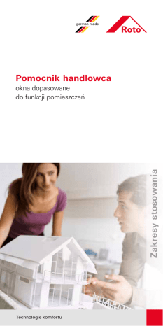 Pomocnik handlowca Zakresy stosowania okna dopasowane do funkcji pomieszczeń Technologie komfortu Jakie okno, taki dom! Dopasuj okna do funkcji pomieszczeń Okna a funkcjonalność domu Wielkość okien, zastosowane rozwiązania okuć, rodzaj profilu z jakiego są wykonane i nie bez znaczenia typ szyby mają bezpośredni wpływ na estetykę, bezpieczeństwo i funkcjonalność domu. Zestawienie stolarki to za mało Dobry handlowiec zdobywa zaufanie i pozytywne decyzje klientów fachowością doradztwa. Żeby zaoferować optymalne rozwiązanie do danego pomieszczenia musi poznać dokładniej projekt domu i oczekiwania inwestorów: na które strony świata wychodzą pokoje, balkony i tarasy, jakie funkcje przewidziane są dla poszczególnych pomieszczeń, czy powierzchnia robocza kuchni koncentruje sę przy oknie, czy na środku, czy w domu będą mieszkały małe dzieci lub osoby starsze, jak blisko przebiega ruchliwa ulica, które okna i drzwi dostępne mogą być dla osób postronnych, itp. ... itd. ... 1 Okna do zadań specjalnych to wygoda życia na co dzień: okna do kuchni 5 , do łazienki 6 , do pokoju pracy 7 lub na klatkę schodową 8 Zwróć uwagę inwestorów na to, że dom powinien być bezpieczny dla wszystkich domowników 3 8 6 4 2 5 7 Wygra ten, kto rozwiąże problem Ciepły i suchy dom Hamulec w klamce pozwoli zablokować otwarte skrzydło w dowolnym położeniu i zadba o właściwe wietrzenie np. w łazience Na kolejnych stronach znajdziesz wiele funkcjonalnych rozwiązań: 1 2 3 4 Parter: obcym wstęp wzbroniony W salonie liczy się estetyka Bezpieczny pokój dziecka Zdrowy klimat w sypialni Salon | zadbaj o piękny wygląd Designo – okna i drzwi z ukrytymi zawiasami Ukryte zawiasy Roto NT Designo zakres stosowania: do skrzydeł prostokątnych RU, R, U, UR (TiltFirst) masa skrzydła do.......80 kg / 100 kg / 150 kg szerokość skrzydła na wrębie...330* – 1400 mm wysokość skrzydła na wrębie...280* – 2400 mm Możliwość wykonania okien o podwyższonej odporności na włamanie: WK1 i WK2 *minimalna szerokość i wysokość skrzydła jest większa dla WK1 i WK2 sprawdź w szczegółowych instrukcjach Roto Dostępne wyposażenie: hamulec w klamce, zabezpieczenie do pokoju dziecka TiltFirst, niski próg balkonowy, 2-stopniowa mikrowentylacja, TurnPlus, klamka na środku okien 2-skrzydł. Uwaga: brak możliwości wykonania okien łukowych i trapezowych z ukrytymi zawiasami Roto NT Designo Ukryte zawiasy Roto Designo na pozór mała rzecz, ale wielka różnica Klamka RotoSwing z ukrytą rozetką nowoczesny styl i ergonomia w wersjach: Standard, Secustik i z kluczem Kolory dostępne od ręki: tytan (R01.3) brąz (R05.5) i biały Komfortowy hamulec w klamce Otwórz okno na odpowiednią szerokość i zablokuj skrzydło w wybranym położeniu: wystrarczy przekręcić klamkę w dół – bez ryzykownego stosowania mebli i roślin w tej funkcji Komfortowy hamulec w klamce zakres stosowania - okna z drewna i PVC: skrzydła RU z ukrytymi zawiasami Designo szerokość skrzydła na wrębie...571 – 1570 mm skrzydła R z ukrytymi zawiasami Designo szerokość skrzydła na wrębie...490 – 1560 mm skrzydła RU z widocznymi zawiasami szerokość skrzydła na wrębie...561 – 1560 mm skrzydła R z widocznymi zawiasami szerokość skrzydła na wrębie...360 – 1560 mm Sypialnia i łazienka | zadbaj o świeże powietrze Gdy trzeba zdrowo wywietrzyć Wielostopniowy uchył Dzięki niemu można precyzyjnie ustawić wielkość uchyłu, a tym samym dostroić do temperatury otoczenia strumień napływającego powietrza Wielostopniowy uchył (5-12 pozycji uchyłu) zakres stosowania: do skrzydeł prostokątnych RU z drewna i PVC z widocznymi zawiasami masa skrzydła do.......130 kg szerokość skrzydła na wrębie...540 – 1600 mm wysokość skrzydła na wrębie...280 – 2400 mm Przeciwdziałaj zawilgoceniu łazienki wielostopniowy uchył pozwoli na dopasowanie wietrzenia do intensywności korzystania z łazienki Wystarczy przekręcić klamkę o 45° od góry żeby stabilnie zablokować uchylone skrzydło w jednej z wielu pozycji wentylacyjnych na całą noc zdrowego snu E-Tec Drive – napęd uchylająco-ryglujący Niewidoczny na zamkniętym oknie automat uchyli okno o zaprogramowanej porze na optymalny czas, a po wywietrzeniu bezpiecznie zarygluje je na całym obwodzie, nawet pod nieobecność domowników. Szczególnie pomocny w łazience w walce z grzybem i wilgocią Zakres stosowania E-Tec Drive do skrzydeł prostokątnych RU z drewna, PVC i aluminium z zawiasami ukrytymi Designo lub widocznymi masa skrzydła do.......100 kg szerokość skrzydła na wrębie...611 – 1400 mm wysokość skrzydła na wrębie...600 – 2200 mm Pokój dziecka | zadbaj o bezpieczeństwo Bezpieczeństwo całej rodziny W pokoju dziecka, a także w innych pomieszczeniach na wyższych kondygnacjach, do których dostęp mają dzieci, warto zastosować inteligentne zabezpieczenie Roto Tilt-First (najpierw uchyl, potem otwórz) ze specjalną klamką na klucz. Uchylić okno, żeby wywietrzyć pokój, może każdy, ale do jego otwarcia potrzebny jest klucz. Zakres stosowania Zabezpieczenie TiltFirst do pokoju dziecka może być stosowane do skrzydeł prostokątnych RU z drewna i PVC z zawiasami ukrytymi Designo lub widocznymi o masie i wymiarach jak standardowe skrzydło RU. Klamka TiltFirst („najpierw uchyl, potem otwórz”) uchylanie (klamka ustawiona poziomo) otwieranie tylko po przekręceniu klucza (klamka ustawiona pionowo do góry) Okno musi być bezpieczne! Zwłaszcza w pokoju dziecka Okna otwierają dom na świat – także małym odkrywcom, którzy nie zdają sobie często sprawy z wielu zagrożeń. Pytaj o okna z zabezpieczeniem Roto Tilt-First do pokoju dziecka Kuchnia i pokój pracy | zadbaj o łatwy dostęp do okna Okno do pokoju pracy z klamką na wygodnej wysokości Rozwiązanie Komfort z dużą klamką u dołu zakres stosowania: do skrzydeł prostokątnych RU z drewna i PVC z widocznymi zaw