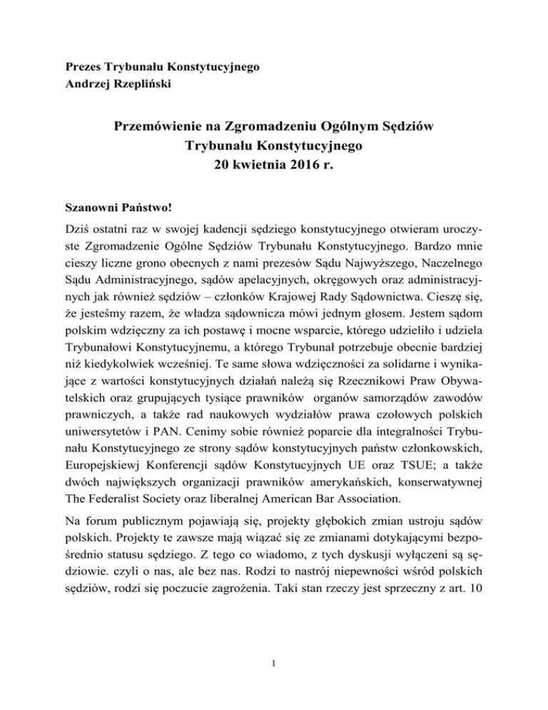 Prezes Trybunału Konstytucyjnego Andrzej Rzepliński Przemówienie na Zgromadzeniu Ogólnym Sędziów Trybunału Konstytucyjnego 20 kwietnia 2016 r. Szanowni Państwo! Dziś ostatni raz w swojej kadencji sędziego konstytucyjnego otwieram uroczyste Zgromadzenie Ogólne Sędziów Trybunału Konstytucyjnego. Bardzo mnie cieszy liczne grono obecnych z nami prezesów Sądu Najwyższego, Naczelnego Sądu Administracyjnego, sądów apelacyjnych, okręgowych oraz administracyjnych jak również sędziów – członków Krajowej Rady Sądownictwa. Cieszę się, że jesteśmy razem, że władza sądownicza mówi jednym głosem. Jestem sądom polskim wdzięczny za ich postawę i mocne wsparcie, którego udzieliło i udziela Trybunałowi Konstytucyjnemu, a którego Trybunał potrzebuje obecnie bardziej niż kiedykolwiek wcześniej. Te same słowa wdzięczności za solidarne i wynikające z wartości konstytucyjnych działań należą się Rzecznikowi Praw Obywatelskich oraz grupujących tysiące prawników organów samorządów zawodów prawniczych, a także rad naukowych wydziałów prawa czołowych polskich uniwersytetów i PAN. Cenimy sobie również poparcie dla integralności Trybunału Konstytucyjnego ze strony sądów konstytucyjnych państw członkowskich, Europejskiewj Konferencji sądów Konstytucyjnych UE oraz TSUE; a także dwóch największych organizacji prawników amerykańskich, konserwatywnej The Federalist Society oraz liberalnej American Bar Association. Na forum publicznym pojawiają się, projekty głębokich zmian ustroju sądów polskich. Projekty te zawsze mają wiązać się ze zmianami dotykającymi bezpośrednio statusu sędziego. Z tego co wiadomo, z tych dyskusji wyłączeni są sędziowie. czyli o nas, ale bez nas. Rodzi to nastrój niepewności wśród polskich sędziów, rodzi się poczucie zagrożenia. Taki stan rzeczy jest sprzeczny z art. 10 1 Konstytucji oraz z jej rozdziałem VIII. Takie działania ignorują również treść §§ 44, 45, 46, 47 oraz 48 opinii Komisji Weneckiej z 11 marca br.1 W moim zeszłorocznym wystąpieniu na Zgromadzeniu Ogólnym powiedziałem, że wybór nowych sędziów konstytucyjnych pod koniec 2015 r. będzie ważnym sprawdzianem polskiej kultury politycznej. Jak ten sprawdzian wypadł, wiemy wszyscy aż zanadto dobrze, dlatego dziś nie będę tego wątku poruszać. 3 grudnia 2015 r. Trybunał Konstytucyjny wydał wyrok w sprawie K 34/15. Orzekł w nim m.in., że art. 137 ustawy o Trybunale Konstytucyjnym z 25 czerwca 2015 r. był niekonstytucyjny w zakresie, w jakim umożliwił wybór sędziów Trybunału Konstytucyjnego na miejsca, które zostały opróżnione już podczas VIII kadencji Sejmu. Dotyczyło to sędziów, którzy mieli rozpocząć kadencje 3 i 9 grudnia 2015 r. Niekonstytucyjność podstawy prawnej istotnego etapu procedury wyboru tych dwóch sędziów skutkowała zamknięciem niezakończonego jeszcze postępowania w sprawie objęcia funkcji sędziego Trybunału Konstytucyjnego. Jednocześnie Trybunał Konstytucyjny uznał art. 137 ustawy za konstytucyjny w zakresie, w jakim umożliwił wybór sędziów Trybunału Konstytucyjnego na miejsca, które zostały opróżnione jeszcze w czasie trwania VII kadencji Sejmu. To znaczy, że postępowanie w sprawie objęcia funkcji sędziego Trybunału Konstytucyjnego przez sędziów wybranych na miejsca opróżnione 6 listopada 2015 r. powinno zostać niezwłocznie zakończone odebraniem od nich ślubowania przez Prezydenta.2. Nie miejsce jednak na żale. Polecam państwu lekturę rozdziału 8 części I naszej „Informacji rocznej…” którą Państwo dzisiaj otrzymali. Chce się skupić na tym, z czego Trybunał Konstytucyjny jest dumny, tj. na naszym dorobku orzeczniczym obejmującym 2744 judykatów. Z okazji trzydziestolecia działalności Trybunału Konstytucyjnego pozwolę sobie odnieść się nie tylko do wyroków ubiegłorocznych, lecz także do wcześniejszych. Skoncentruję się na dwóch kluczowych zagadnieniach: zakresie swobody ustawodawcy z jednej oraz jej konstytucyjnych granic w poszczególnych sferach regulacji prawnej z drugiej strony. ***** 1 2 CDL-AD(2016)001. Wyrok z 3 grudnia 2015 r. w sprawie K 34/15. 2 Podsumowanie naszej zeszłorocznej działalności zacznę jednak od liczb opisujących naszą pracę w 2015 roku. Był to rok rekordowy – do Trybunału wpłynęły 623 sprawy: wnioski, pytania prawne i skargi konstytucyjne. To największy dotychczas roczny wpływ spraw w historii Trybunału Konstytucyjnego. Było to o 17,5% więcej spraw niż rok wcześniej. Liczba spraw podlegających wstępnemu rozpoznaniu wyniosła 442 i była o 6% wyższa niż w roku poprzednim, a liczba spraw niepodlegających rozpoznaniu wstępnemu wyniosła 181 i była aż o 60% większa niż rok wcześniej. Najważniejszym źródłem „dopływu” spraw do Trybunału pozostały skargi konstytucyjne – w zeszłym roku było ich 408 i stanowiły one 65% wszystkich spraw. Ubiegły rok był dla Trybunału Konstytucyjnego rekordowy również pod względem liczby rozstrzygniętych spraw i wydanych orzeczeń. Trybunał rozstrzygnął 303 sprawy – o 93% więcej niż rok wcześniej. Niektóre sprawy Trybunał rozpoznał łącznie i wydał w sumie 173 orzeczenia merytoryczne – 63 wyroki i 110 postanowień o umorzeniu postępowania. Liczba wydanych orzeczeń merytorycznych była większa od tej z roku 2014 o 45%. Wśród 63 wyroków w 35 sprawach Trybunał orzekł o niekonstytucyjności co najmniej jednego z zakwestionowanych przepisów, co stanowiło 56% wszystkich wyroków. W 10 sprawach Trybunał odroczył termin utraty mocy obowiązującej niekonstytucyjnych przepisów. Czas merytorycznego rozpoznania sprawy był dłuższy niż w roku 2014 o trzy miesiące i wyniósł 21 miesięcy. Na etapie wstępnej kontroli skarg konstytucyjnych i wniosków podmiotów o ograniczonej legitymacji Trybunał wydał łącznie 918 postanowień i zarządzeń, czyli o 11% więcej niż rok wcześniej. 