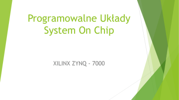 Programowalne Układy System On Chip XILINX ZYNQ - 7000 Architektura Product table ZYBO BOARD ZYNQ XC7Z010-1CLG400C 512MB x32 DDR3 w/ 1050Mbps bandwidth Dual-role (Source/Sink) HDMI port Artix-7 FPGA: 28K logic cells 240KB Block RAM 80 DSP slices On-chip dual channel, 12bit, 1 MSPS analog-todigital converter (XADC) Karta SD – struktura / Środowisko potrzebne do kompilacji ZYBO_BOOT uImage – plik który bootuje cały system. Devicetree.dtb – plik zawierający konfigurację wszystkich urządzeń peryferyjnych. BOOT.bin – kontener zawierający pliki budujące system: u-boot.elf, FSBL.elf, system.bit. ROOT_FS – zawiera pliki Linuxa Linaro (533MB) oraz jest dyskiem roboczym systemu operacyjnego 5, link: https://releases.linaro.org/12.09/ubuntu/precise-images/ubuntu-desktop CentOS 6.5 Xilinx Vivado – wersja 2014.1+ Tworzenie u-boot.elf Komendy do wpisania w terminal: source /opt/Xilinx/Vivado/2014.1/settings64.sh git clone git://git.linaro.org/boot/u-boot-linaro-stable.git cd u-boot-linaro-stable make CROSS_COMPILE=arm-xilinx-linux-gnueabi-zynq_zybo_config make CROSS_COMPILE=arm-xilinx-linux-gnueabi cp u-boot u-boot.elf Tworzenie FSBL.elf Uruchamiamy Vivado dzięki komendzie w terminalu: vivado Otwieramy projekt dostępny z prezentacją. Eksportujemy zaprojektowany projekt sprzętu do aplikacji SDK. Tworzenie FSBL.elf Tworzymy nowy projekt: Wybieramy opcję Application Project Tworzenie FSBL.elf Wypełniamy okno jak w poniższym screenie: Klikamy Next > i przechodzimy do końcowego okna w którym wybieramy opcję Zynq FSBL. Next > Tworzenie BOOT.bin W SDK uruchamiamy Xilinx Tools ->Create Zynq Boot Image W otwartym oknie dodajemy pliki potrzebne do zbudowania pliku BOOT.bin FSBL.elf – ustawiony jako bootloader u-boot.elf System.bit Tworzenie devicetree.dtb W plikach dostępnych z projektem znajduje się plik zynq-ZYBO.dts oraz folder dtc. Kompilacja pliku devicetree.dtb: mkdir devicetree cd decivetree mkdir dts cp –r ../dtc ../devicetree cp ../zynq-ZYBO.dts ..devicetree/dts dtc/dtc –I dts –0 dtb -o ./devicetree.dtb dts/zynq-ZYBO.dts
