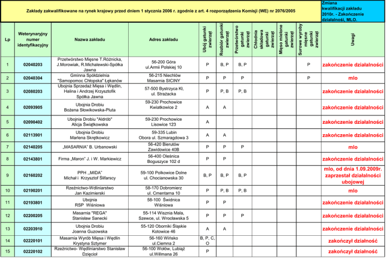 Zmiana kwalifikacji zakładu 2010r. - Zakończenie działalnośi, MLO. Przetwórstwo gatunki zwierząt Surowe wyroby mięsne gatunki zwierząt Uwagi P B, P B, P P zakończenie działalności 56-215 Niechlów Masarnia SICINY P P P P mlo 57-500 Bystrzyca Kł, ul. StraŜacka P P, B P, B A A Mięso mielone gatunki zwierząt Rozbiór gatunki zwierząt 56-200 Góra ul.Armii Polskiej 10 Chłodnia składowa gatunki zwierząt Adres zakładu Ubój gatunki zwierząt Zakłady zakwalifikowane na rynek krajowy przed dniem 1 stycznia 2006 r. zgodnie z art. 4 rozporządzenia Komisji (WE) nr 2076/2005 Lp Weterynaryjny numer identyfikacyjny 1 02040203 2 02040304 3 02080203 4 02093905 Ubojnia Drobiu BoŜena Słowikowska-Pluta 5 02090402 Ubojnia Drobiu "Aldrób" Alicja Świątkowska 59-230 Prochowice Lisowice 123 A 6 02113901 Ubojnia Drobiu Marlena Skrętkowicz 59-335 Lubin Obora ul. Szmaragdowa 3 A A 7 02140205 „MASARNIA” B. Urbanowski 56-420 Bierutów Zawidowice 40B P P 8 02143801 Firma „Maron” J. i W. Markiewicz 56-400 Oleśnica Boguszyce 102 d P P 9 02160202 PPH ,,MIDA” Michał i Krzysztof Ślifarscy 59-100 Polkowice Dolne ul. Chocianowska 30 B, P B, P B, P mlo, od dnia 1.09.2009r. zaprzestał działalności ubojowej 10 02190201 Rzeźnictwo-Wdliniarstwo Jan Kazimierski 58-170 Dobromierz ul. Cmentarna 10 P P, B P, B mlo 11 02193801 Ubojnia RSP Wiśniowa 58-100 Świdnica Wiśniowa P P 12 02200205 Masarnia "REGA" Stanisław Sanecki 55-114 Wisznia Mala, Szewce, ul. Wrocławska 5 P P 13 02203910 Ubojnia Drobiu Joanna Guzowska 55-120 Oborniki Śląskie Kotowice 46 A A 14 02220101 15 02220102 Masarnia Wyrób Mięsa i Wędlin Krystyna Sztymer Rzeźnictwo- Wędliniarstwo Stanisław Dzięcioł 56-160 Wińsko ul.Ciemna 2 56-100 Wołów, LubiąŜ ul.Willmana 26 Nazwa zakładu Przetwórstwo Mięsne T.RóŜnicka, J.Morowiak, R.Michalewski-Spółka Jawna Gminna Spółdzielnia "Samopomoc Chłopska" Łękanów Ubojnia SprzedaŜ Mięsa i Wędlin, Halina i Andrzej Krzysztofik Spółka Jawna 59-230 Prochowice Kwiatkowice 2 zakończenie działalności zakończenie działalności zakończenie działalności zakończenie działalności P mlo zakończenie działalności zakończenie działalności P zakończenie działalności zakończenie działalności B, P, C, O zakończył działność P zakończył działność 55-095 Długołęka Byków 29b P, B P, B 55-081 Mietków, StróŜa Dolna, ul. Rzeczna 12 A A 16 02230201 Ubojnia i przetwórnia mięsa Anna Jarzyna 17 02233909 KURCZAKI UBÓJ I HANDEL Alina Puterko 18 02240208 Przedsiębiorstwo Produkcyjno Usługowe "P&K" Ząbkowice Śląskie ul. Kłodzka 19 57-211 Ciepłowody Targowica 38A P zakończenie działalności 19 02240103 Przedsiębiorstwo Produkcyjno Handlowe "HE-MA" ul. Daleka 1. 57-200 Ząbkowice Śląskie 57-200 Ząbkowice Śl, Rudnica 1 B zakończenie działalności P, B mlo zakończenie działalności
