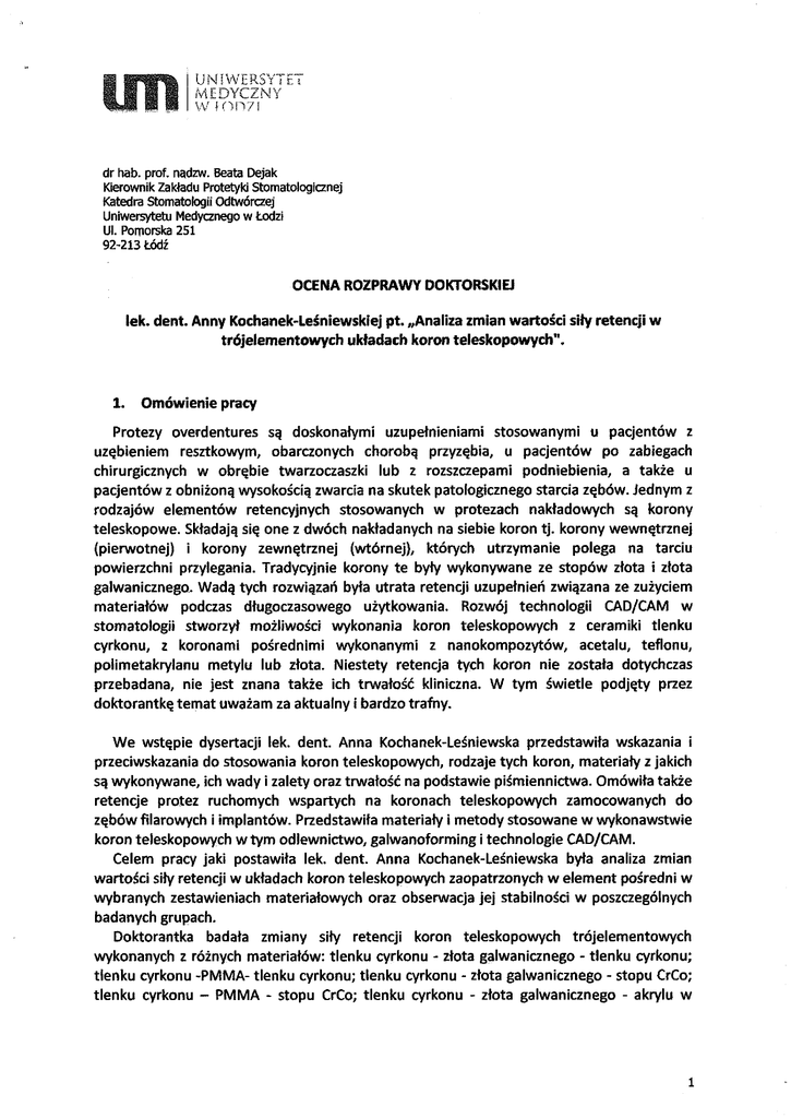 UNIWERSYTE" MEDYCZNY w mn/i dr hab. prof. nadzw. Beata Dejak Kierownik Zakładu Protetyki Stomatologicznej Katedra Stomatologii Odtwórczej Uniwersytetu Medycznego w Łodzi Ul. Pomorska 251 92-213 Łódź OCENA ROZPRAWY DOKTORSKIEJ lek. dent. Anny Kochanek-Lesniewskiej pt. „Analiza zmian wartości siły retencji w trójelementowych układach koron teleskopowych". 1. Omówienie pracy Protezy overdentures są doskonałymi uzupełnieniami stosowanymi u pacjentów z uzębieniem resztkowym, obarczonych chorobą przyzębia, u pacjentów po zabiegach chirurgicznych w obrębie twarzoczaszki lub z rozszczepami podniebienia, a także u pacjentów z obniżoną wysokością zwarcia na skutek patologicznego starcia zębów. Jednym z rodzajów elementów retencyjnych stosowanych w protezach nakładowych są korony teleskopowe. Składają się one z dwóch nakładanych na siebie koron tj. korony wewnętrznej (pierwotnej) i korony zewnętrznej (wtórnej), których utrzymanie polega na tarciu powierzchni przylegania. Tradycyjnie korony te były wykonywane ze stopów złota i złota galwanicznego. Wadą tych rozwiązań była utrata retencji uzupełnień związana ze zużyciem materiałów podczas długoczasowego użytkowania. Rozwój technologii CAD/CAM w stomatologii stworzył możliwości wykonania koron teleskopowych z ceramiki tlenku cyrkonu, z koronami pośrednimi wykonanymi z nanokompozytów, acetalu, teflonu, polimetakrylanu metylu lub złota. Niestety retencja tych koron nie została dotychczas przebadana, nie jest znana także ich trwałość kliniczna. W tym świetle podjęty przez doktorantkę temat uważam za aktualny i bardzo trafny. We wstępie dysertacji lek. dent. Anna Kochanek-Leśniewska przedstawiła wskazania i przeciwskazania do stosowania koron teleskopowych, rodzaje tych koron, materiały z jakich są wykonywane, ich wady i zalety oraz trwałość na podstawie piśmiennictwa. Omówiła także retencje protez ruchomych wspartych na koronach teleskopowych zamocowanych do zębów filarowych i implantów. Przedstawiła materiały i metody stosowane w wykonawstwie koron teleskopowych w tym odlewnictwo, galwanoforming i technologie CAD/CAM. Celem pracy jaki postawiła lek. dent. Anna Kochanek-Leśniewska była analiza zmian wartości siły retencji w układach koron teleskopowych zaopatrzonych w element pośredni w wybranych zestawieniach materiałowych oraz obserwacja jej stabilności w poszczególnych badanych grupach. Doktorantka badała zmiany siły retencji koron teleskopowych trójelementowych wykonanych z różnych materiałów: tlenku cyrkonu - złota galwanicznego - tlenku cyrkonu; tlenku cyrkonu -PMMA- tlenku cyrkonu; tlenku cyrkonu - złota galwanicznego - stopu CrCo; tlenku cyrkonu - PMMA - stopu CrCo; tlenku cyrkonu - złota galwanicznego - akrylu w 1 UNIWERSYTET MEDYCZNY W 10071 porównaniu do tradycyjnych koron stop złota - złoto galwaniczne - stop CrCo. Do przeprowadzenia badań zaprojektowano i skonstruowano specjalne stanowisko badawcze we współpracy z Instytutem Technologii Eksploatacji w Radomiu. Badanie polegało na cyklicznym obciążaniu układu koron (zakładaniu i zdejmowaniu korony zewnętrznej). Podzielono je na dwa etapy. W pierwszym zbadano wartości siły retencji w zakresie 0-30 000 cykli, wykonując pięciokrotny pomiar po każdych 100 cyklach obciążeń. W drugim etapie próbki/ które przetrwały pierwszą część badania, poddano dalszemu testowaniu w zakresie od 0 do 300 000 cykli złączania i rozłączania koron, ale w tym zakresie dokonywano trzykrotnego pomiaru siły retencji, co 1000 cykli obciążeń, z zastosowaniem siły dociskającej o wartości 100N. Przeprowadzono analizę statystyczną wyników. Na podstawie przeprowadzonych badan autorka wyciągnęła następujące wnioski 1. Technologia CAD/CAM, umożliwiająca wykonanie korony wewnętrznej i zewnętrznej z tlenku cyrkonu w układach trójelementowych, gwarantuje najbardziej stabilne wartości siły retencji niezależnie od rodzaju elementu pośredniego mocowanego pomiędzy nimi. 2. Przy planowaniu układów koron teleskopowych należy zwrócić szczególną uwagę na rodzaj materiału z jakiego wykonana będzie korona zewnętrzna, gdyż właśnie ten element ma największy wpływ na zmiany wartości siły retencji w zakresie obserwacji do 30 000 cykli. 3. Ze względu na korzystny charakter zmian siły retencji, obserwowany dla badanego zestawienia materiałowego (ZrO-AuGalv-CrCo), będącego połączeniem elementów wykonanych z wykorzystaniem zarówno nowoczesnych technologii, jak i tradycyjnych metod odlewania, układ ten może być brany pod uwagę w praktyce klinicznej. 4. Przy zastosowaniu układów koron teleskopowych, wykonanych w tradycyjnym zestawieniu materiałowym (Au-AuGalv-CrCo), rosnącej wartości siły retencji w funkcji liczby cykli może towarzyszyć ryzyko mechanicznych uszkodzeń w układach. 5. Korony teleskopowe wykonane z tlenku cyrkonu, zaopatrzone w element pośredni wykonany zarówno ze złota galwanicznego, jak i polimetakrylanu metylu, stanowią korzystne rozwiązanie alternatywne w konstrukcji koron teleskopowych, zapewniając długotrwałą stabilność wartości siły retencji. 2. Ocena pracy Przedstawiona mi do oceny rozprawa, ma prawidłowy układ monografii, liczy 165 stron maszynopisu, ilustrowana jest 66 rycinami i zawiera 36 tabel. Szata graficzna i edytorska pracy jest nienaganna. Manuskrypt napisany jest bardzo starannie, a treści w niej zawarte są czytelne. Zwraca uwagę bardzo mała liczna błędów edytorskich, literowych i interpunkcyjnych. Tytuł odpowiada tezom pracy. We wstępie pracy, Doktorantka wprowadziła czytelnika w problematykę dysertacji. Rozdział ten został napisany w oparciu o trafnie dobrane i aktualne piśmiennictwo. Cel prac został jasno sformułowany. Doktorantka dodatkowo postawiła 5 hipotez! Materiał badań został opisany w sposób czytelny, poparty tabelą i zdjęciami próbek. Doktorantka wykorzystała do w