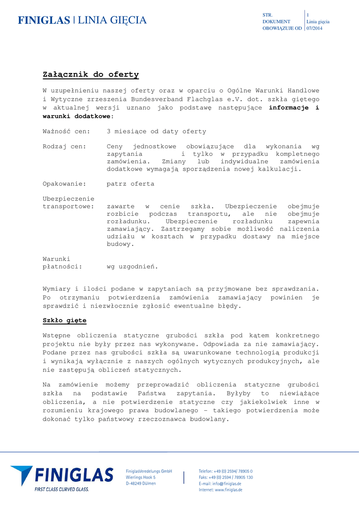 STR. 1 DOKUMENT Linia gięcia OBOWIĄZUJE OD 07/2014 FINIGLAS | LINIA GIĘCIA Załącznik do oferty W uzupełnieniu naszej oferty oraz w oparciu o Ogólne Warunki Handlowe i Wytyczne zrzeszenia Bundesverband Flachglas e.V. dot. szkła giętego w aktualnej wersji uznano jako podstawę następujące informacje i warunki dodatkowe: WaŜność cen: 3 miesiące od daty oferty Rodzaj cen: Ceny jednostkowe obowiązujące dla wykonania wg zapytania i tylko w przypadku kompletnego zamówienia. Zmiany lub indywidualne zamówienia dodatkowe wymagają sporządzenia nowej kalkulacji. Opakowanie: patrz oferta Ubezpieczenie transportowe: Warunki płatności: zawarte w cenie szkła. Ubezpieczenie obejmuje rozbicie podczas transportu, ale nie obejmuje rozładunku. Ubezpieczenie rozładunku zapewnia zamawiający. Zastrzegamy sobie moŜliwość naliczenia udziału w kosztach w przypadku dostawy na miejsce budowy. wg uzgodnień. Wymiary i ilości podane w zapytaniach są przyjmowane bez sprawdzania. Po otrzymaniu potwierdzenia zamówienia zamawiający powinien je sprawdzić i niezwłocznie zgłosić ewentualne błędy. Szkło gięte Wstępne obliczenia statyczne grubości szkła pod kątem konkretnego projektu nie były przez nas wykonywane. Odpowiada za nie zamawiający. Podane przez nas grubości szkła są uwarunkowane technologią produkcji i wynikają wyłącznie z naszych ogólnych wytycznych produkcyjnych, ale nie zastępują obliczeń statycznych. Na zamówienie moŜemy przeprowadzić obliczenia statyczne grubości szkła na podstawie Państwa zapytania. Byłyby to niewiąŜące obliczenia, a nie potwierdzenie statyczne czy jakiekolwiek inne w rozumieniu krajowego prawa budowlanego - takiego potwierdzenia moŜe dokonać tylko państwowy rzeczoznawca budowlany. FiniglasVeredelungs GmbH Wierlings Hook 5 D-48249 Dülmen Telefon: +49 (0) 2594/ 78905 0 Faks: +49 (0) 2594 / 78905 130 E-mail: [email protected] Internet: www.finiglas.de STR. 2 DOKUMENT Linia gięcia OBOWIĄZUJE OD 07/2014 FINIGLAS | LINIA GIĘCIA NaleŜy pamiętać, Ŝe szkło gięte nie jest w Niemczech uregulowanym produktem budowlanym, a więc jego zastosowanie wymaga zawsze zgody wydanej w kaŜdym indywidualnym przypadku (ZiE). Wyjątkiem są produkty posiadające ogólną aprobatę budowlaną (abZ). Firma FINIGLAS Veredelungs GmbH posiada aprobatę abZ (Z-70.4-146) dla giętego szkła „FINI CURVE FLOAT“ i VSG ze szkła float „FINI CURVE VSG“. Jeśli wymagane są opinie rzeczoznawcy, naleŜy zwrócić się z oddzielnym zapytaniem. Uzyskanie zgody w indywidualnym przypadku lub ogólnej aprobaty budowlanej (abP) naleŜy do zakresu odpowiedzialności zamawiającego. Pod następującym linkiem moŜna pobrać ogólna aprobatę budowlaną dla „FINI CURVE FLOAT“ i „FINI CURVE VSG“: http://finiglas.semcoglas.com/service/downloads.html Fini Curve VSG -7 0. 4 - 14 15 Z GL NI A S FI Jako producent jesteśmy zobowiązani do znakowania stemplem wszystkich wysyłanych szyb: Jeśli nie podano inaczej, stempel ten jest umieszczany w przypadku szkła „FINI CURVE FLOAT“ i „FINI CURVE VSG“ ok. 15 / 15 mm od rogu(por. poniŜszy szkic). 6 15 Podczas produkcji wysokogatunkowych szyb giętych moŜe sporadycznie dochodzić do pęknięć lub wad. Dlatego nie moŜna wykluczyć przesunięcia podanych przez nas przewidywanych terminów dostawy. FiniglasVeredelungs GmbH Wierlings Hook 5 D-48249 Dülmen Telefon: +49 (0) 2594/ 78905 0 Faks: +49 (0) 2594 / 78905 130 E-mail: [email protected] Internet: www.finiglas.de STR. 3 DOKUMENT Linia gięcia OBOWIĄZUJE OD 07/2014 FINIGLAS | LINIA GIĘCIA W przypadku dodatkowych zamówień i/lub reklamacji mogą wystąpić róŜnice kolorów szkła wynikające z produkcji w róŜnych partiach. Takie reklamacje nie mogą być uznane. Ryzyko rozbicia szkła, a takŜe jego zarysowania, uszkodzenia krawędzi itp. w przypadku obróbki na zlecenie ponosi wyłącznie klient. Szkło hartowane Szkło hartowane moŜe zawierać niewidoczne wtrącenia siarczku niklu, co jest technicznie nieuniknione podczas produkcji. Dlatego spontaniczne pęknięcia mogą wystąpić zwłaszcza pod wpływem czynników termicznych. Wykonując test leŜakowania w wysokiej temperaturze szkła hartowanego („ESG“), heat-soak-test, moŜemy zapewnić, Ŝe pęknięcia spontaniczne spowodowane wtrąceniami siarczku niklu zostaną wyeliminowane do poziomu, który jest nieunikniony ze względów technicznych. Test taki naleŜy oddzielnie zamówić. Z uwagi na proces hartowania termicznego, w przypadku szkła hartowanego mogą występować chemiczne i mechaniczne zmiany właściwości powierzchni. Mogą wystąpić np. kropeczki i odciski rolek. Niekorzystna kombinacja składająca się z rodzaju, wielkości i grubości szkła prowadzi np. w przypadku duŜego promienia gięcia lub duŜego kąta gięcia do technologicznie nieuniknionego pogorszenia jakości optycznej, zwłaszcza do zjawiska falistości powierzchni i zwiększenia niedokładności. W przypadku szkła poddanego hartowaniu termicznemu powstaje anizotropia. Wskutek istnienia róŜnych stref napręŜeń powstaje podwójne załamanie promieni światła. Polaryzowana część światła dziennego sprawia, Ŝe zjawisko to jest widoczne w formie pierścieni w kolorach widma, obłoków itp. (iryzacja). Zjawiska te są uwarunkowane technologicznie, nieuniknione pod względem fizycznym i nie mogą być przyczyną reklamacji. Rozmieszczenie pól anizotropowych moŜe być róŜne w przypadku późniejszych dostaw, ale równieŜ w ramach jednej partii produkcyjnej. Na wyraźne Ŝyczenie zamawiającego moŜemy wykonać odpowiednią próbkę. FiniglasVeredelungs GmbH Wierlings Hook 5 D-48249 Dülmen Telefon: +49 (0) 2594/ 78905 0 Faks: +49 (0) 2594 / 78905 130 E-mail: [email protected] Internet: www.finiglas.de STR. 4 DOKUMENT Linia gięcia OBOWIĄZUJE OD 07/2014 FINIGLAS | LINIA GIĘCIA NaleŜy równieŜ stosować się do uwag technicznych dotyczących szkła hartowanego (tolerancje wymiarów, p