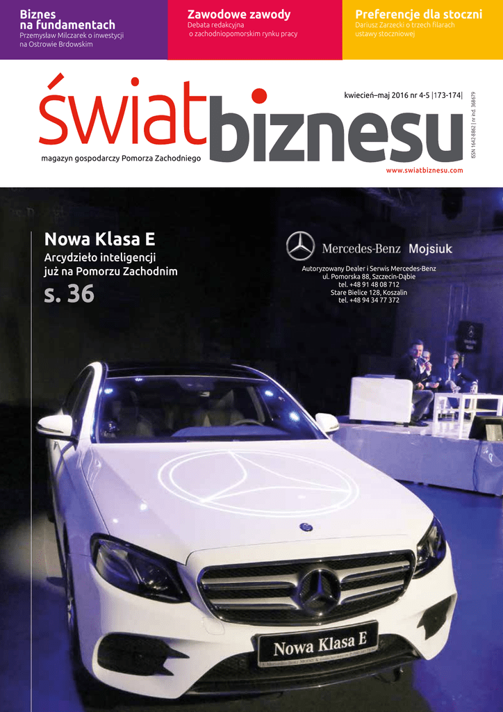 Przemysław Milczarek o inwestycji na Ostrowie Brdowskim Zawodowe zawody Debata redakcyjna o zachodniopomorskim rynku pracy Preferencje dla stoczni Dariusz Zarzecki o trzech filarach ustawy stoczniowej kwiecień–maj 2016 nr 4-5 |173-174| magazyn gospodarczy Pomorza Zachodniego ISSN 1642-8862 | nr ind. 368679 Biznes na fundamentach www.swiatbiznesu.com Nowa Klasa E Arcydzieło inteligencji już na Pomorzu Zachodnim Autoryzowany Dealer i Serwis Mercedes-Benz ul. Pomorska 88, Szczecin-Dąbie tel. +48 91 48 08 712 Stare Bielice 128, Koszalin tel. +48 94 34 77 372 1 Binowo Park Golf Club zaprasza na Club Binowo Park Golf zaprasza na w Golfa Kurs Nauki Gry Kurs Nauki Gry w Golfa • Uczęszczaj na zajęcia raz, dwa, trzy • Uczęszczaj naw zajęcia raz, dwa, trzy lub cztery razy tygodniu lub cztery razy w tygodniu • Zdobądź podstawową wiedzę i umiejętności • Zdobądź podstawową wiedzę i umiejętności • Poznaj nowych przyjaciół golfowych • Poznaj nowych przyjaciół golfowych • Korzystaj z przyjemności jaką niesie gra w Golfa! • Korzystaj z przyjemności jaką niesie gra w Golfa! Zajęcia: Zajęcia: wtorki środy czwartki wtorki środy czwartki niedziele niedziele 17:30 – 18:30 17:30 – 18:30 12:30 ––13:30 12:30 13:30 [email protected] [email protected] 2 tel.91 91 404 404 15 15 33 tel. 33 www.binowopark.pl kwiecień–maj 2016 www.binowopark.pl 3 W numerze 6| 8| 10 | 28 | 32 | Biznes na mocnych fundamentach Przemysław Milczarek, wiceprezes zarządu Bilfinger Mars Offshore, o inwestycji na Ostrowie Brdowskim, suwnicy gigancie i jedynym w Europie robocie. Zawodowe zawody Tym razem rozmawiamy na naszych łamach o zachodniopomorskim rynku pracy. Do dyskusji zaprosiliśmy dr Katarzynę Brzychcy, eksperta rynku pracy, wieloletnią wicedyrektorkę pionu Europejskiego Funduszu Społecznego Wojewódzkiego Urzędu Pracy w Szczecinie, Łukasza Kurzątkowskiego, dyrektora operacyjnego firmy produkującej systemy do skanowania elementów trójwymiarowych 3Shape Poland, Katarzynę Opiekulską, dyrektorkę firmy rekrutacyjno-szkoleniowej LSJ HR Group, oraz Sławomira Pajora, prezydenta Stargardu. Krecha Jacha Koktajl biznesowy Wśród jego składników jest wizyta premier Beaty Szydło w Szczecinie. – Chcemy, aby przemysł stoczniowy był jednym z filarów naszej gospodarki. Chcemy, aby Szczecin znów stał się sercem przemysłu stoczniowego – mówiła szefowa rządu podczas swojej wizyty w Szczecinie 4 kwietnia. W programie jej wizyty znalazła się m.in. wizyta w Europejskim Centrum Szkolenia LNG w Akademii Morskiej. W ramach koktajlu biznesowego na drugą edycję Ekobiegu zaprasza Wojewódzki Fundusz Ochrony Środowiska i Gospodarki Wodnej w Szczecinie. Z kolei do zdrowego życia na co dzień namawiał były chodziarz, mistrz olimpijski, Robert Korzeniowski. Podczas konferencji „Sport i zdrowie – receptą na zaangażowanie pracowników” opowiadał on uczestnikom - szefom i menedżerom zachodniopomorskich firm o tym, jak „zarządzać” aktywnością fizyczną. O tym, że rynek nieruchomości jest w rozpędzie, przekonali się zwiedzający targi Home Arena. Zachodniopomorscy deweloperzy są bardzo aktywni. Mieszkań i domów w najbliższych latach będzie więc przybywać. Popyt jest duży, ceny stabilne, a małe mieszkania w centrum sprzedają się nawet za gotówkę. Firmy, organizacje pozarządowe oraz instytucje z polsko-niemieckiego pogranicza miały po raz kolejny okazję do zaprezentowania się lokalnej społeczności w Policach. Udział w IX Polickich Targach Gospodarczych wzięło 70 wystawców z Polski i 11 z Niemiec. Gdybym był bogaty… jaba dibi dibi daj… Felieton Anety Zelek. Lepiej mniej, ale lepiej Felieton Wojciecha Olejniczaka. 33 | Stoczniowe filary Felieton Dariusza Zarzeckiego. 34 | 36 | Karuzela kadrowa Uciec do przodu Felieton Stanisława Flejterskiego. E Klasa: arcydzieło inteligencji Sporo rozwiązań zaczerpniętych z samochodu autonomicznego ma najnowszy mercedes klasy E. Mogli je poznać goście szczecińskiej premiery modelu zorganizowanej przez firmę Mojsiuk Mercedes-Benz w szczecińskiej Trafostacji Sztuki. Polska prapremiera operowego thrillera To będzie jedno z najważniejszych wydarzeń operowych w Polsce. Szczecińska Opera na Zamku wystawi 20 maja polską prapremierę „The Turn of the Screw” („Dokręcanie śruby”) Benjamina Brittena. 37 | 38 | 4 Piknik nad Odrą W 2016 roku odbędzie się jubileuszowa, 25. edycja targów MARKET TOUR. Targi turystyczne są najważniejszym elementem Pikniku nad Odrą odbywającego się na Wałach Chrobrego w Szczecinie. Oferta turystyczna oraz program wydarzeń co roku przyciąga blisko 50 tysięcy osób z całej Polski i zagranicy. Wydawca ABKOWICZ PRESS ul. Cukrowa 45-5, 71-004 Szczecin tel. 91 885 48 04, fax 91 885 48 03 Adres redakcji Świat Biznesu pl. Hołdu Pruskiego 8, 70-550 Szczecin tel. 91 442 92 75, fax 91 885 48 03 [email protected] Redaktor naczelny Włodzimierz Abkowicz, tel. 91 442 92 75 Zespół redakcyjny Michał Abkowicz Alicja Paulina Kowalska Mieczysław Manik Paweł Stężała Magdalena Szczepkowska Stali felietoniści Stanisław Flejterski Wojciech Olejniczak Dariusz Zarzecki Aneta Zelek Współpraca Krzysztof Jach Skład kolumn Monika Gerlicka, tel. 603 557 311 [email protected] Druk i naświetlanie „Rex-Druk”, ul. Dębogórska 34, 71-717 Szczecin tel. 91 428 11 11 Redakcja nie zwraca materiałów niezamówionych oraz zastrzega sobie prawo opracowania redakcyjnego tekstów przyjętych do druku. Redakcja nie odpowiada za merytoryczną treść reklam, ogłoszeń i tekstów sponsorowanych. PREZENTACJE – tak oznaczamy teksty promocyjne „Świat Biznesu” w Internecie: www.swiatbiznesu.com Na okładce: Premiera mercedesa Klasy E zorganizowana przez Autoryzowanego Dealera i Serwis Mercedes-Benz Mojsiuk w Trafostacji Sztuki w Szczecinie fot. materiały Mercedes-Benz Mojsiuk Twarze biznesu Na pytania z naszego kwestionariusza odpowiadają: Anna Sudolska