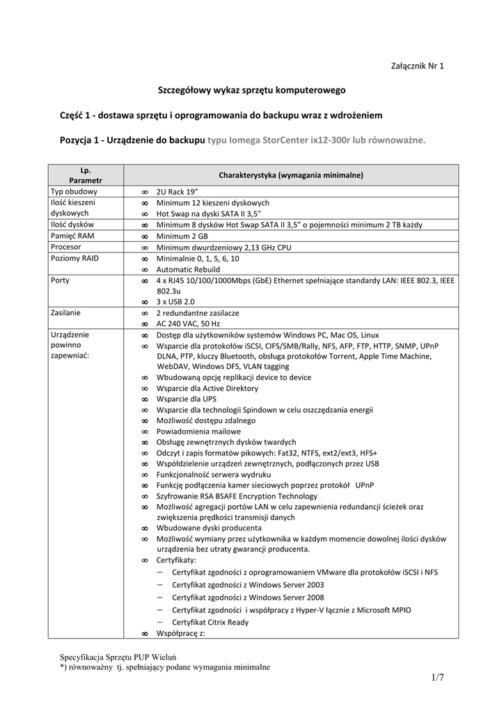 Załącznik Nr 1 Szczegółowy wykaz sprzętu komputerowego Część 1 - dostawa sprzętu i oprogramowania do backupu wraz z wdrożeniem Pozycja 1 - Urządzenie do backupu typu Iomega StorCenter ix12-300r lub równoważne. Lp. Parametr Typ obudowy Ilość kieszeni dyskowych Ilość dysków Pamięć RAM Procesor Poziomy RAID Porty Zasilanie Urządzenie powinno zapewniać: Charakterystyka (wymagania minimalne) • • • • • • • • • • • • • • • • • • • • • • • • • • • • • • • 2U Rack 19” Minimum 12 kieszeni dyskowych Hot Swap na dyski SATA II 3,5” Minimum 8 dysków Hot Swap SATA II 3,5” o pojemności minimum 2 TB każdy Minimum 2 GB Minimum dwurdzeniowy 2,13 GHz CPU Minimalnie 0, 1, 5, 6, 10 Automatic Rebuild 4 x RJ45 10/100/1000Mbps (GbE) Ethernet spełniające standardy LAN: IEEE 802.3, IEEE 802.3u 3 x USB 2.0 2 redundantne zasilacze AC 240 VAC, 50 Hz Dostęp dla użytkowników systemów Windows PC, Mac OS, Linux Wsparcie dla protokołów iSCSI, CIFS/SMB/Rally, NFS, AFP, FTP, HTTP, SNMP, UPnP DLNA, PTP, kluczy Bluetooth, obsługa protokołów Torrent, Apple Time Machine, WebDAV, Windows DFS, VLAN tagging Wbudowaną opcję replikacji device to device Wsparcie dla Active Direktory Wsparcie dla UPS Wsparcie dla technologii Spindown w celu oszczędzania energii Możliwość dostępu zdalnego Powiadomienia mailowe Obsługę zewnętrznych dysków twardych Odczyt i zapis formatów pikowych: Fat32, NTFS, ext2/ext3, HFS+ Współdzielenie urządzeń zewnętrznych, podłączonych przez USB Funkcjonalność serwera wydruku Funkcję podłączenia kamer sieciowych poprzez protokół UPnP Szyfrowanie RSA BSAFE Encryption Technology Możliwość agregacji portów LAN w celu zapewnienia redundancji ścieżek oraz zwiększenia prędkości transmisji danych Wbudowane dyski producenta Możliwość wymiany przez użytkownika w każdym momencie dowolnej ilości dysków urządzenia bez utraty gwarancji producenta. Certyfikaty: − Certyfikat zgodności z oprogramowaniem VMware dla protokołów iSCSI i NFS − Certyfikat zgodności z Windows Server 2003 − Certyfikat zgodności z Windows Server 2008 − Certyfikat zgodności i współpracy z Hyper-V łącznie z Microsoft MPIO − Certyfikat Citrix Ready Współpracę z: Specyfikacja Sprzętu PUP Wieluń *) równowaŜny tj. spełniający podane wymagania minimalne 1/7 − macierzami sieci IP SAN − platformą wirtualizacji Citrix XenServer 5.5 i Citrix Delivery Center™ − platformą linux: Ubuntu 7.10, Fedora 7,8, Fedora Core 6/5 , Red Hat Enterprise Linux 4 i 5 (desktop/workstation), OPENSuse 10.3, Debian 4, SLES Linux 10 sp2 produkt musi być fabrycznie nowy i dostarczony przez autoryzowany kanał sprzedaży producenta na terenie kraju. • Pozycja 2 - Oprogramowanie do backupu typu Retrospect Express HD Backup and recovery, z licencjami na wiele serwerów, MSSQL i OpenFile, lub równoważne Lp. Parametr oprogramowanie do wykonywania kopii bezpieczeństwa musi zapewniać Charakterystyka (wymagania minimalne) • • • • • • • • • • • • • • Musi umożliwiać wykonywanie kopii bezpieczeństwa w heterogenicznym środowisku obejmującym systemy MS Windows, SUSE Linux, NetWare, Mac OS X, Mac OS, Red Hat Linux, oraz Solaris Musi umożliwiać wykonywanie kopii bezpieczeństwa w oparciu o kalendarz. Musi posiadać opcję backupu proaktywnego, (jeśli komputer nie jest podłączony do sieci w godzinie wyznaczonej przez harmonogram, przy następnym podłączeniu oprogramowanie musi natychmiast wykonać backup). Musi umożliwiać wykonywanie kopii zapasowych na dysk, media taśmowe oraz media optyczne. Musi umożliwiać obsługę dysku jako nośnika do zapisu kopii bezpieczeństwa w sposób umożliwiający jednoczesny zapis oraz odczyt danych w tym samym czasie. Musi umożliwiać szyfrowanie przesyłanych danych, Musi posiadać intuicyjną konsole zarządzania procesami, politykami wykonywania kopii bezpieczeństwa, odtwarzania, zarządzania urządzeniami taśmowymi, mediami. Musi posiadać mechanizm informowania administratorów o wystąpieniu błędów za pośrednictwem automatycznie generowanych wiadomości poczty elektronicznej. Musi posiadać możliwość backupu nieograniczonej liczby serwerów. Musi posiadać możliwość backupu nieograniczonej liczby stacji roboczych. Musi zapewniać Disaster Recovery systemów MS Windows. Musi zapewniać backup plików otwartych dla serwerów pracujących w systemie Windows Musi umożliwiać wykonywanie kopii bezpieczeństwa przynajmniej jednej instancji bazy danych Microsoft SQL bez konieczności przerywania jej pracy tzn. w trybie online. Musi umożliwiać rozbudowę o wykonywanie kopii bezpieczeństwa oprogramowania Microsoft Exchange bez konieczności przerywania jego pracy tzn. w trybie on-line. Licencja na tę funkcjonalność nie stanowi przedmiotu przetargu. Oprogramowanie ma mieć możliwość dokupienia licencji na te funkcjonalność w późniejszym czasie. Pozycja 3 - Wdrożenie Lp. Parametr Czynności wdrożeniowe i serwisowe Charakterystyka (wymagania minimalne) • • • • • • Wdrożenie całości systemu w istniejącej infrastrukturze: Integracja z istniejąca infrastrukturą sieci LAN Montaż urządzeń w szafie rack Instalacja macierzy dyskowej Wdrożenie systemu backupu Konfiguracja macierzy Specyfikacja Sprzętu PUP Wieluń *) równowaŜny tj. spełniający podane wymagania minimalne 2/7 • • • • • Konfiguracja polityk określających przydzielanie zasobów Testy wydajności, optymalizacja Próbne odtworzenie wskazanych systemów Prezentacja rozwiązania i szkolenie Opieka serwisowa 3m-ce (telefoniczna, zdalna, mailowa, na miejscu u klienta). Część 2 - dostawa pozostałego sprzętu komputerowego Pozycja 1 - Rozbudowa serwera Dell PowerEdge 2900 Service Tag:68JPQ3J L.p.Parametr Pamięć Dyski twarde Charakterystyka (wymagania minimalne) • • • • DIMM,4G,667M,512X72,8,240,2RX4 - Sztuk 4 PN: P3