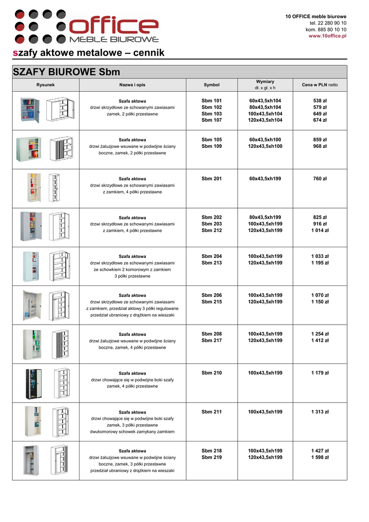10 OFFICE meble biurowe tel. 22 280 90 10 kom. 885 80 10 10 www.10office.pl szafy aktowe metalowe – cennik SZAFY BIUROWE Sbm Rysunek Nazwa i opis Symbol Wymiary dł. x gł. x h Cena w PLN netto Szafa aktowa drzwi skrzydłowe ze schowanymi zawiasami zamek, 2 półki przestawne Sbm 101 Sbm 102 Sbm 103 Sbm 107 60x43,5xh104 80x43,5xh104 100x43,5xh104 120x43,5xh104 538 zł 579 zł 649 zł 674 zł Szafa aktowa drzwi żaluzjowe wsuwane w podwójne ściany boczne, zamek, 2 półki przestawne Sbm 105 Sbm 109 60x43,5xh100 120x43,5xh100 859 zł 968 zł Szafa aktowa drzwi skrzydłowe ze schowanymi zawiasami z zamkiem, 4 półki przestawne Sbm 201 60x43,5xh199 760 zł Szafa aktowa drzwi skrzydłowe ze schowanymi zawiasami z zamkiem, 4 półki przestawne Sbm 202 Sbm 203 Sbm 212 80x43,5xh199 100x43,5xh199 120x43,5xh199 825 zł 916 zł 1 014 zł Szafa aktowa drzwi skrzydłowe ze schowanymi zawiasami ze schowkiem 2 komorowym z zamkiem 3 półki przestawne Sbm 204 Sbm 213 100x43,5xh199 120x43,5xh199 1 033 zł 1 195 zł Szafa aktowa drzwi skrzydłowe ze schowanymi zawiasami z zamkiem, przedział aktowy 3 półki regulowane przedział ubraniowy z drążkiem na wieszaki Sbm 206 Sbm 215 100x43,5xh199 120x43,5xh199 1 070 zł 1 150 zł Szafa aktowa drzwi żaluzjowe wsuwane w podwójne ściany boczne, zamek, 4 półki przestawne Sbm 208 Sbm 217 100x43,5xh199 120x43,5xh199 1 254 zł 1 412 zł Szafa aktowa drzwi chowające się w podwójne boki szafy zamek, 4 półki przestawne Sbm 210 100x43,5xh199 1 179 zł Szafa aktowa drzwi chowające się w podwójne boki szafy zamek, 3 półki przestawne dwukomorowy schowek zamykany zamkiem Sbm 211 100x43,5xh199 1 313 zł Szafa aktowa drzwi żaluzjowe wsuwane w podwójne ściany boczne, zamek, 3 półki przestawne przedział ubraniowy z drążkiem na wieszaki Sbm 218 Sbm 219 100x43,5xh199 120x43,5xh199 1 427 zł 1 598 zł SZAFY BIUROWE Sbm Nazwa i opis Symbol Wymiary dł. x gł. x h Cena w PLN netto Szafa aktowa drzwi przesuwne z zamkiem ze ścianką działową zamek, 4 półki przestawne Sbm 111 140x43,5xh104 872 zł Szafa aktowa drzwi przesuwne z zamkiem ze ścianką działową zamek, 2 półki przestawne Sbm 112 Sbm 110 100x43,5xh104 120x43,5xh104 809 zł 826 zł Szafa aktowa drzwi przesuwne z zamkiem ze ścianką działową zamek, 8 półek przestawnych Sbm 221 140x43,5xh199 1 437 zł Szafa aktowa drzwi przesuwne z zamkiem ze ścianką działową zamek, 4 półki przestawne Sbm 222 Sbm 220 100x43,5xh199 120x43,5xh199 1 233 zł 1 330 zł Nadstawka na szafę drzwi żaluzjowe wsuwane w podwójne ściany zamek, 1 półka przestawna Sbm 404 Sbm 406 100x43,5xh46,5 120x43,5xh46,5 614 zł 707 zł Nadstawka na szafę drzwi skrzydłowe ze schowanymi zawiasami zamek, 1 półka przestawna Sbm 401 60x43,5xh46,5 324 zł Nadstawka na szafę drzwi skrzydłowe ze schowanymi zawiasami zamek, 1 półka przestawna Sbm 403 Sbm 405 100x43,5xh46,5 120x43,5xh46,5 362 zł 408 zł Nazwa i opis Symbol Wymiary dł. x gł. x h Cena w PLN netto Szafa aktowa w górnej części szafa aktowa na 2 poziomy segregatorów, dół 4 szuflady na format A4 Skb 1 100x43,5xh199 1 718 zł Szafa aktowa w górnej części szafa aktowa na 2 poziomy segregatorów i jedno niższe, dół 3 szuflady na format A4 Skb 2 100x43,5xh199 1 640 zł Szafa aktowa w górnej części szafa aktowa na 3 poziomy segregatorów, dół 2 szuflady na format A4 i jedna płytka wys. 21,8 cm Skb 3 100x43,5xh199 1 640 zł Rysunek SZAFY BIUROWE Skb Rysunek SZAFY BIUROWE SamW Rysunek Nazwa i opis Symbol Wymiary dł. x gł. x h Cena w PLN netto Szafa aktowa do rogu biurka SamW 1a 70x55xh150 2 184 zł Szafa aktowa drzwi skrzydłowe ze schowanymi zawiasami zamek baskwilowy, 4 półki przestawne schowek z zamkiem SamW 2a SamW 3a 95x55xh195 95x55xh195 2 872 zł 3 152 zł Nazwa i opis Symbol Wymiary dł. x gł. x h Cena w PLN netto Stojak na dokumenty półki z blachy stalowej gr. 25 mm każda z 5 półek oddzielnie obracana do przechowywania segregatorów Sto 5 fi79xh180 1 654 zł STOJAK OBOROTOWY Sto Rysunek